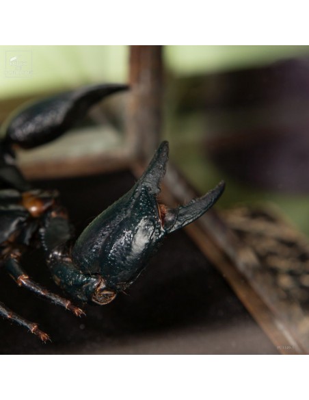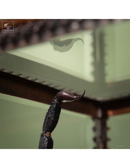 This scorpion that fills its beveled glass box well, is a Heterometrus laoticus, native to the tropical forests of Laos.