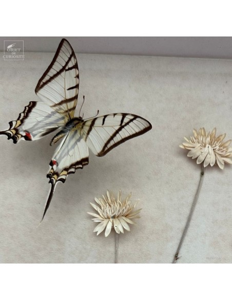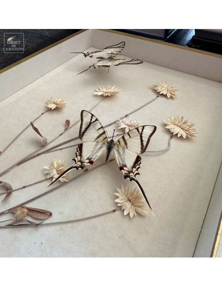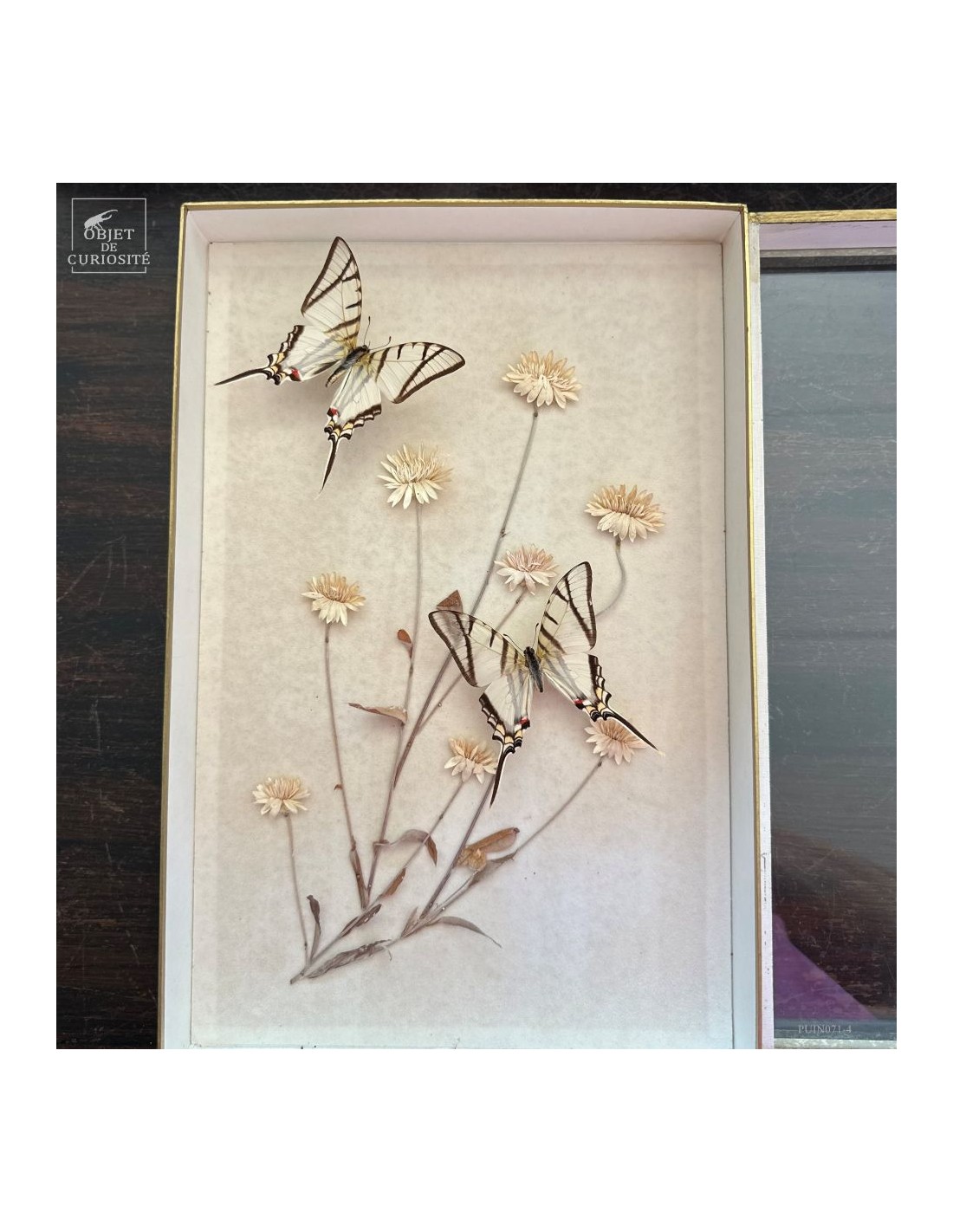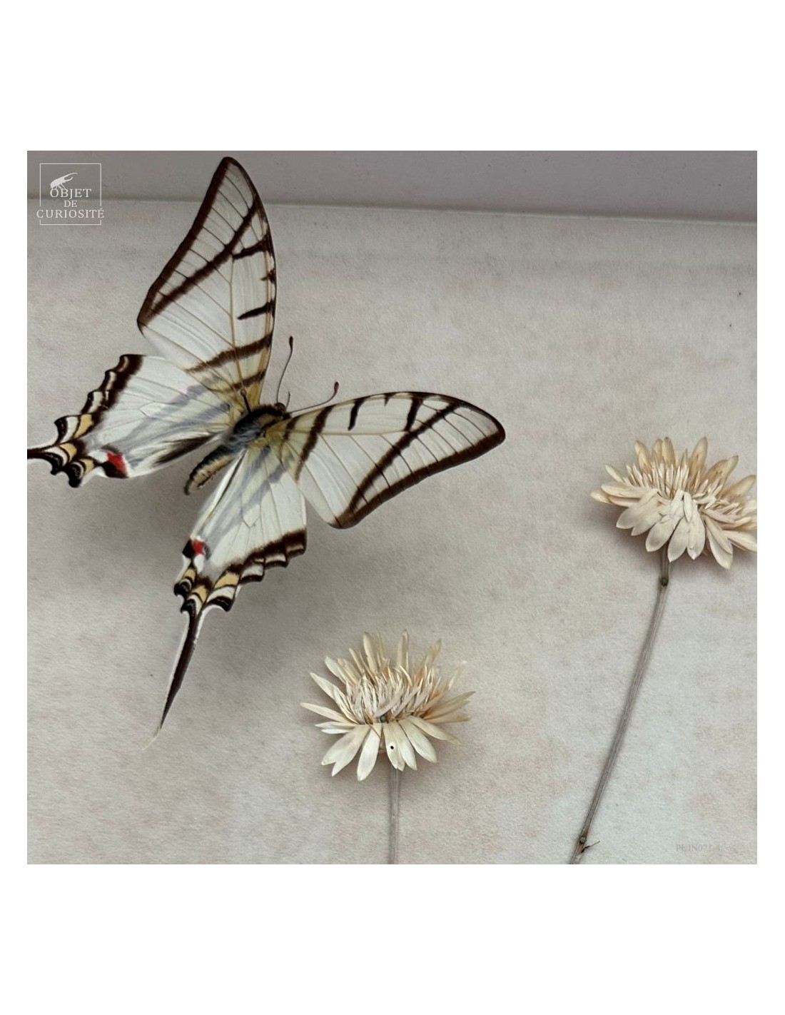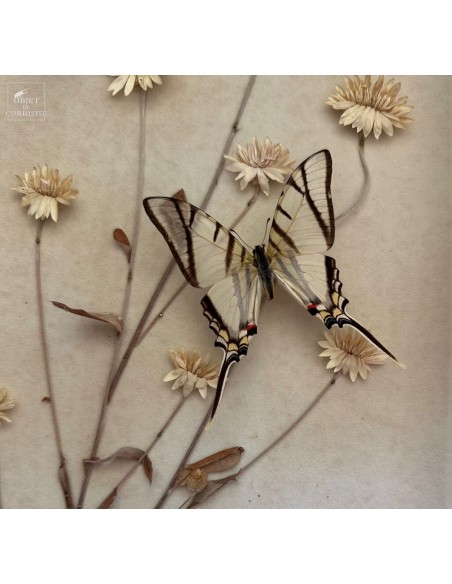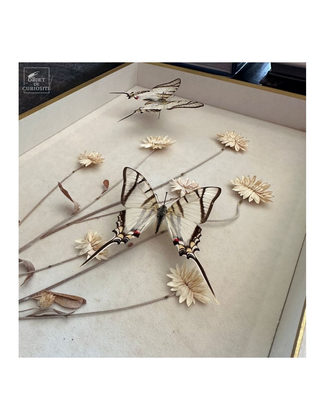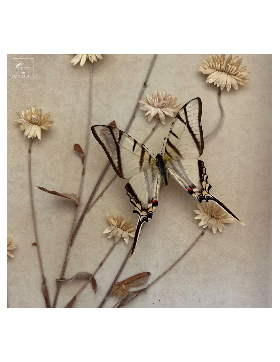 They are arranged on a genuine herbarium sheet, where immortelles (Helichrysum) have been pressed — Mediterranean plants that retain their shape and colour long after being picked. Once used to scent linens or compose everlasting bouquets, they still evoke memory and permanence.