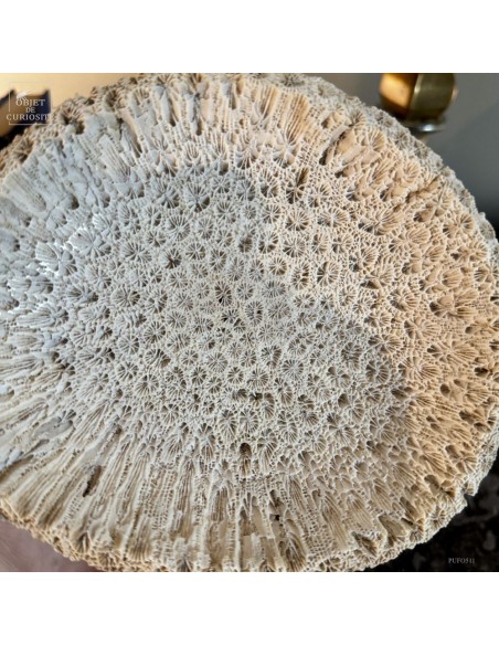 These perfectly regular white patterns are those of a coral fossil — a madreporarian coral close to the genus GALAXEA. Extracted in the southwest of Madagascar, this rare fossil comes from a land area that was once a seabed before the last glaciation. Collected on land, this fossilized coral is not subject to CITES.