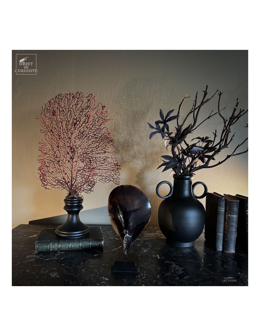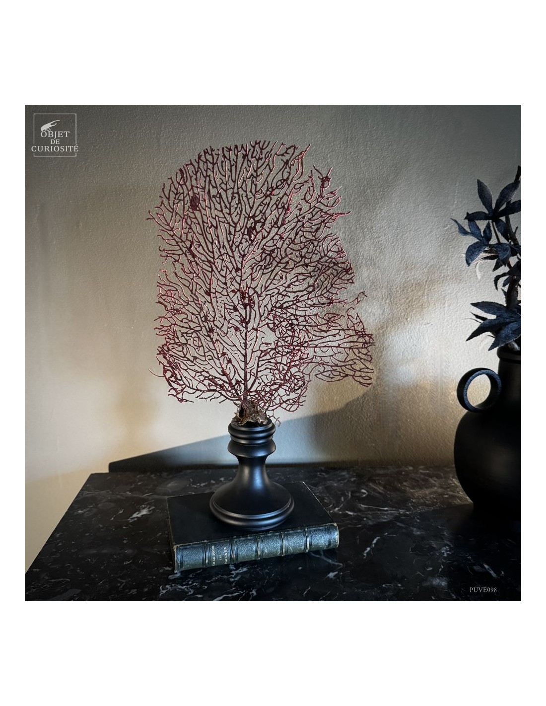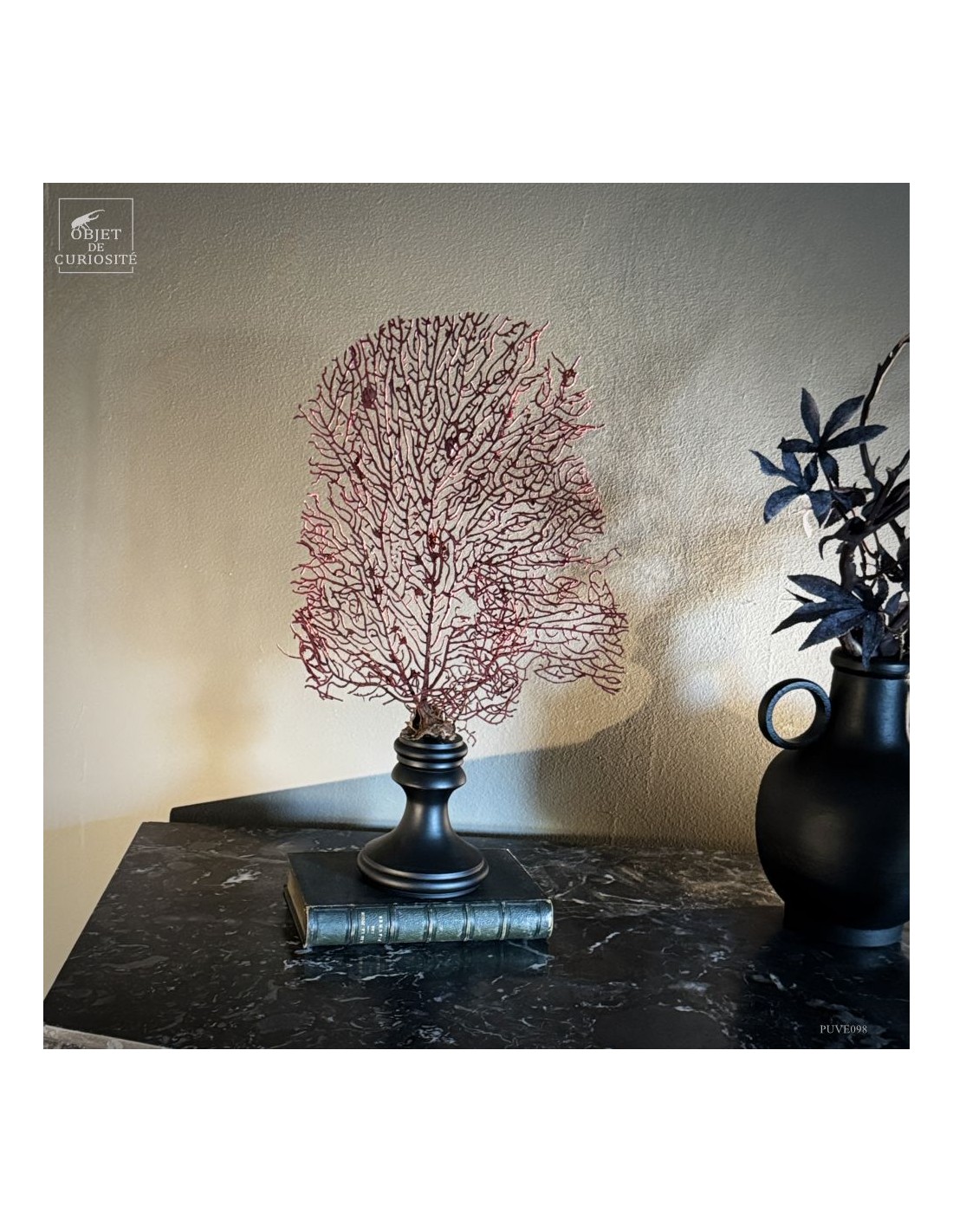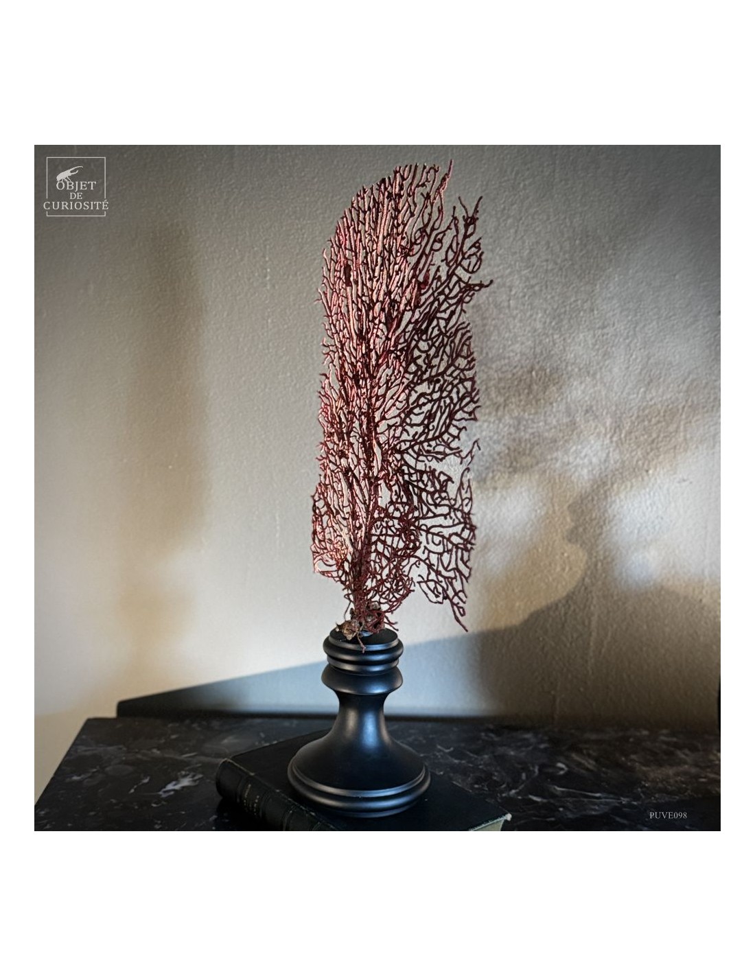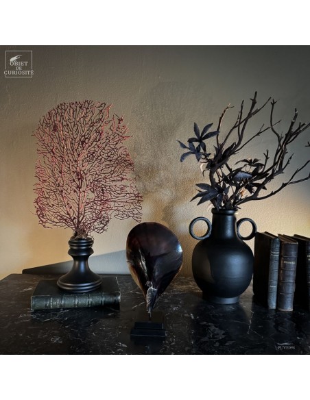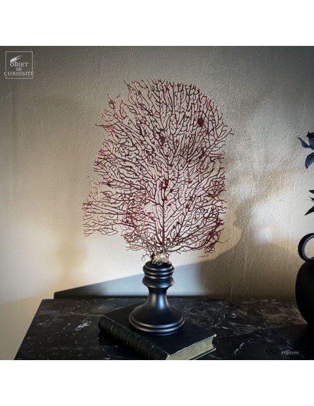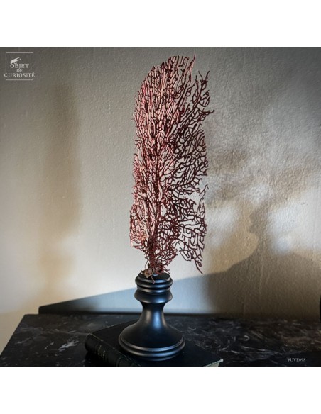 This specimen, with its deep natural red hue, is mounted on a black wooden base that highlights the organic refinement of this marine structure.