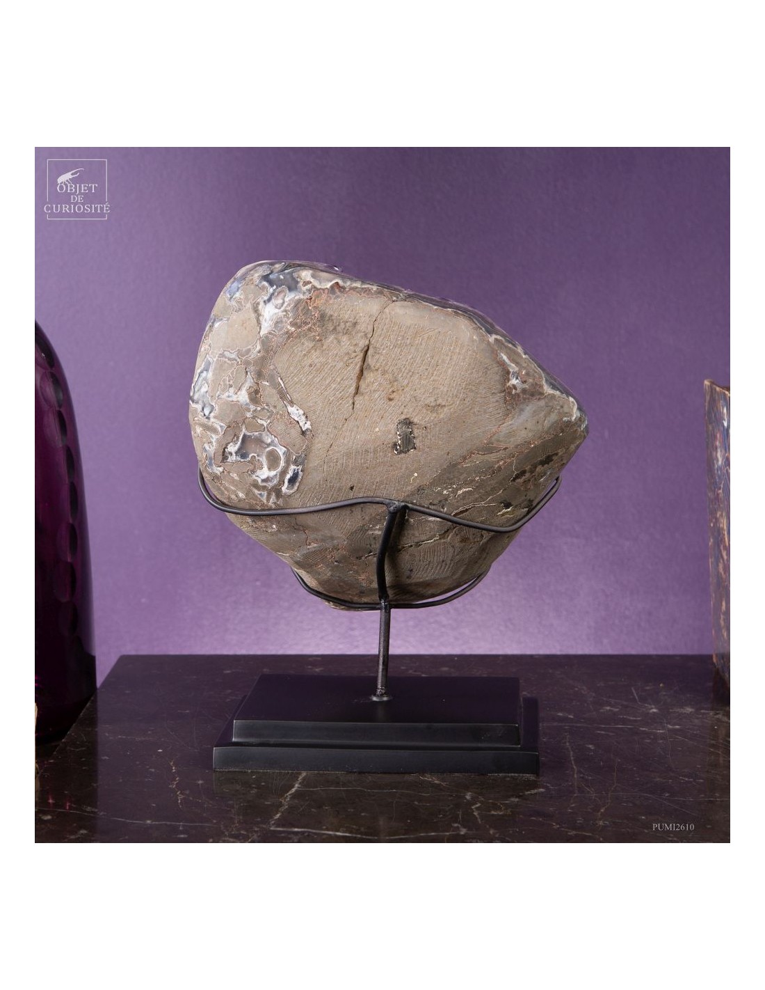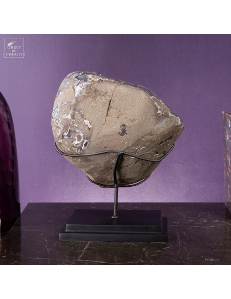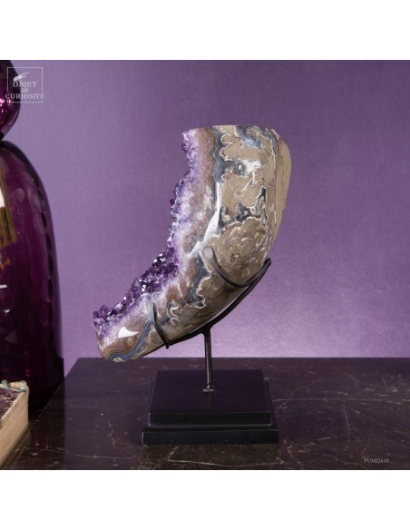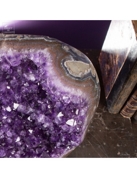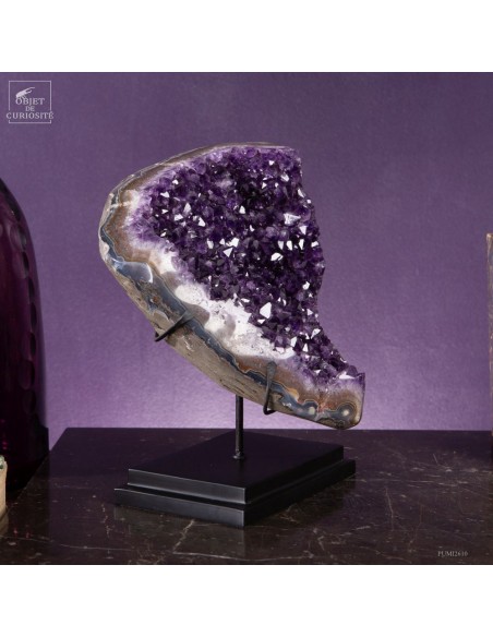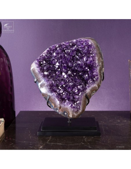 La gangue qui borde les cristaux a été polie, révélant des motifs caractéristiques de l’agate, souvent présente dans les géodes d’améthyste. Ce contraste entre la douceur polie de l’agate et l’éclat brut des cristaux rend cette pièce unique. Avec un poids de 5,3 kg, cette géode est montée sur une base noire qui met en valeur sa forme.