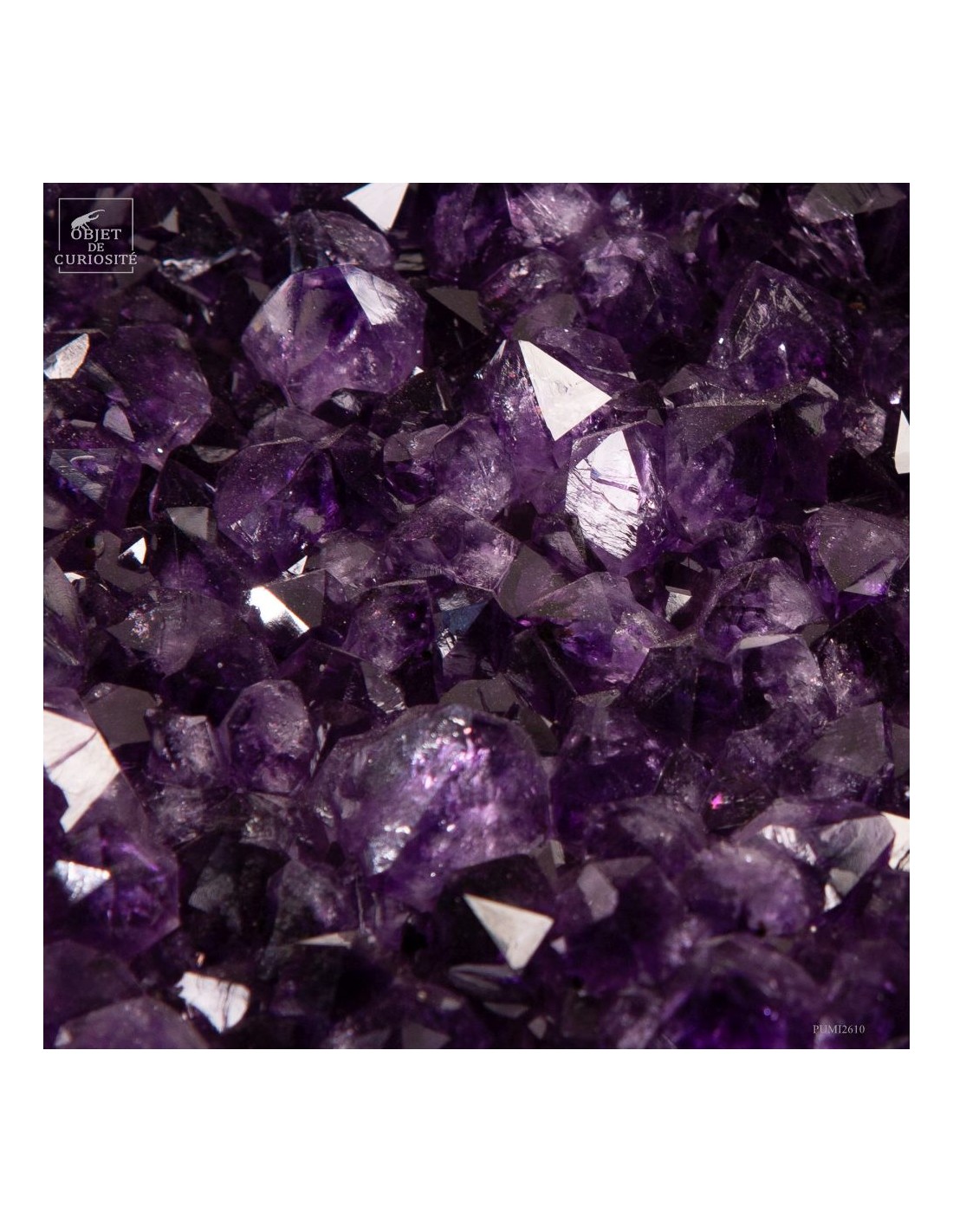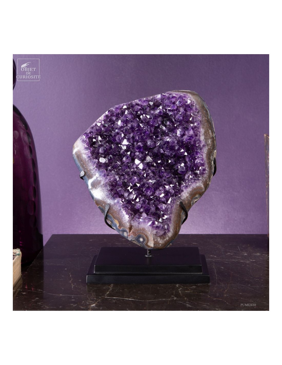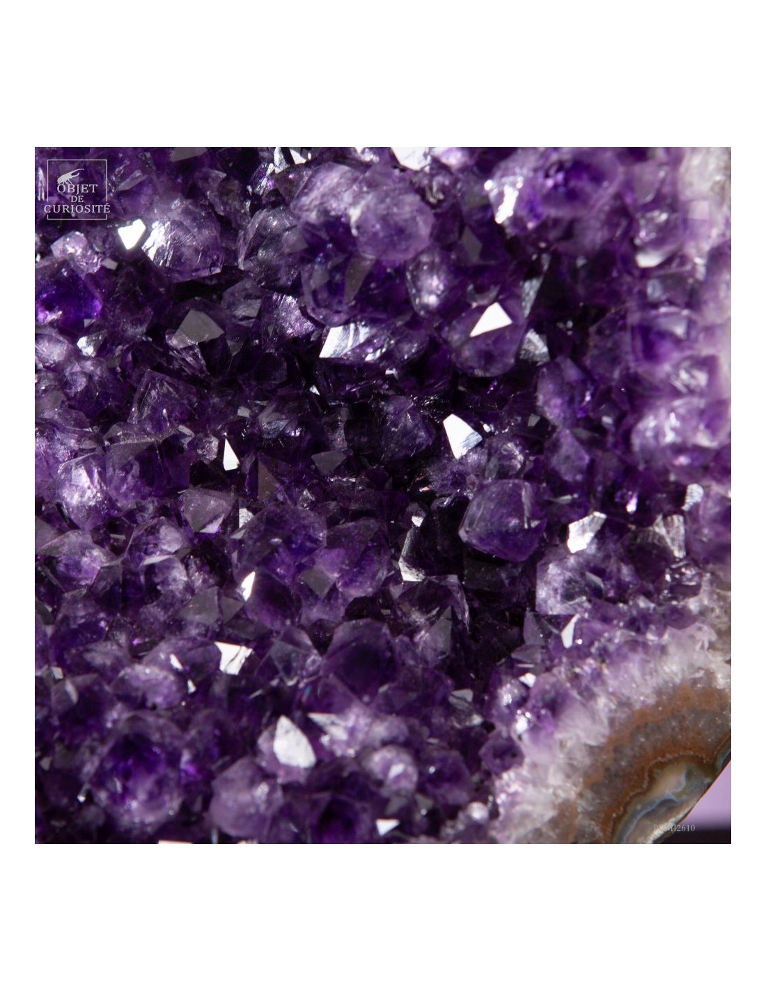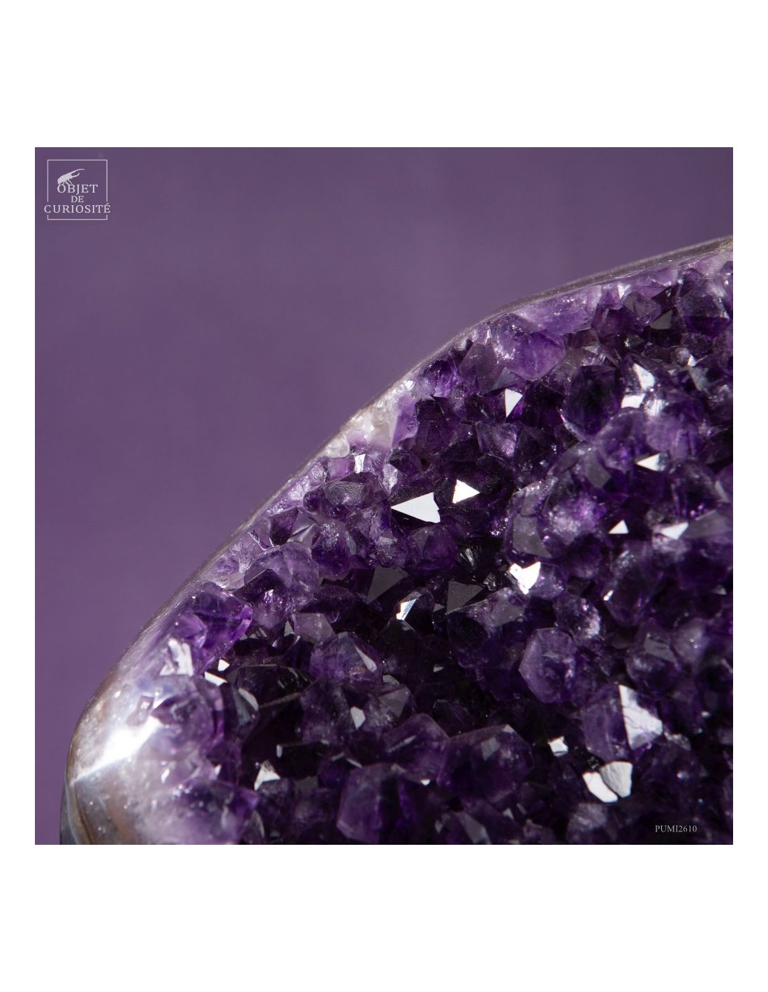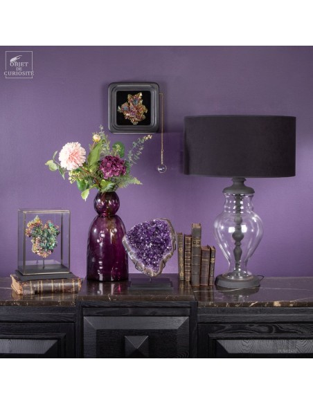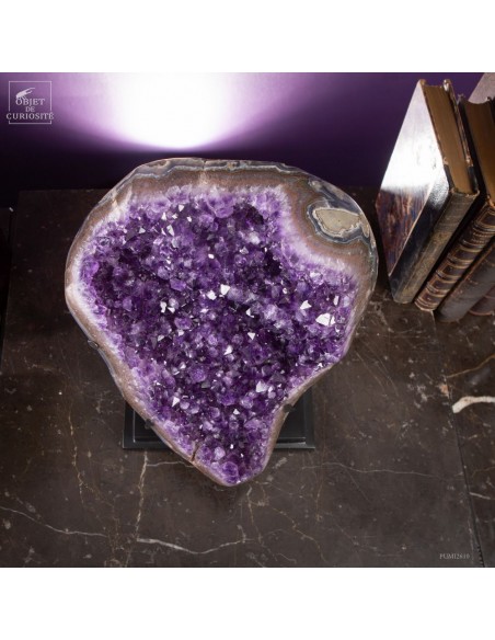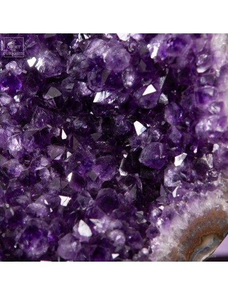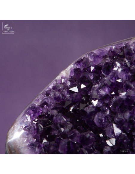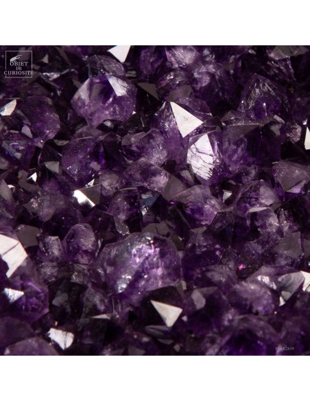 Ce spécimen d’améthyste provient des gisements de Minas Gerais, au Brésil, une région mondialement connue pour ses géodes d’exception. Ses cristaux, d’un violet profond ont une qualité que l'on rencontre peu au Brésil. Ils se sont formés au cours de millions d’années dans des cavités volcaniques où des solutions riches en silice ont cristallisé lentement.