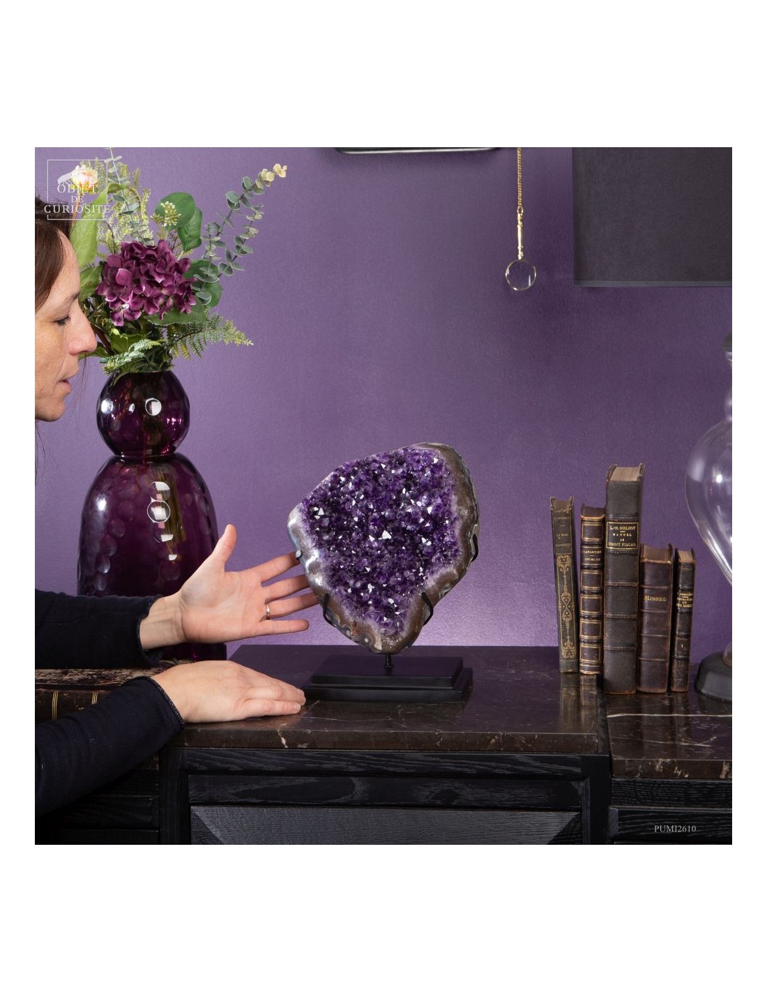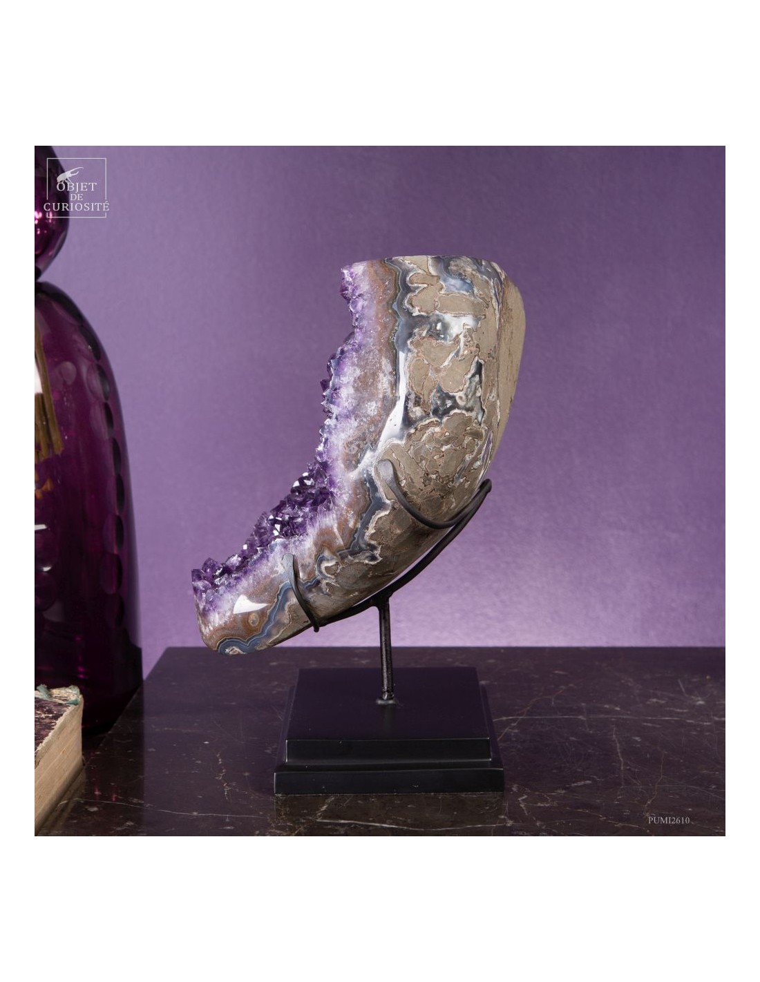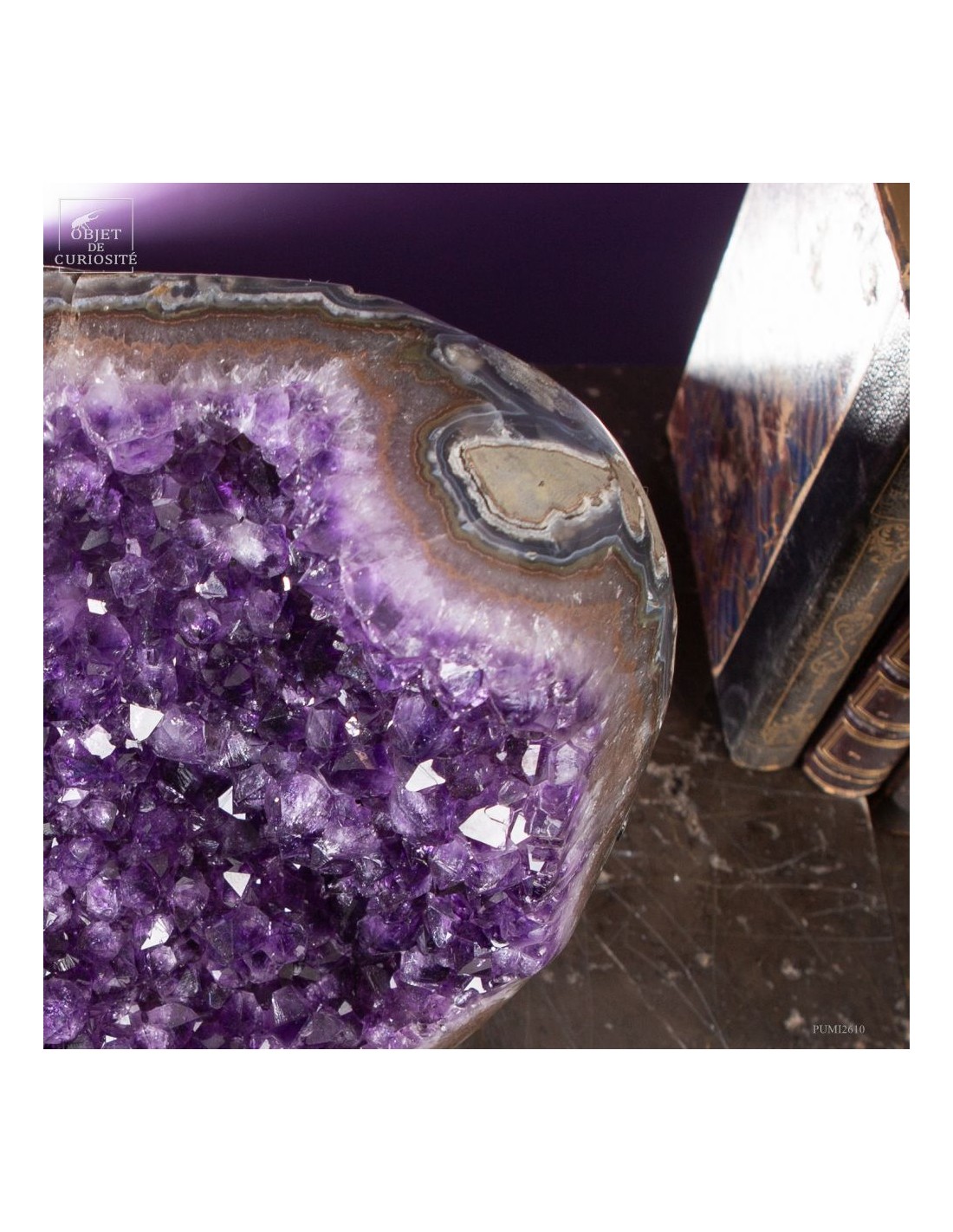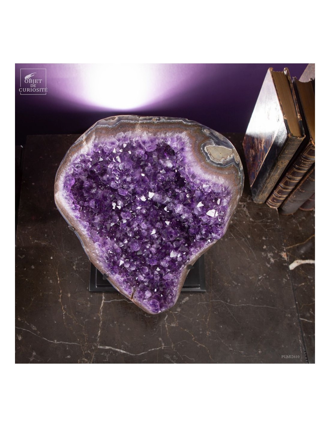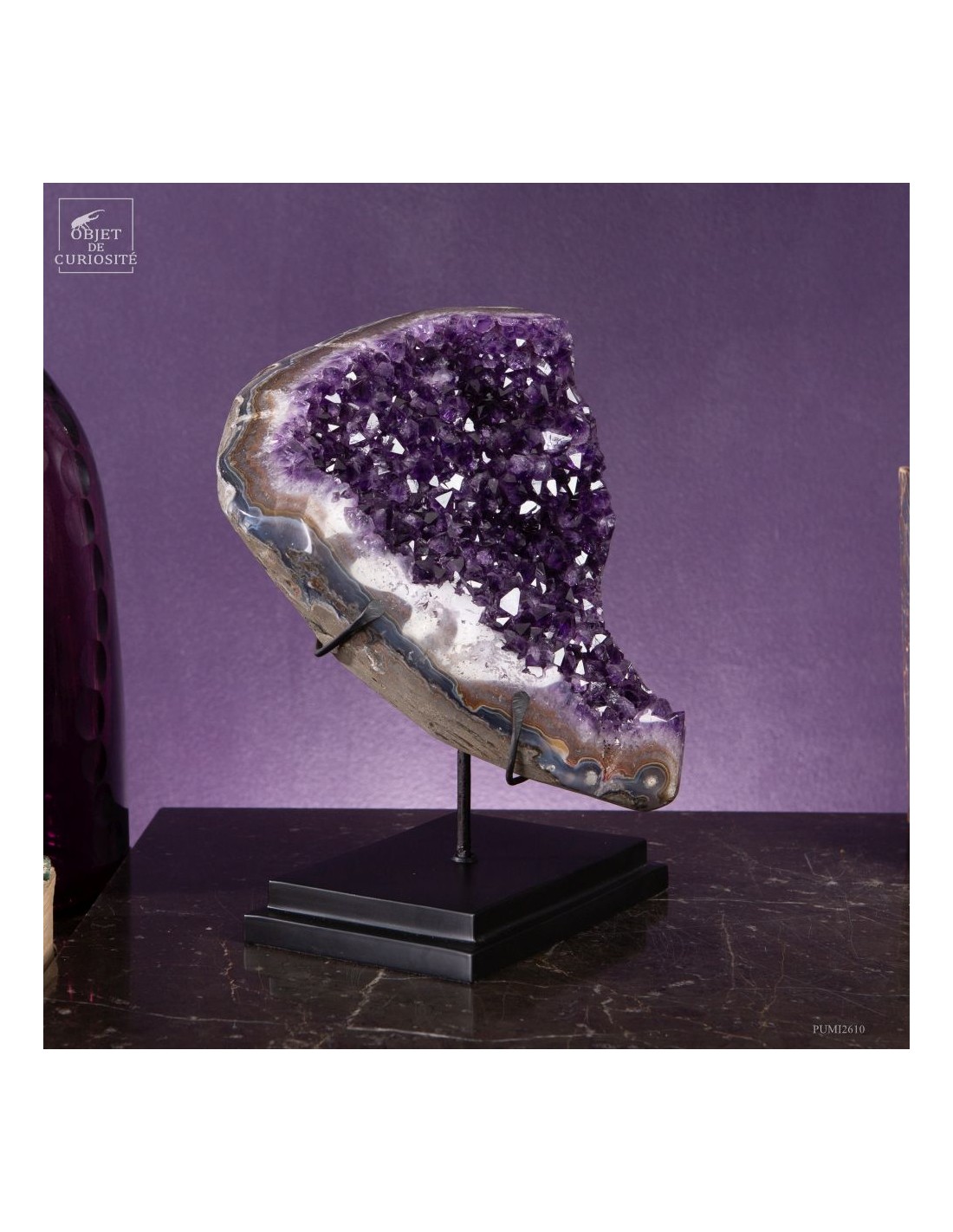 Ce spécimen d’améthyste provient des gisements de Minas Gerais, au Brésil, une région mondialement connue pour ses géodes d’exception. Ses cristaux, d’un violet profond ont une qualité que l'on rencontre peu au Brésil. Ils se sont formés au cours de millions d’années dans des cavités volcaniques où des solutions riches en silice ont cristallisé lentement.