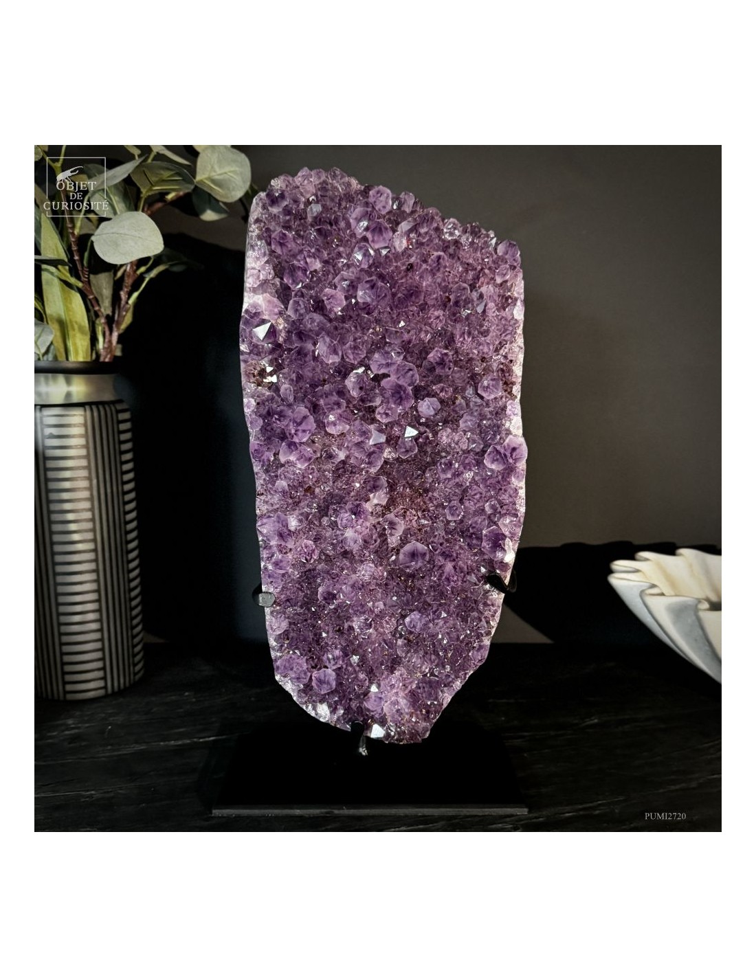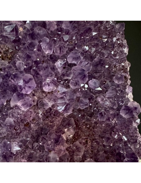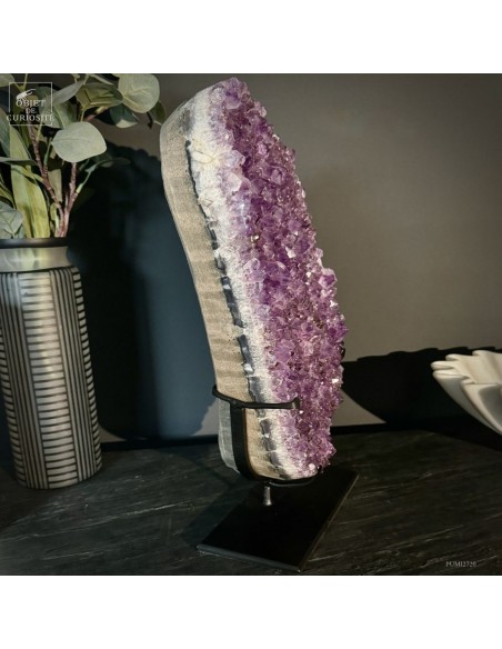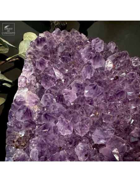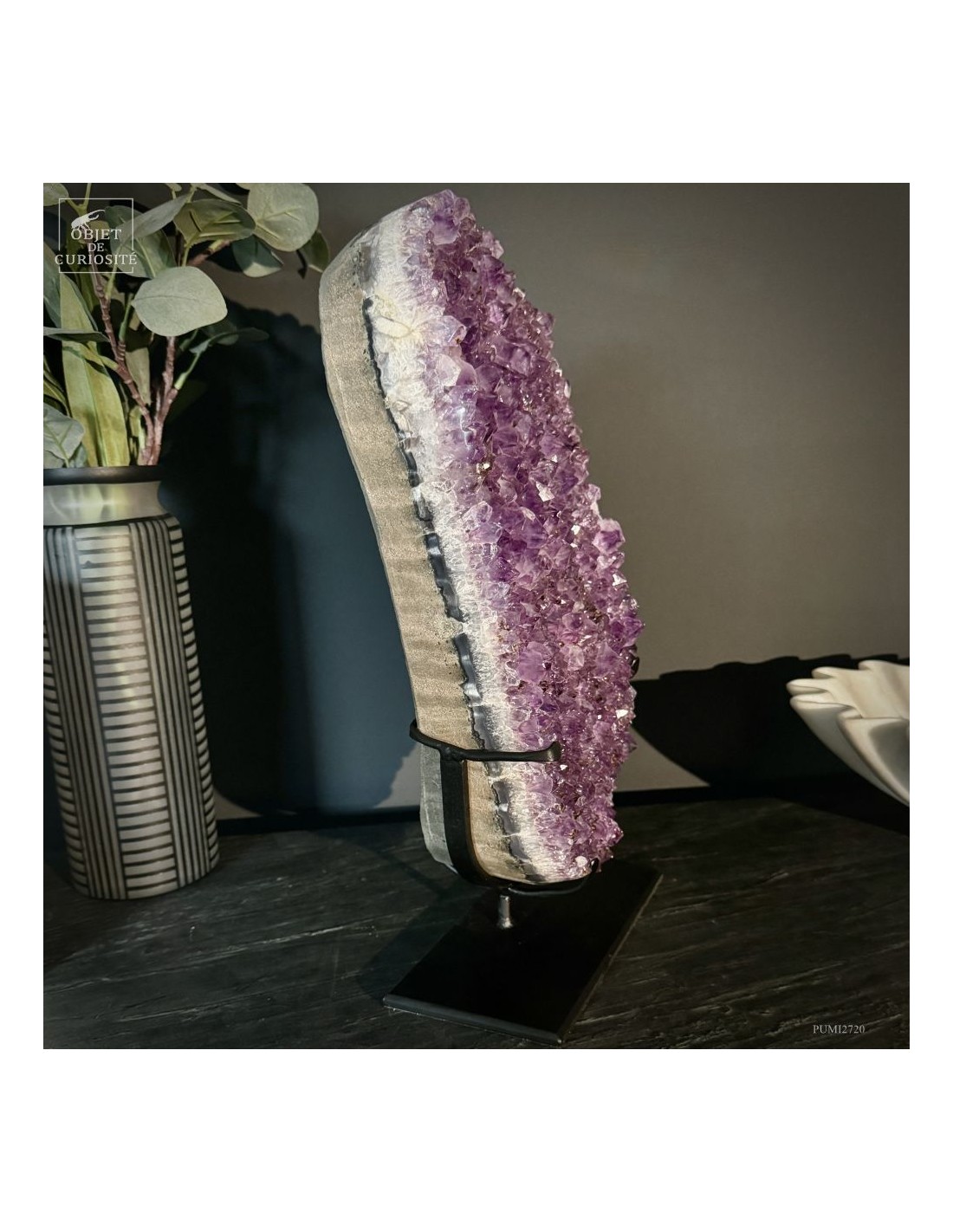 Cette plaque d’améthyste provient du Rio Grande do Sul, au sud du Brésil, où les anciennes coulées de basalte du Crétacé ont piégé des bulles de gaz ensuite cristallisées en quartz violet. En coupant ces géodes, on obtient ces sections plates, entièrement tapissées de cristaux brillants.