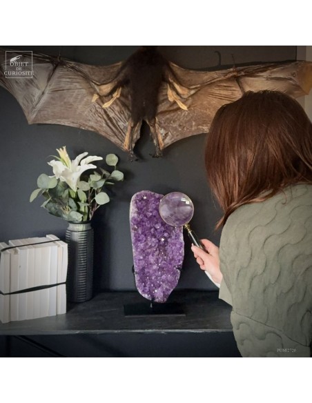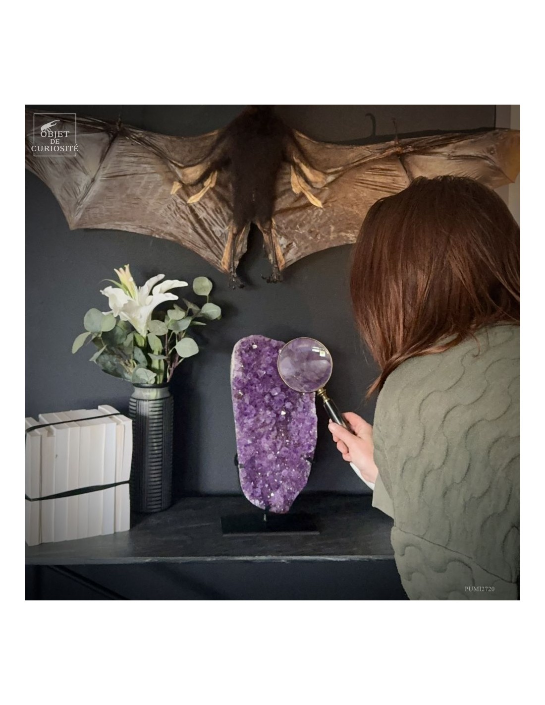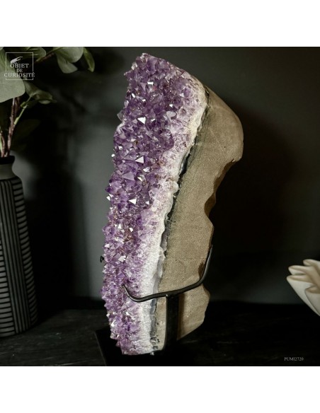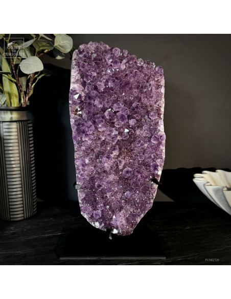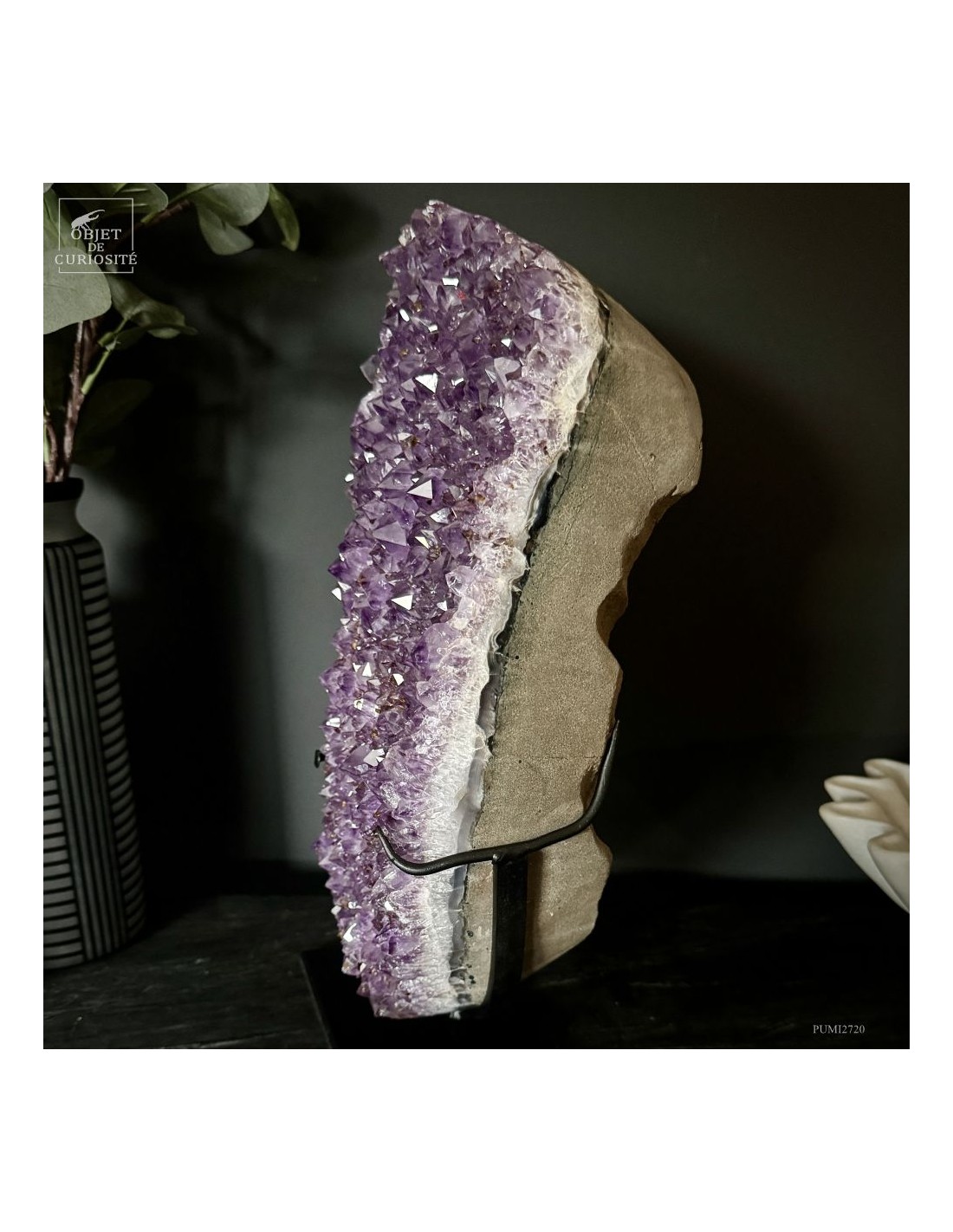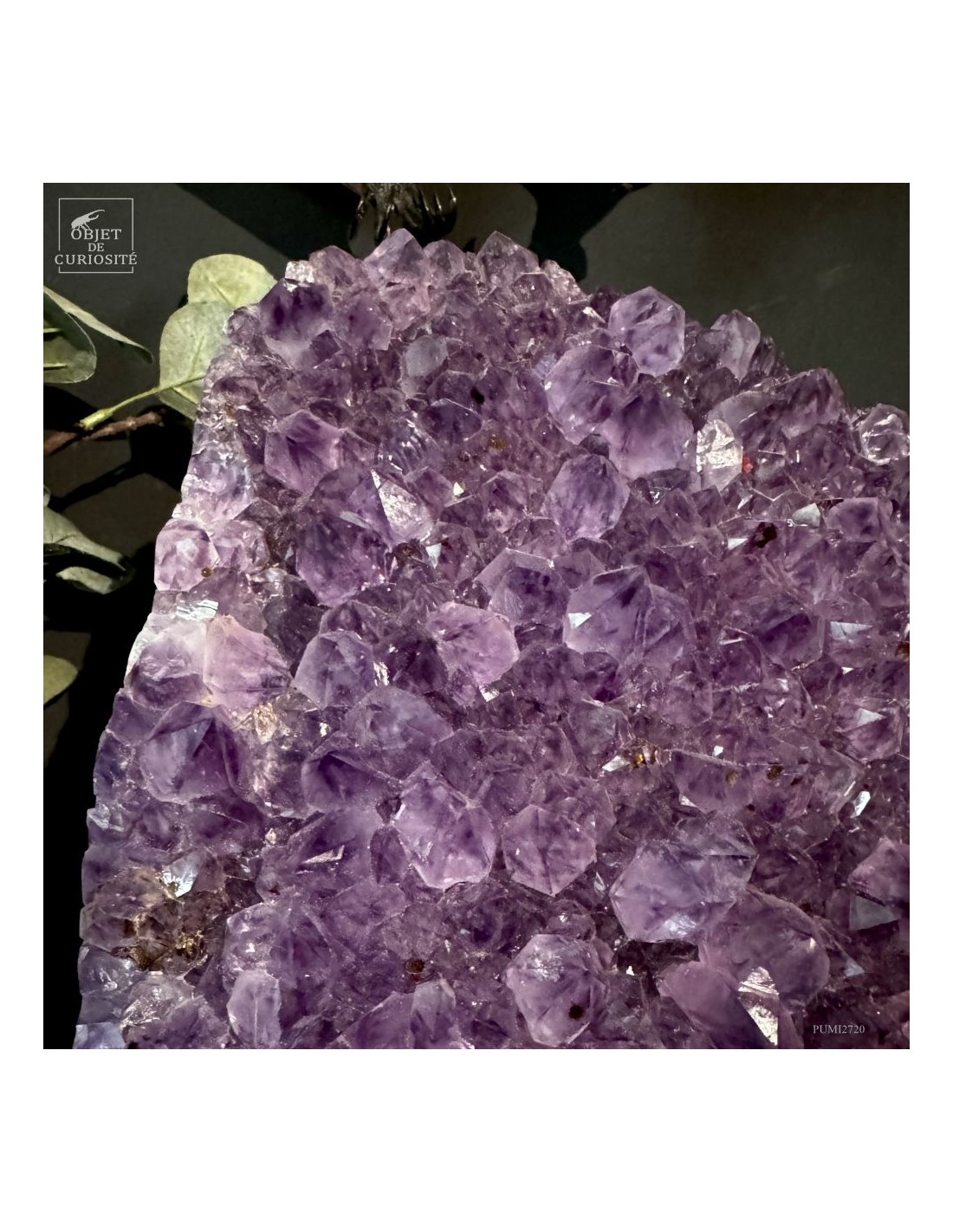 Cette plaque d’améthyste provient du Rio Grande do Sul, au sud du Brésil, où les anciennes coulées de basalte du Crétacé ont piégé des bulles de gaz ensuite cristallisées en quartz violet. En coupant ces géodes, on obtient ces sections plates, entièrement tapissées de cristaux brillants.