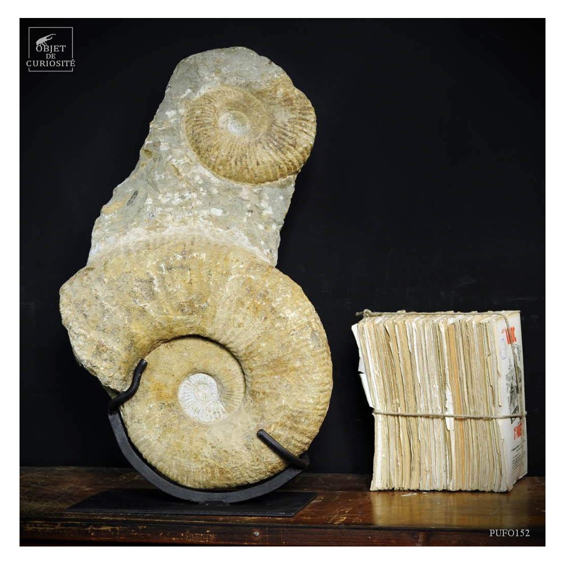 Cette sculpture entièrement naturelle est une véritablement photographie d'un fond marin du sud de l'Atlas, au Maroc. Une région prospère en fossiles où les carrières nous permettent de fouiller à des profondeurs différentes et donc d'explorer des périodes différentes. Ici nous avons deux spécimens d'ammonites de près de 180 millions d'années. Lors du dégagement, elles ont été maintenues telles qu'elles ont été découvertes.