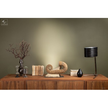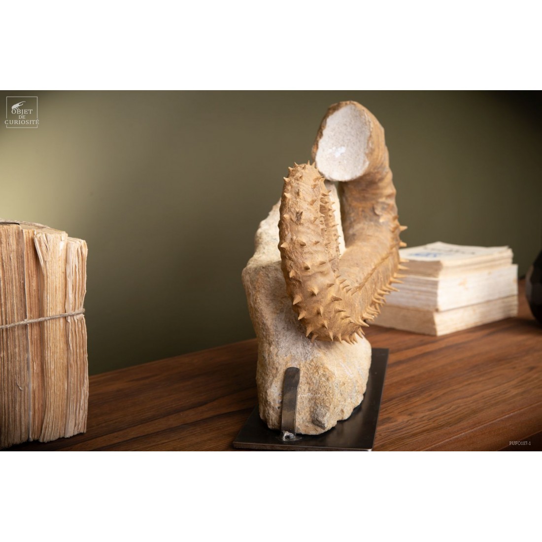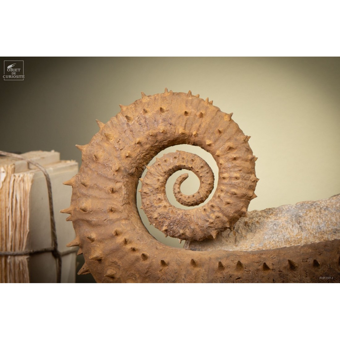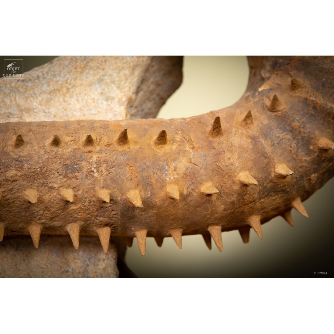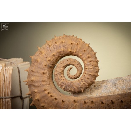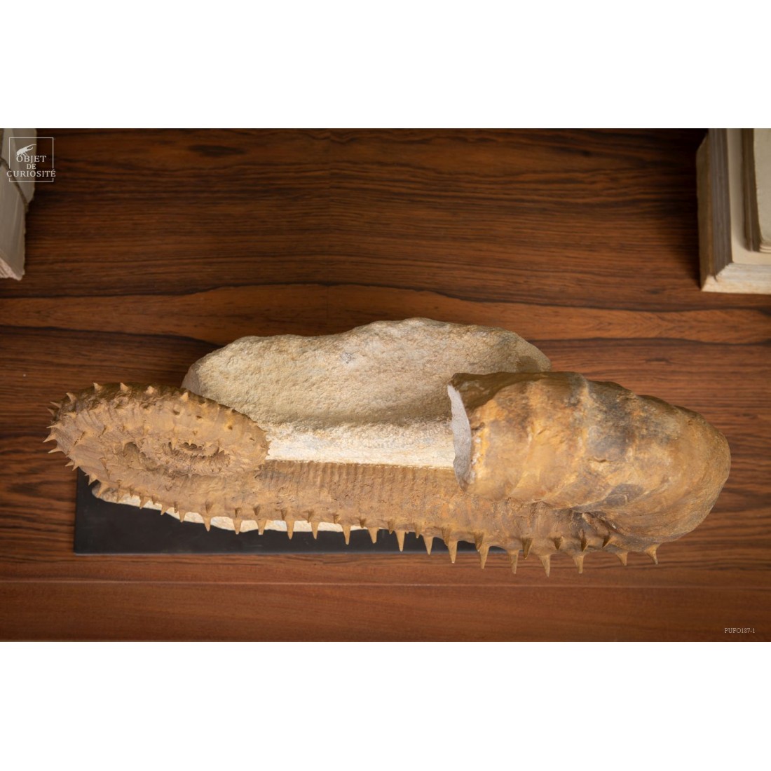 Ammonite Ancyloceras (130-125Ma, crétacé inférieur). Dégagée remarquablement du sud atlas marocain, un travail de restauration très minutieux a été fait sur les pics. Le déroulement des ammonites, longtemps considéré comme une dégénérescence évolutive, est actuellement pressenti plus comme une réponse adaptative (dans la forme ou la taille des ammonites) face aux modifications des écosystèmes marins (augmentation de la température des océans). Ce spécimen unique constitue le dernier stade d'évolution des ammonites avant leur disparition de la terre.
