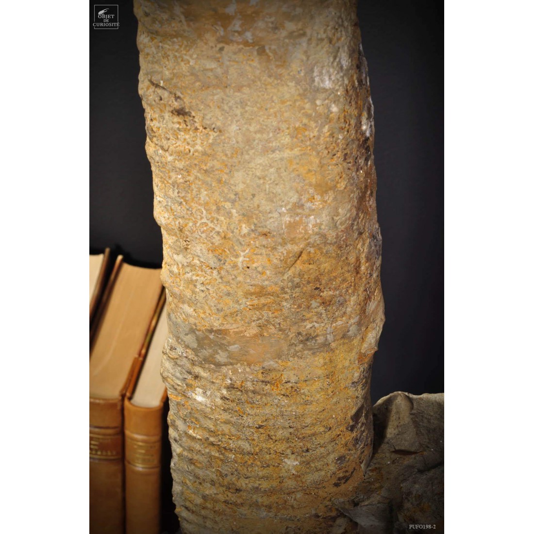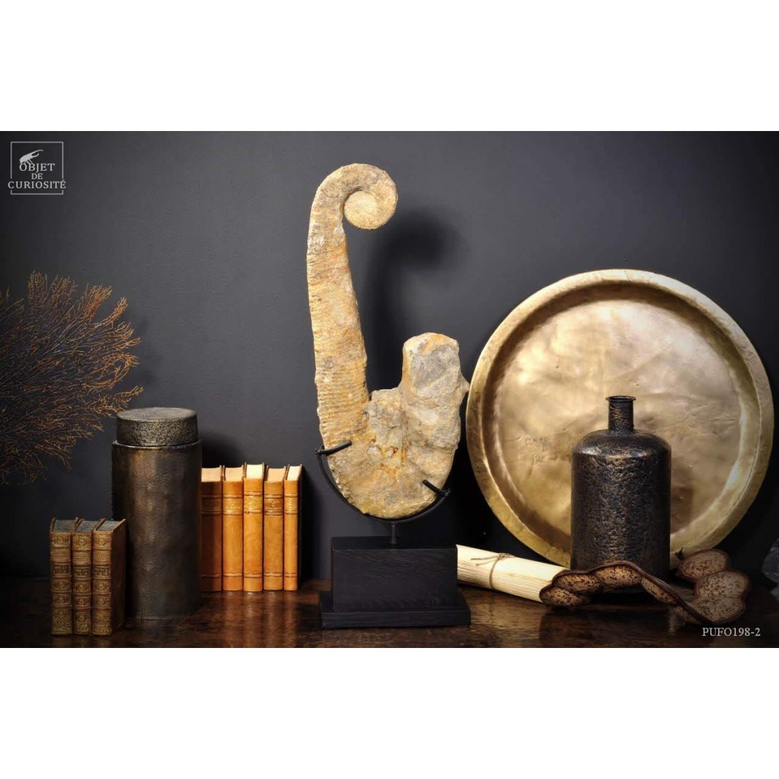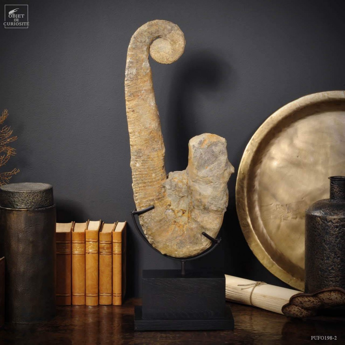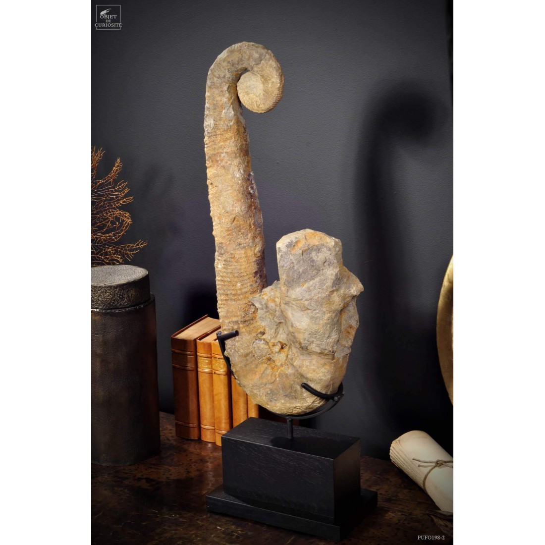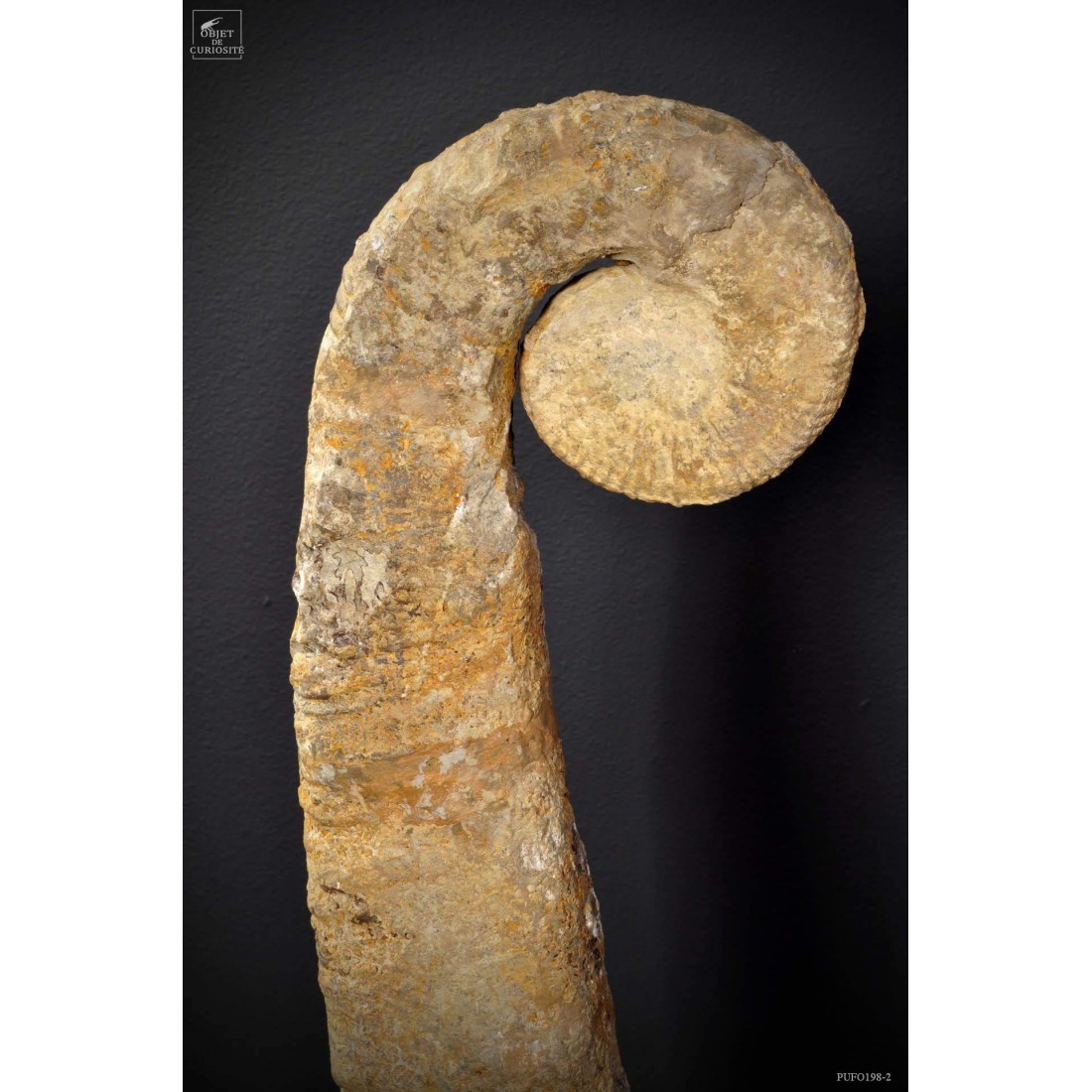 Dans le monde des fossiles, les ammonites occupent certainement une place prépondérante. Pourtant, au sein de ce gigantesque ensemble, les déroulées (ou hétéromorphes) occupent une place toute particulière. Le déroulement des ammonites, longtemps considéré comme une dégénérescence évolutive, est actuellement pressenti plus comme une réponse adaptative (dans la forme ou la taille des ammonites) face aux modifications des écosystèmes marins (augmentation de la température des océans). Ce spécimen vient du Maroc et date de la fin du crétacé soit environ 70 millions d'années. Socle rectangulaire en Chêne noir.