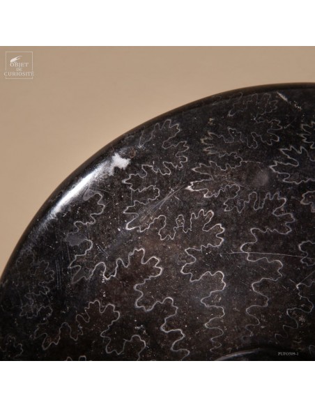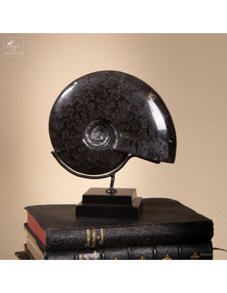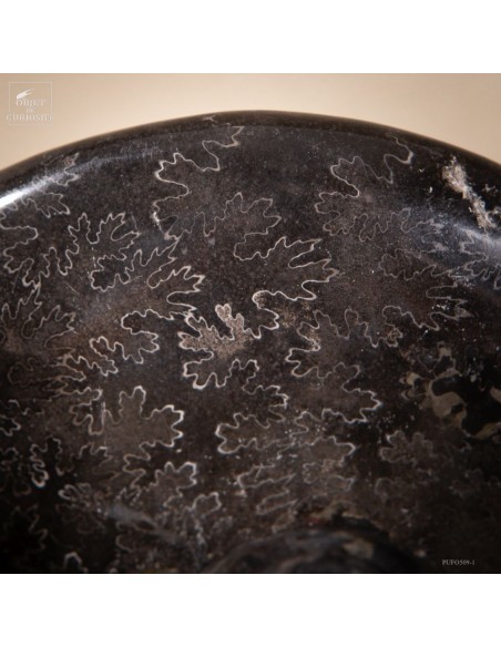 Le polissage révèle ici les lignes de sutures de la coquille, motif presque végétal qui se trouve juste sous la couche de nacre. Un fossile rare, à la croisée de la paléontologie et de la minéralogie, qui impose aujourd'hui une esthétique sobre mais très forte. Nous avons 4 tailles découvertes en 2025. C'est la plus petite.