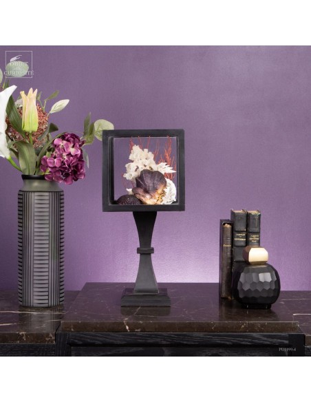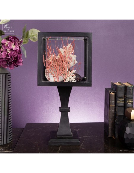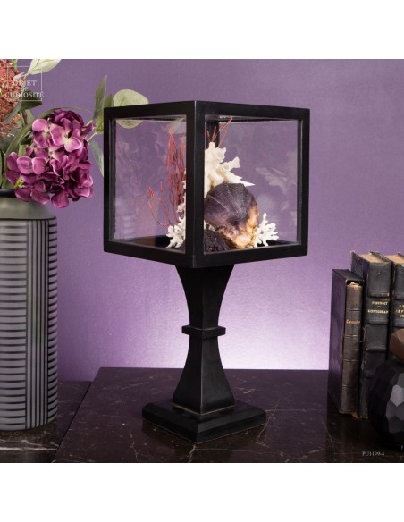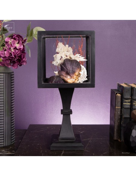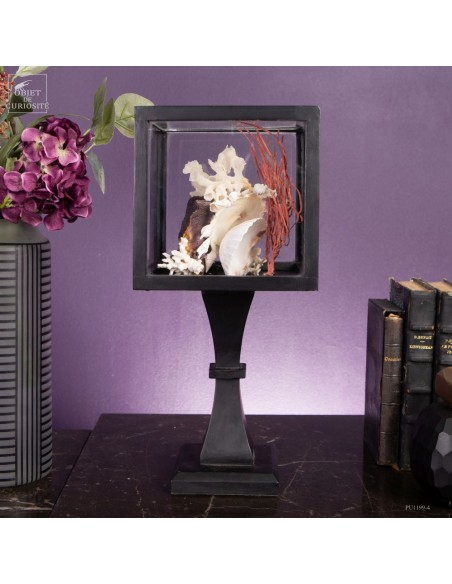 Dans un cube en verre monté sur un pied en bois noir, Cette présentation met en valeur la diversité des formes et des matières, assemblées avec soin pour évoquer l’univers marin dans toute sa complexité. Une Stellaria solaris d’Indonésie, avec ses pics caractéristiques, occupe une place centrale. Elle est accompagnée d’un bryozoaire blanc, dont les formes rappellent un réseau corallien, et d’une Xénophora des îles Visayas, associée à un squelette d’éponge qui enrichit la texture de l’ensemble.