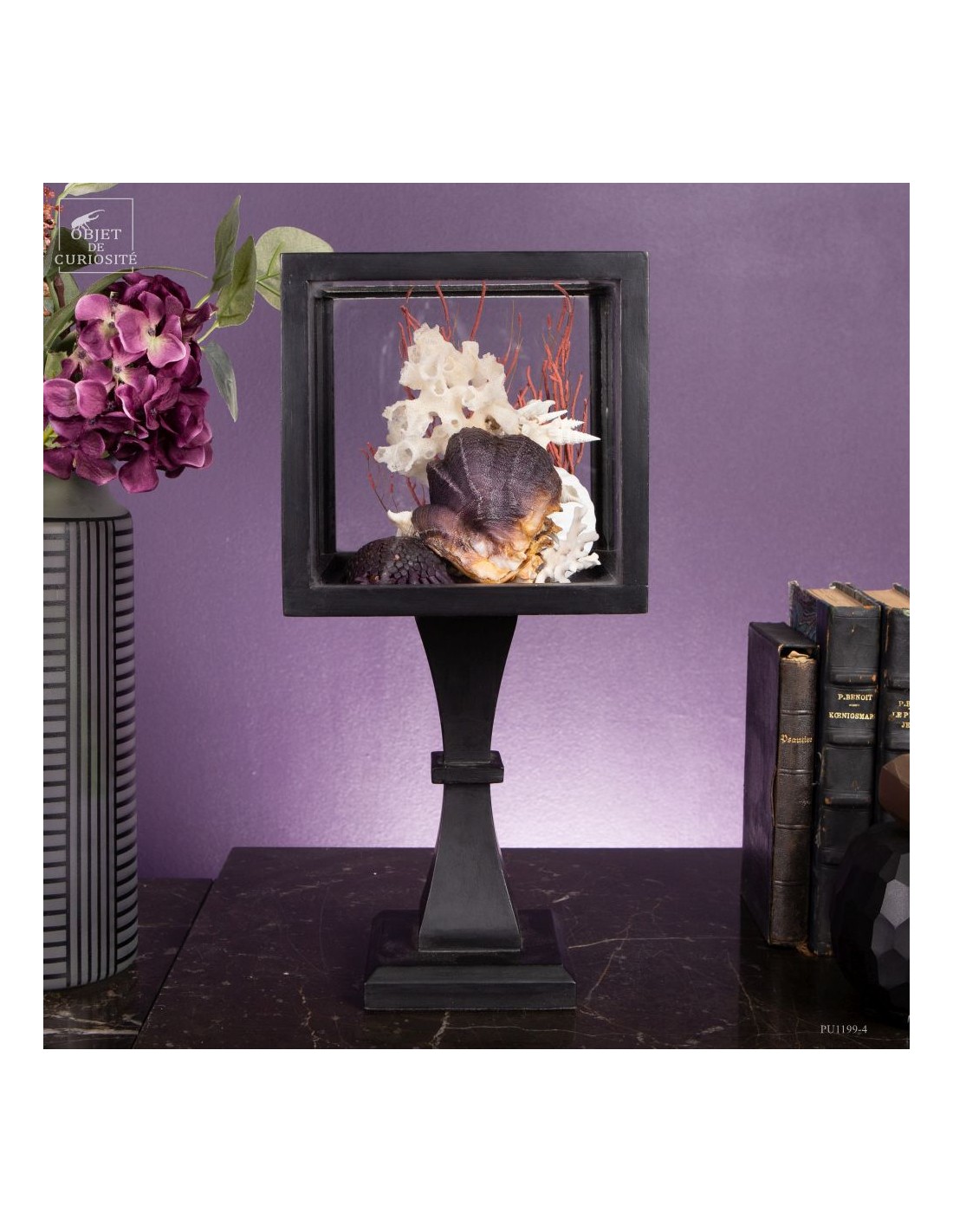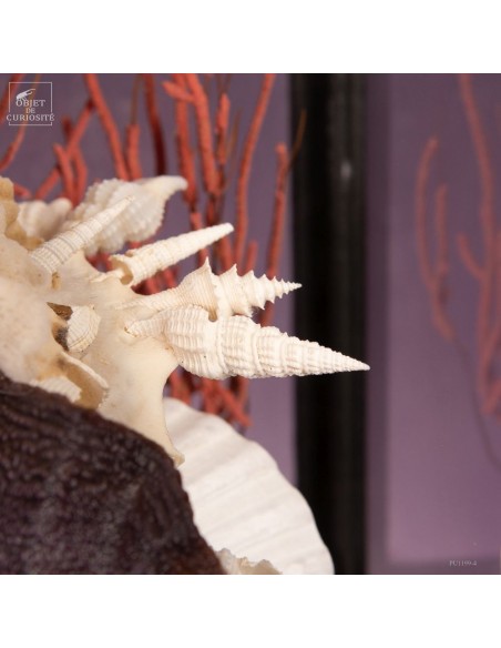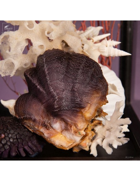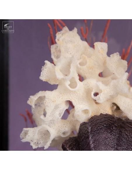 Un oursin violet Colobocentrotus, discret mais texturé, dialogue avec une Lopha cristagalli, ou huître violette, identifiable à ses stries bien marquées. Une petite gorgone complète la composition en apportant une structure fine et ramifiée.