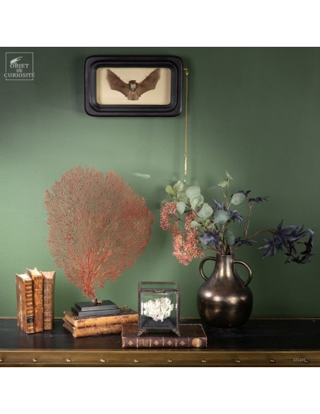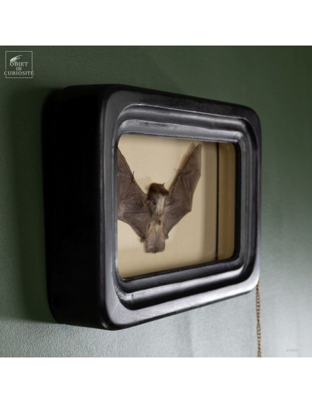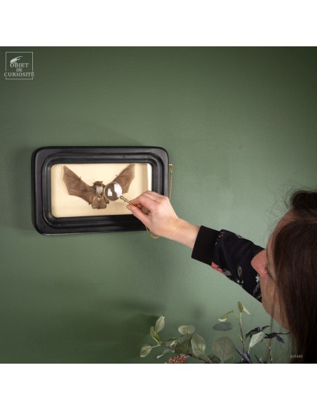 La chauve-souris laineuse à ailes claires est intéressante à découvrir des 2 côtés, pour cette raison nous l'avons présentée dans un reliquaire à verres bombés. La Kerivoula Pellucida est une chauve-souris que l'on rencontre en Indonésie, Malaisie et Philippines. Elle passe ses journées dans la canopée des forêts primaires. Celle-ci a été collectée en Avril 2023 dans l'Est de Java. Ses ailes claires sont assez uniques et permettent une identification aisée, avec son ventre à la fourrure blanche. Elle est active la nuit et attrape des insectes au vol, Grace à son sonar d'écho-location. Les oreilles sont assez petites, et la "voile" entre ses pattes arrières est plutôt courte, la faisant ressembler à un "wingsuite".