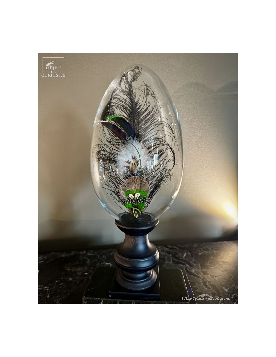 Chaque assemblage marie textures, formes et couleurs avec une précision presque entomologique. Dans ce cas, une plume d'autruche noire encadre une composition de plumes d'émeu (sortes de poils gris) et de pintade sur fond d'amazone vert