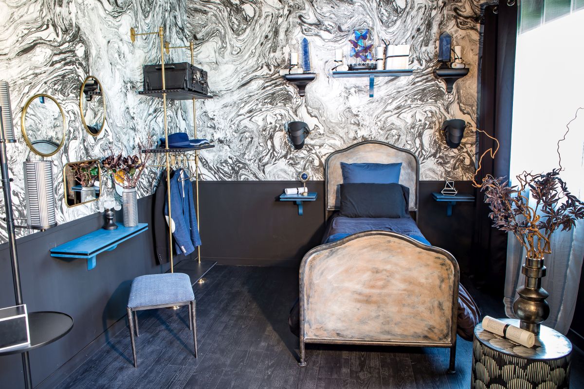 Presque Noir et Blanche, cette chambre est traversées par les éclats bleus outremer des consoles, des papillons d’Amérique du Sud et du cristal bleu de Bahia.