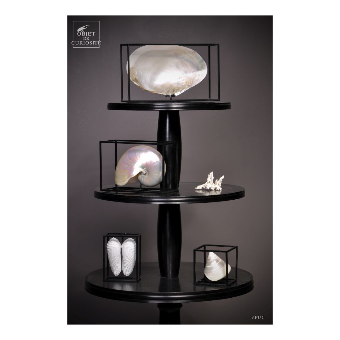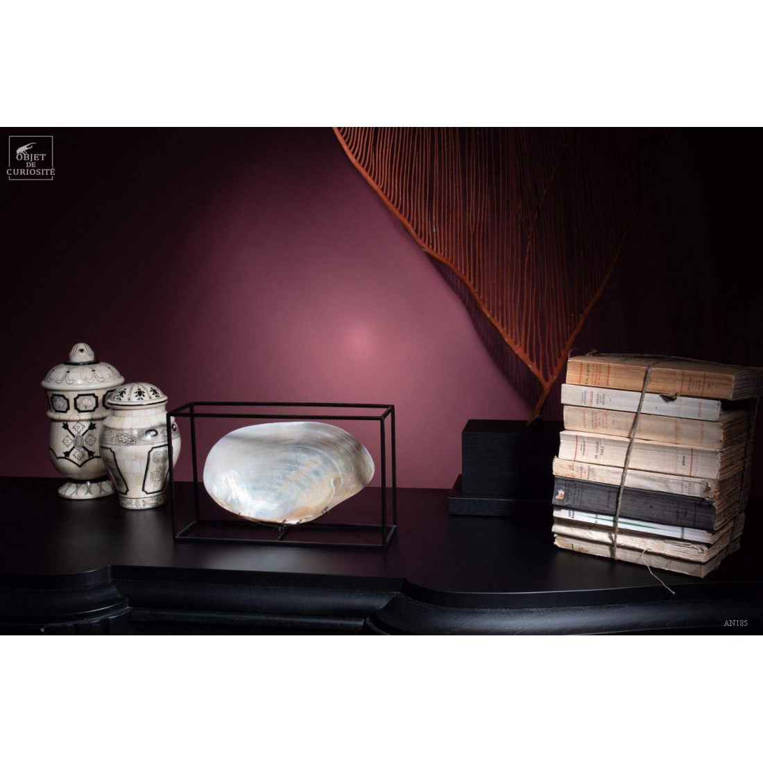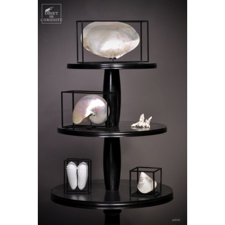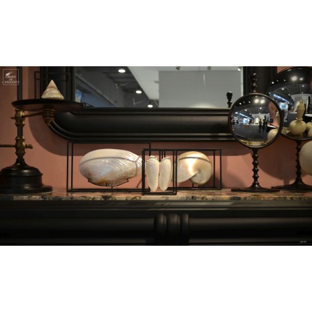Moules blanche de Cebu. Cette énorme bivalve d'eau douce présente une belle surface légèrement nacré lorsqu'elle est polie. Nous l'avons encadrée en 3 dimensions dans une cage de fer noir. Un esprit plus contemporain pour cette curiosité naturelle. Elle est parfaite avec d'autres curiosités contemporaines: AN187 ou AN243.