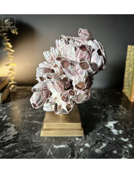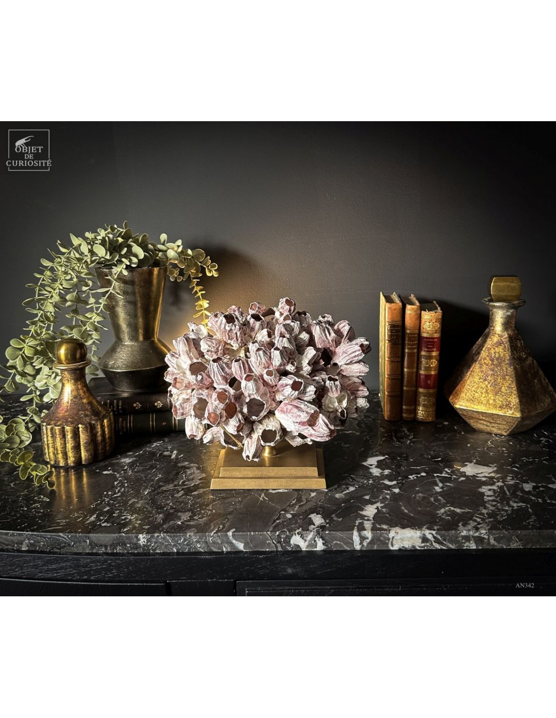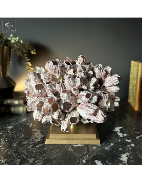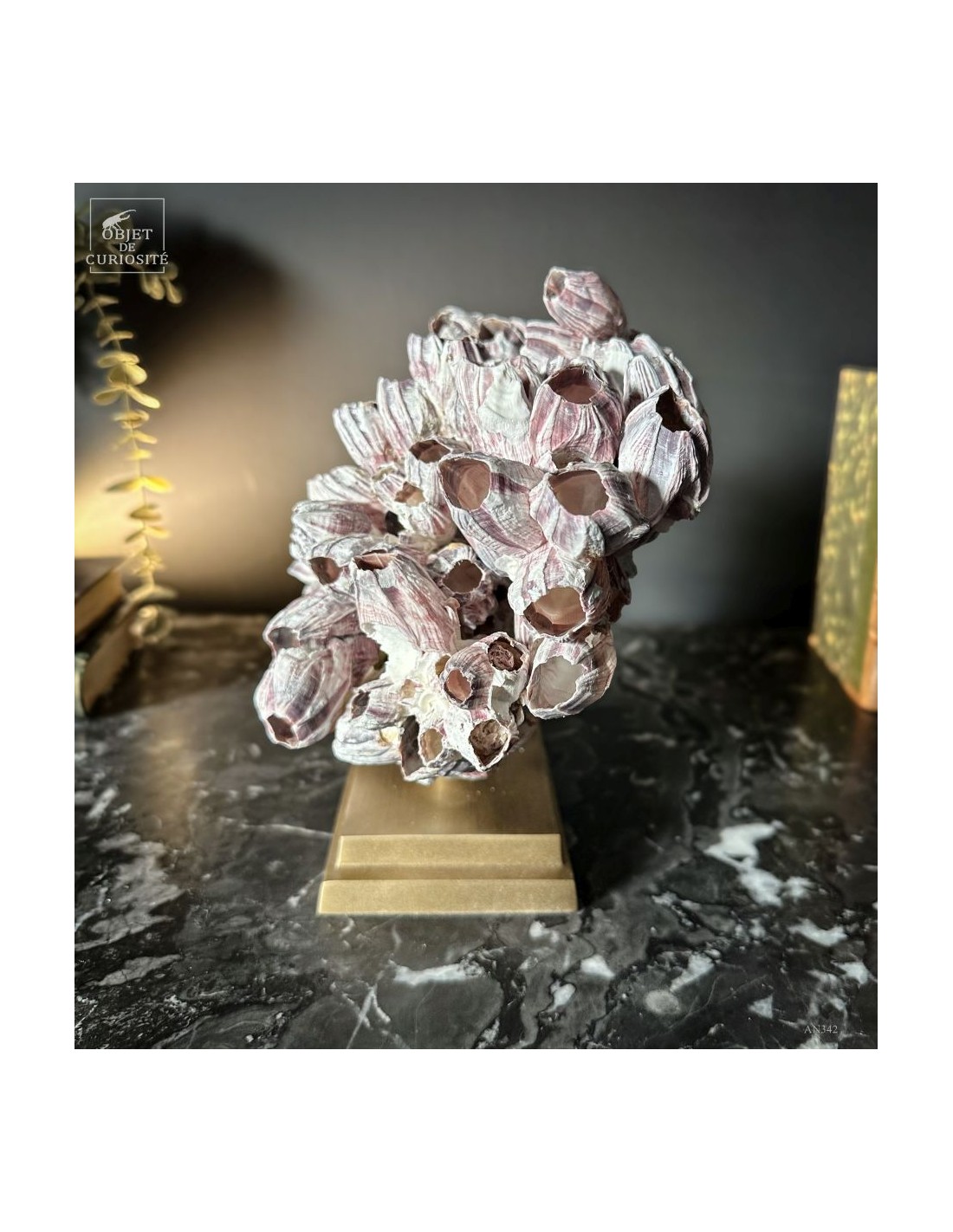 Présentée sur une simple base en laiton, cette colonie figée évoque une petite architecture marine, à la fois fragile et sculpturale.