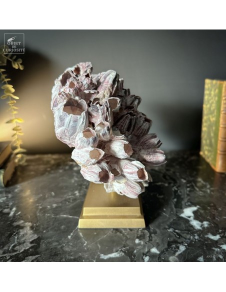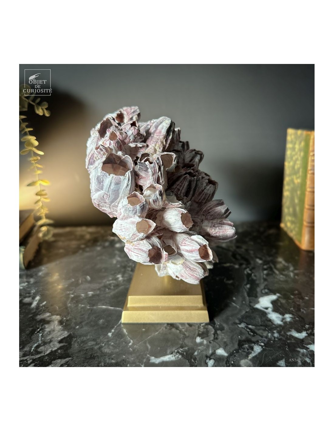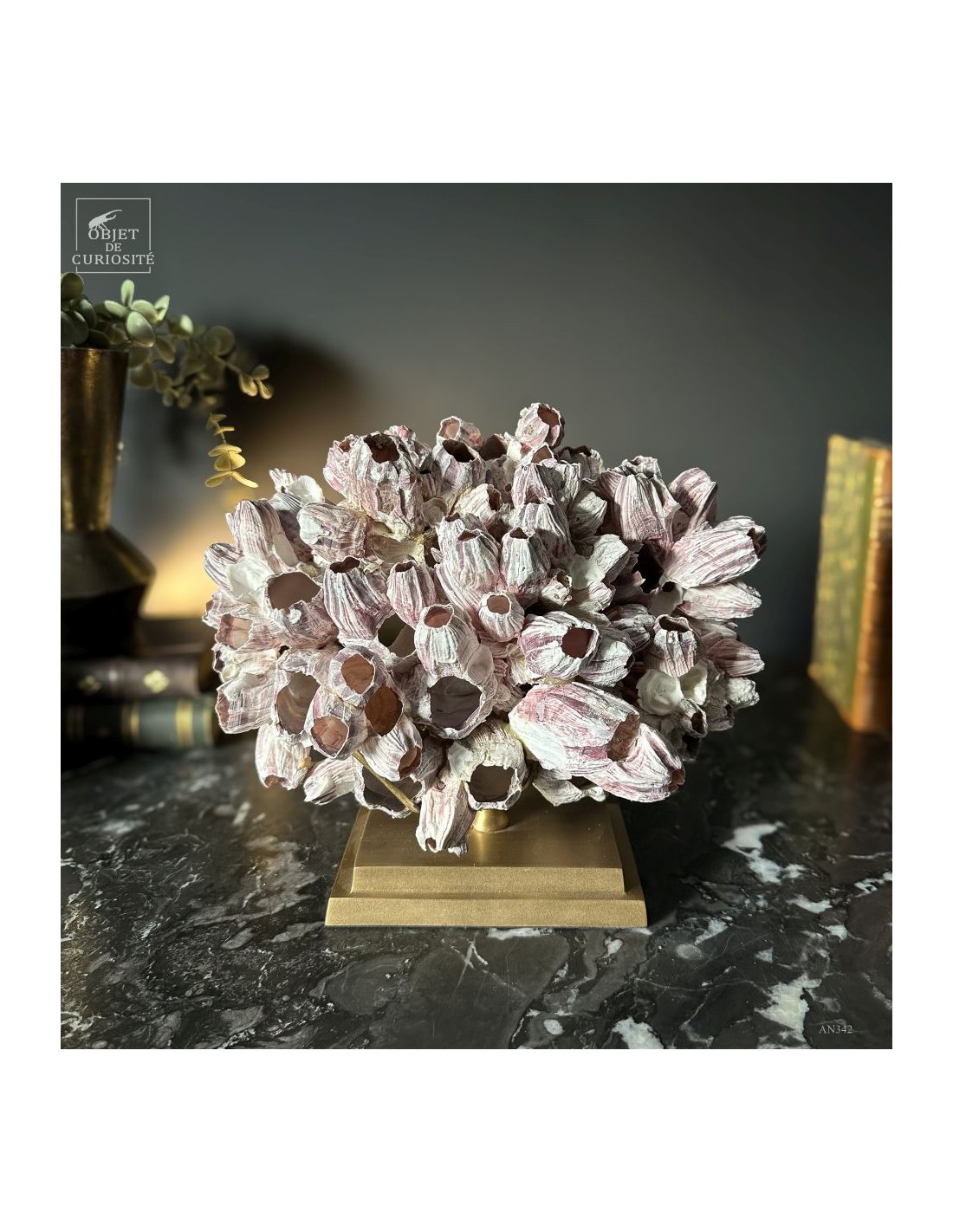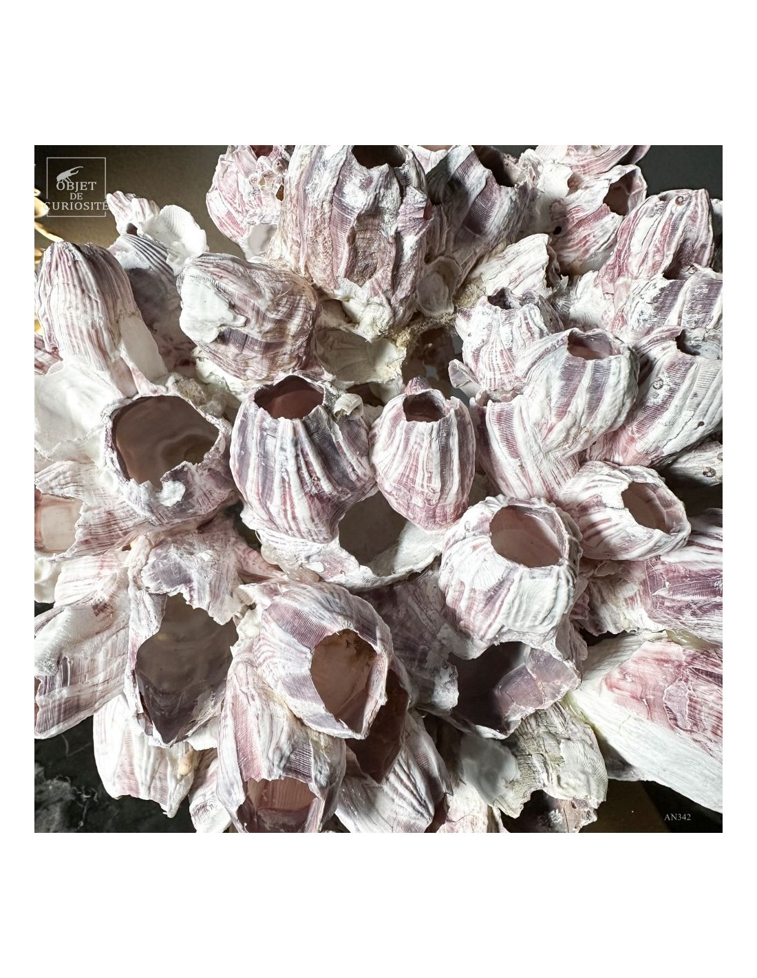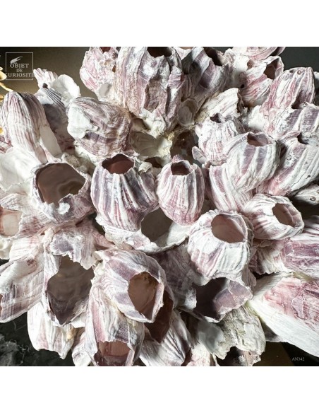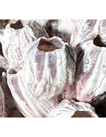 Ces grappes de balanes (MEGABALANUS TINTINNABULUM) proviennent des eaux philippines. Ce coquillage violet, souvent confondu avec du corail, est en réalité la coquille d’un crustacé sessile — un animal qui vit fixé et se nourrit en filtrant l’eau de mer.
