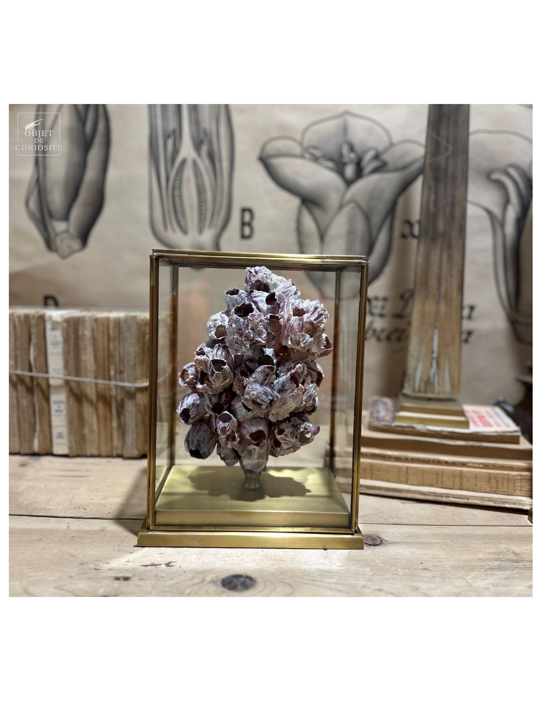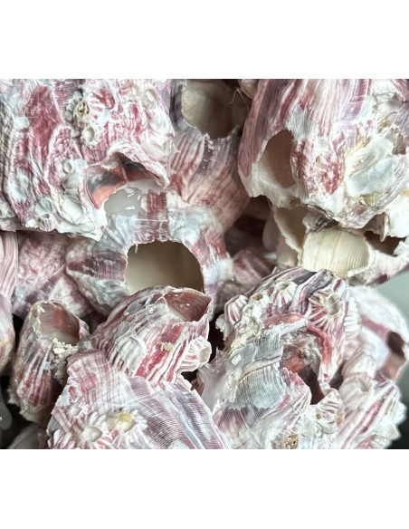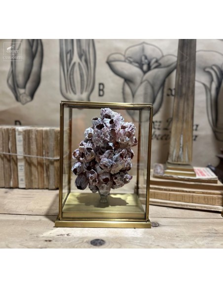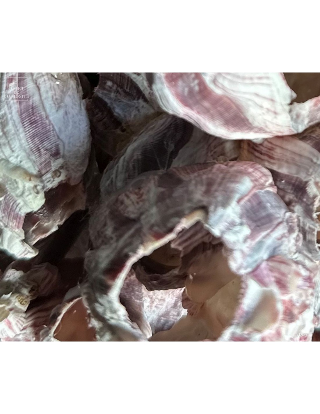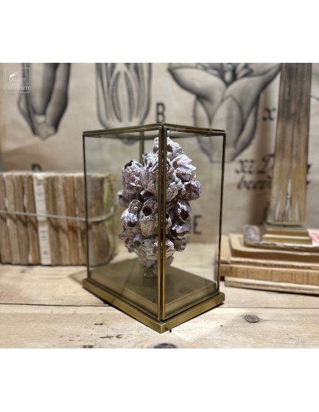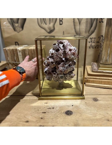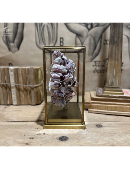 Grappes de coquillages violets (balanes) sur socle laiton. Ces coquilles, des Philippines, abritent en fait un animal qui se nourrit en filtrant l'eau de mer: Megabalanus tintinnabulum. Ces coquillages immobiles disposent de nombreux bras qu'ils déploient dans le courant pour se nourrir.