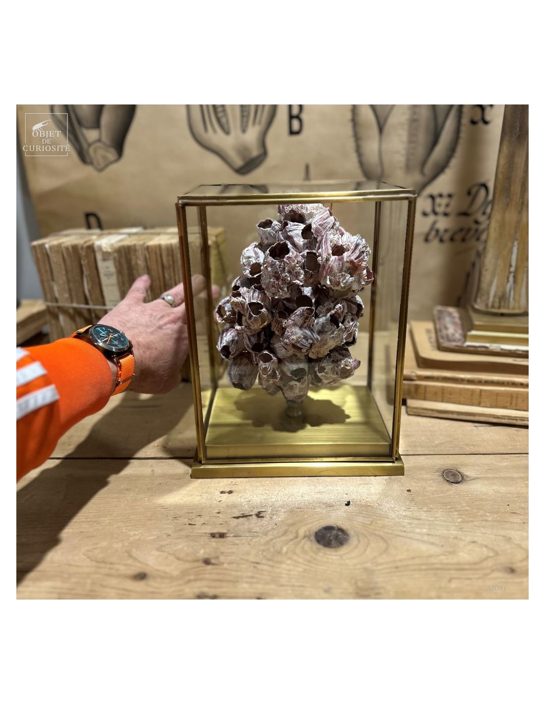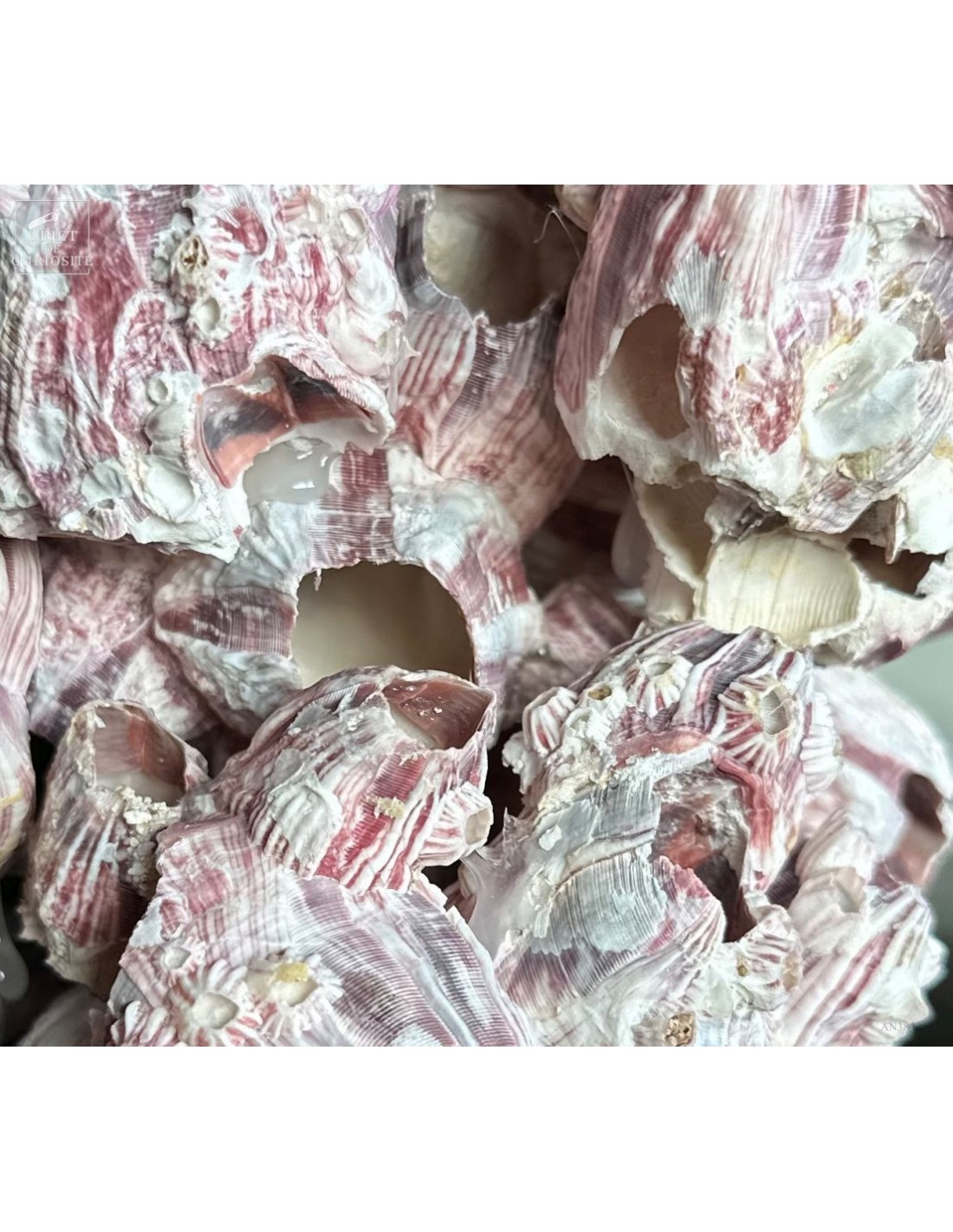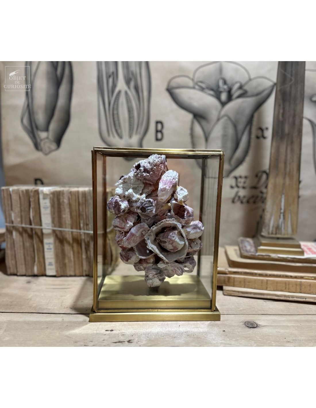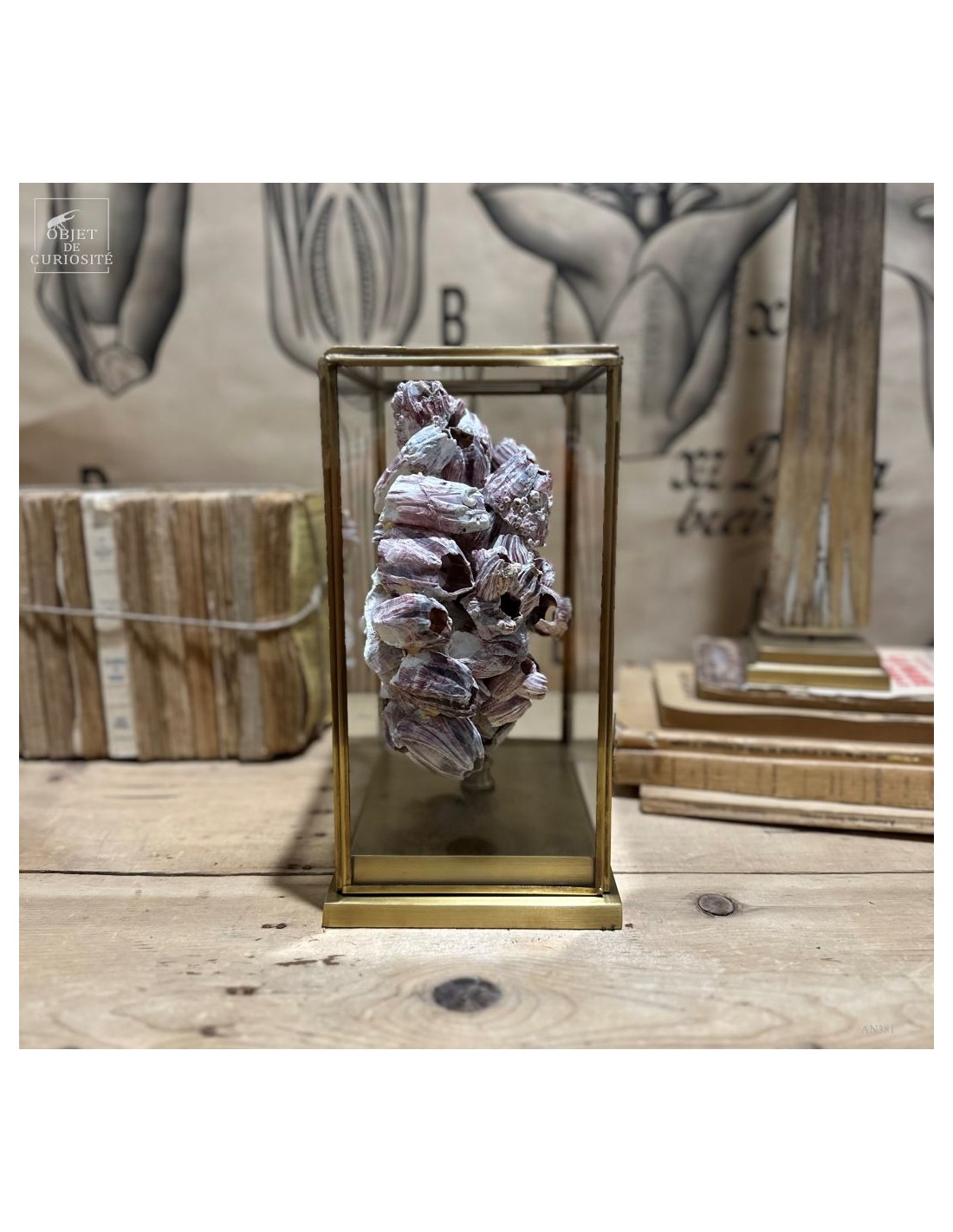 Grappes de coquillages violets (balanes) sur socle laiton. Ces coquilles, des Philippines, abritent en fait un animal qui se nourrit en filtrant l'eau de mer: Megabalanus tintinnabulum. Ces coquillages immobiles disposent de nombreux bras qu'ils déploient dans le courant pour se nourrir.