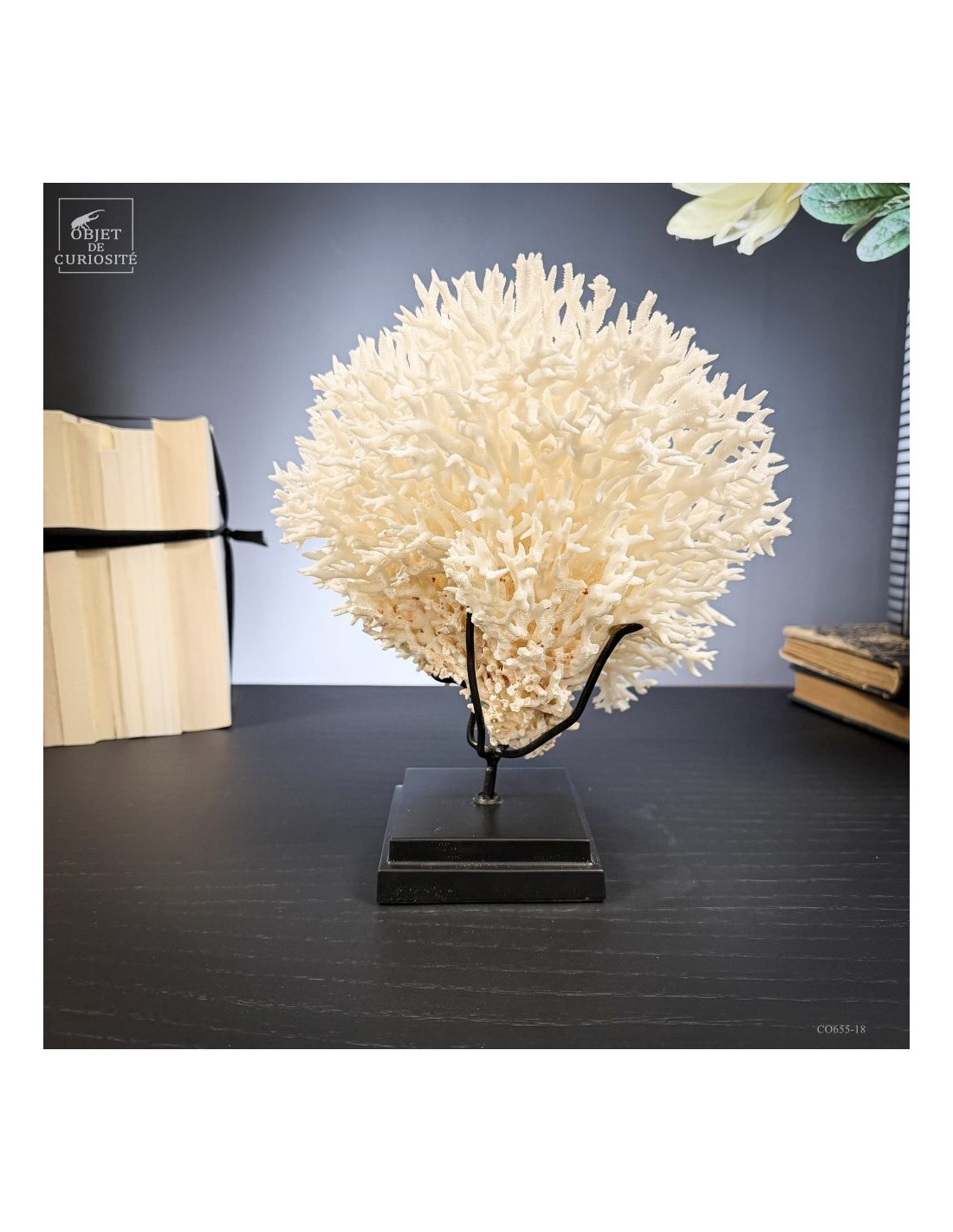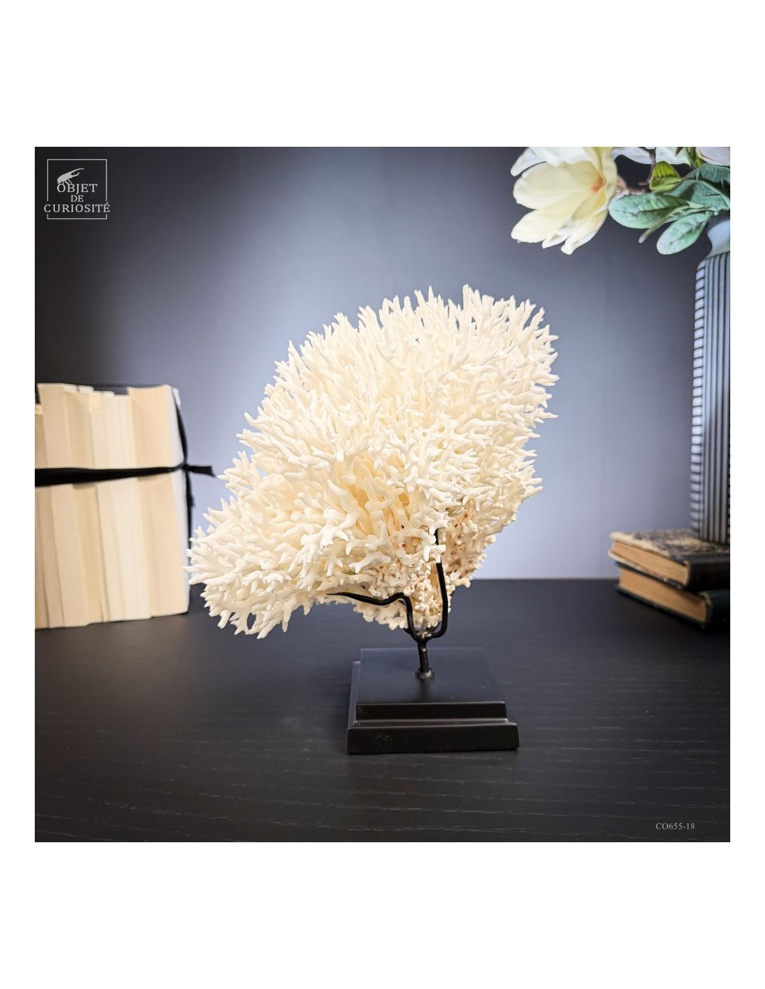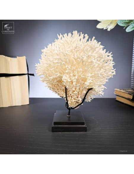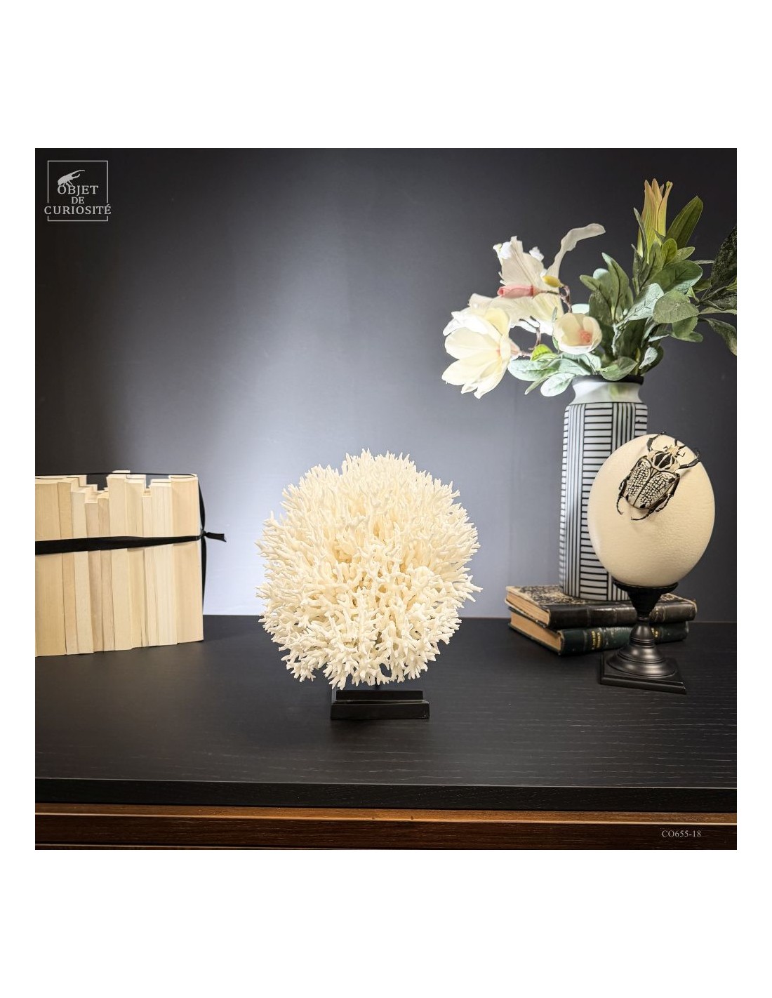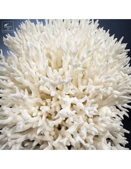 Corail nid blanc sur socle laiton. Composé de centaines de petites branches, ce corail provient des Iles Salomon. Son nom scientifique est Seriatopora Hystrix. Sous l'eau, seules les pointes restent blanches, tout le reste est d'un rose fushia (ou jaune pour certaines sous-espèces) Ce corail est livré avec sa propre référence CITES (Convention de Washington sur les espèces à commerce sous surveillance)