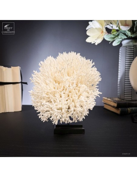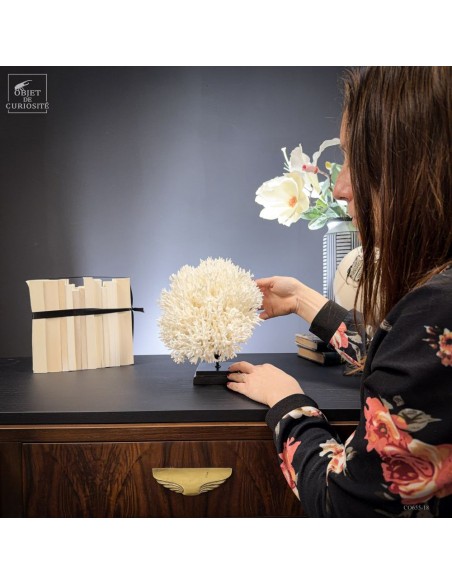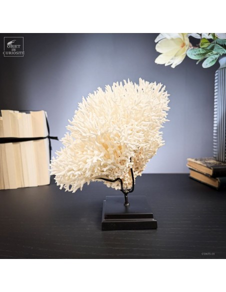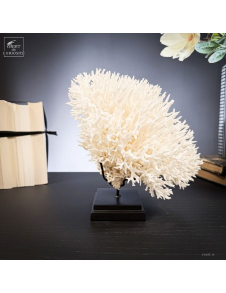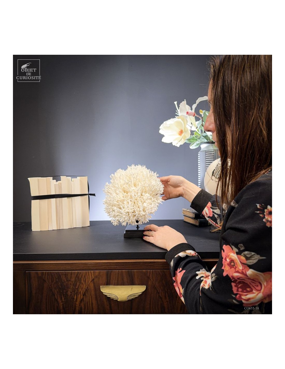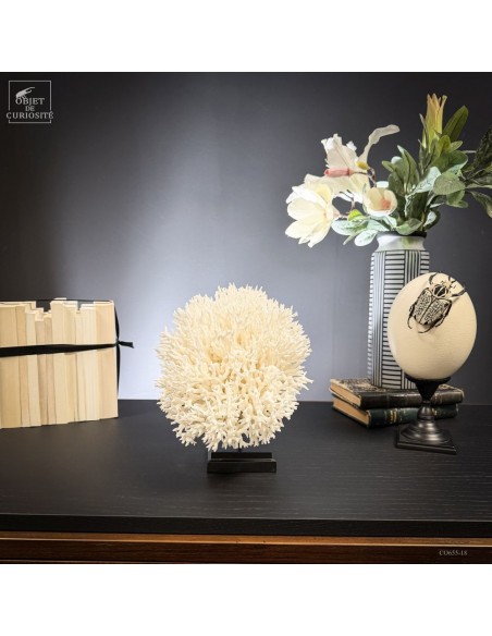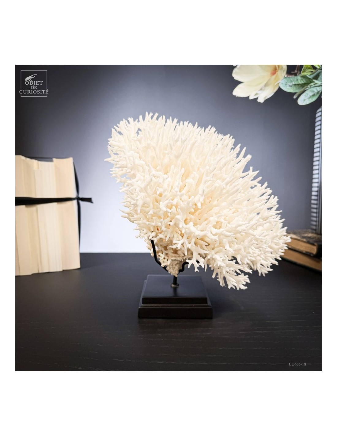 Corail nid blanc sur socle laiton. Composé de centaines de petites branches, ce corail provient des Iles Salomon. Son nom scientifique est Seriatopora Hystrix. Sous l'eau, seules les pointes restent blanches, tout le reste est d'un rose fushia (ou jaune pour certaines sous-espèces) Ce corail est livré avec sa propre référence CITES (Convention de Washington sur les espèces à commerce sous surveillance)