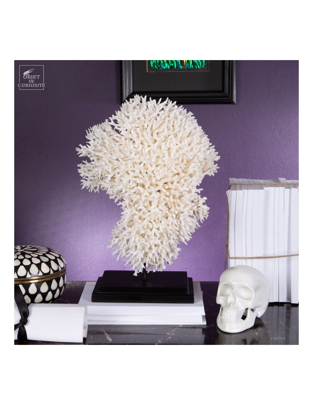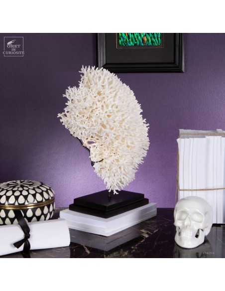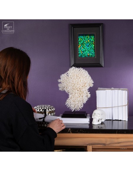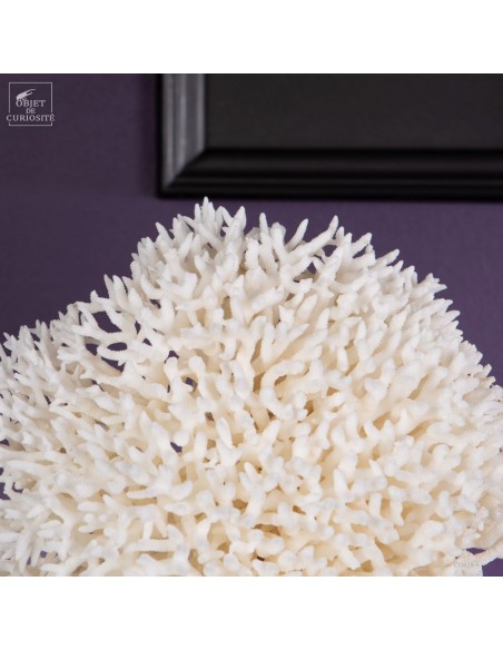 Corail nid blanc sur socle metal noir. Composé de centaines de petites branches, ce corail provient des Iles Salomon. son nom scientifique: Seriatopora Hystrix. Sous l'eau, seules les pointes restent blanches, tout le reste est d'un rose fushia (ou jaune pour certaines sous-espèces) Ce corail est livré avec sa propre référence CITES (Convention de Washington sur les espèces à commerce sous surveillance)