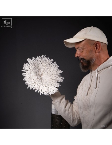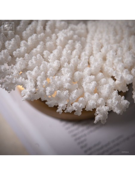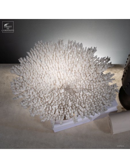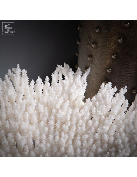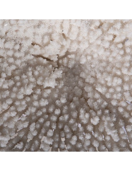 ACROPORA LATISTELLA est un corail originaire des îles Salomon. Il se développe dans les premiers mètres d’eau, là où la lumière est la plus intense. Ses rameaux sinueux, parfois en forme de vagues enroulées, composent des structures robustes qui abritent une multitude de petits organismes. Sa couleur naturelle est beige, parfois ponctuée de polypes mauves. Une fois minéralisé, il révèle ce squelette blanc éclatant qui semble taillé dans la porcelaine.