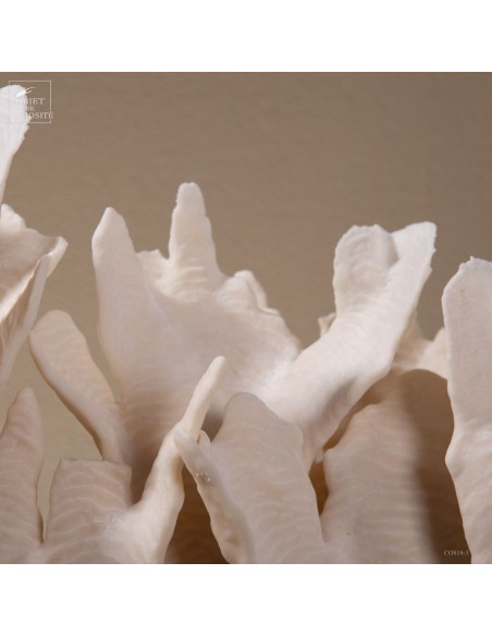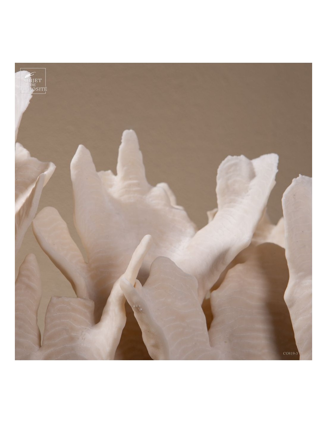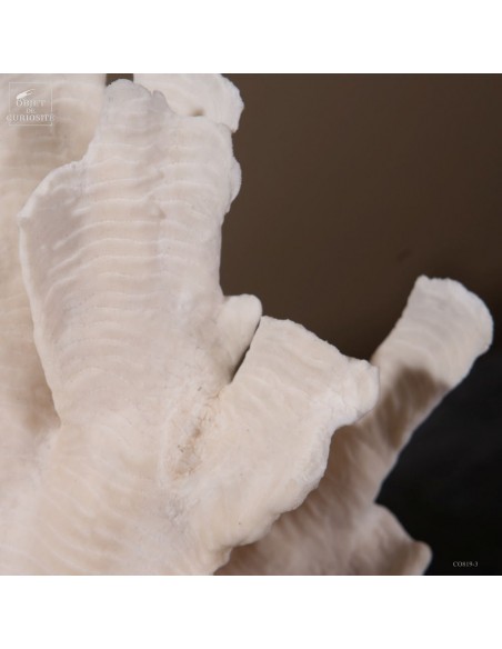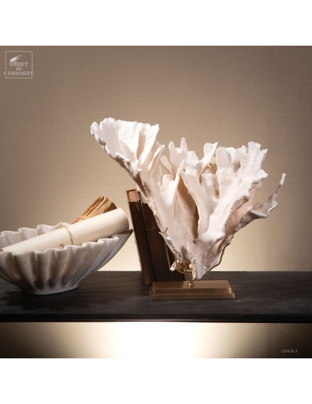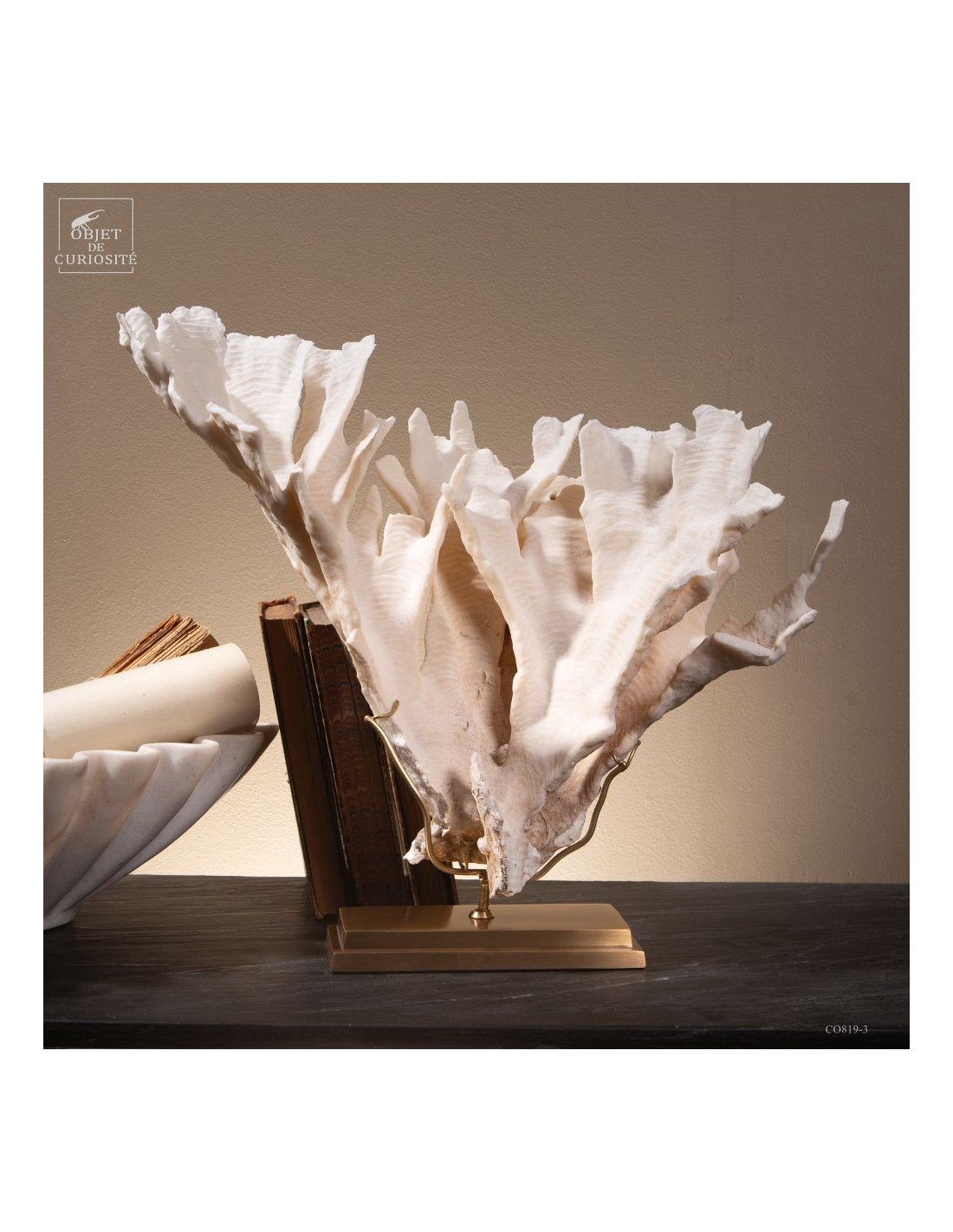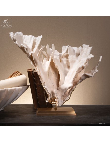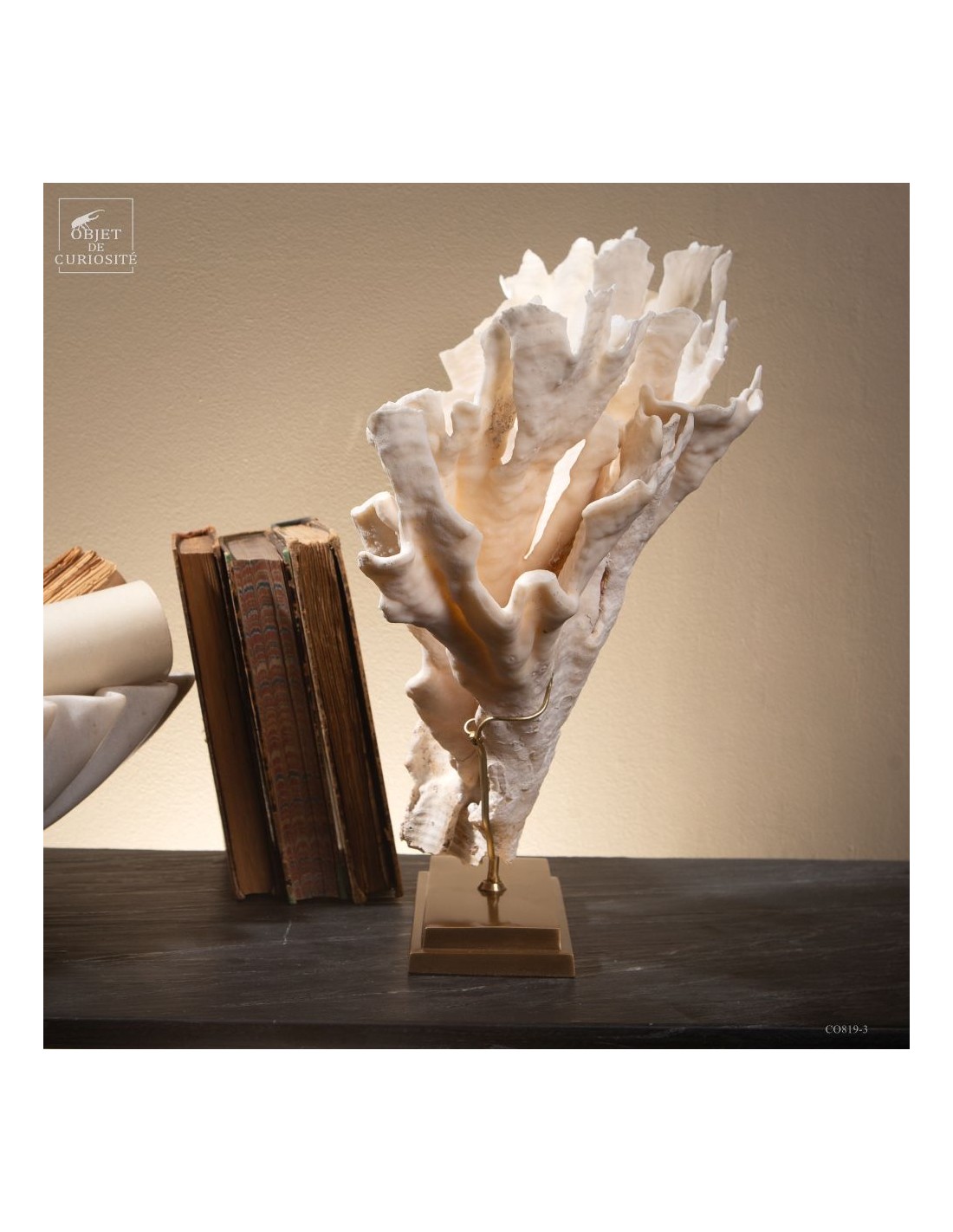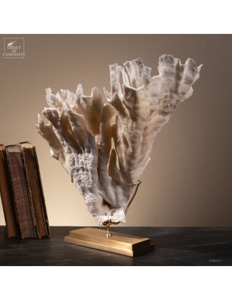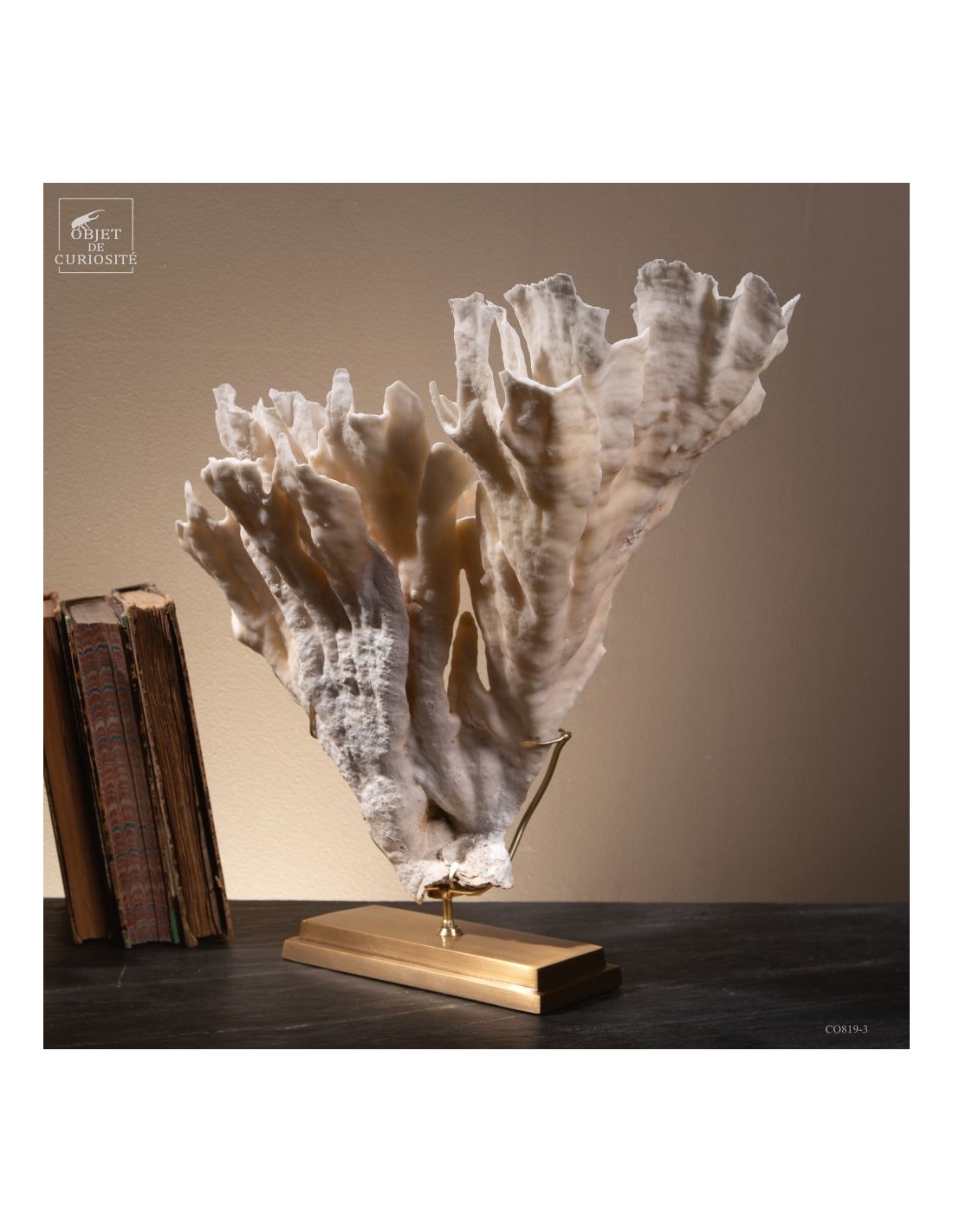 Privé de ses polypes, il ne reste que le squelette minéralisé blanc, qui révèle la complexité du dessin. Présenté sur une base en laiton, ce corail a toute sa place dans un cabinet de curiosités.