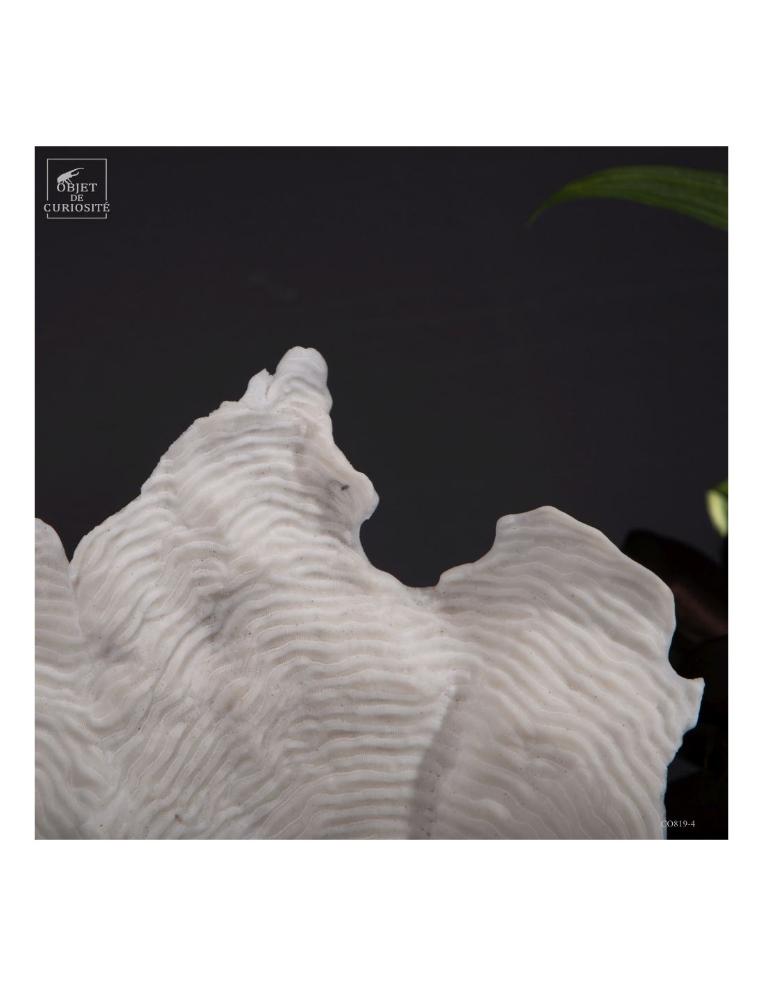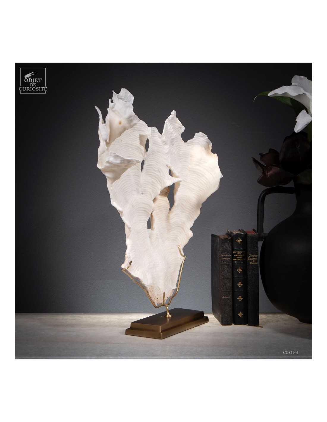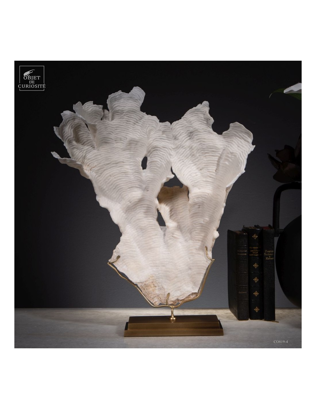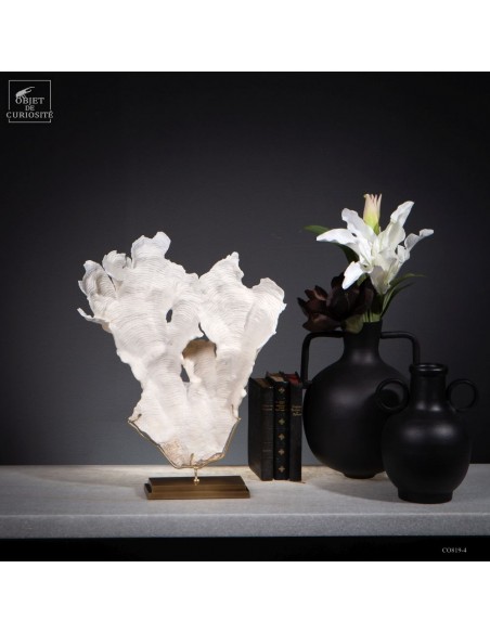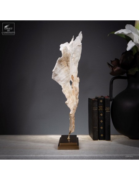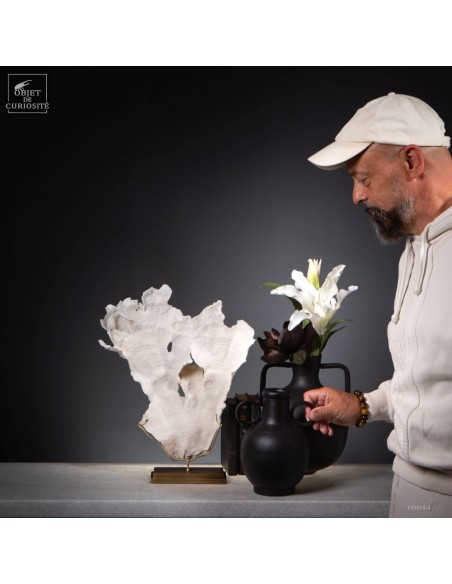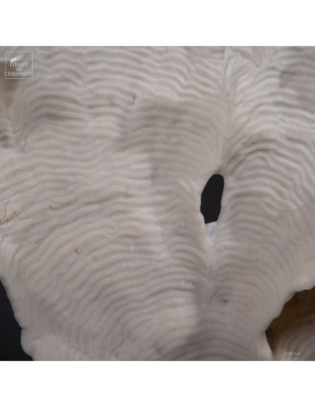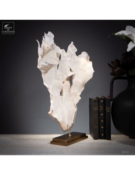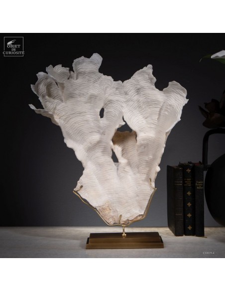 Privé de ses polypes, il ne reste que le squelette minéralisé blanc, qui révèle la complexité du dessin. Présenté sur une base en laiton, ce corail a toute sa place dans un cabinet de curiosités.