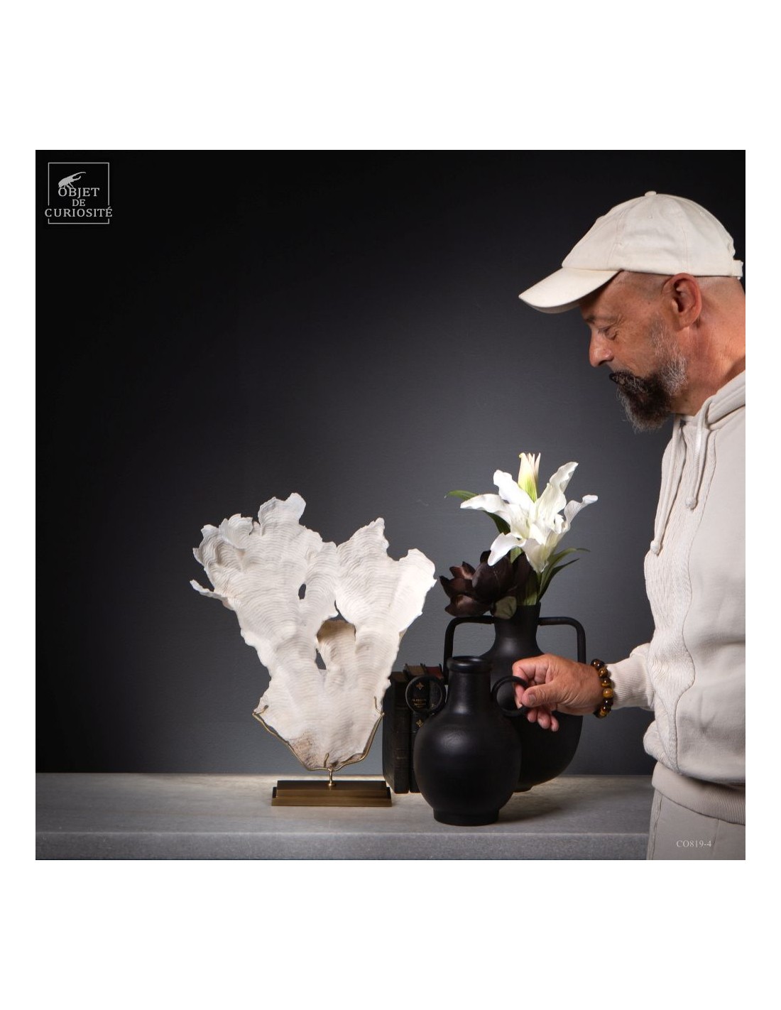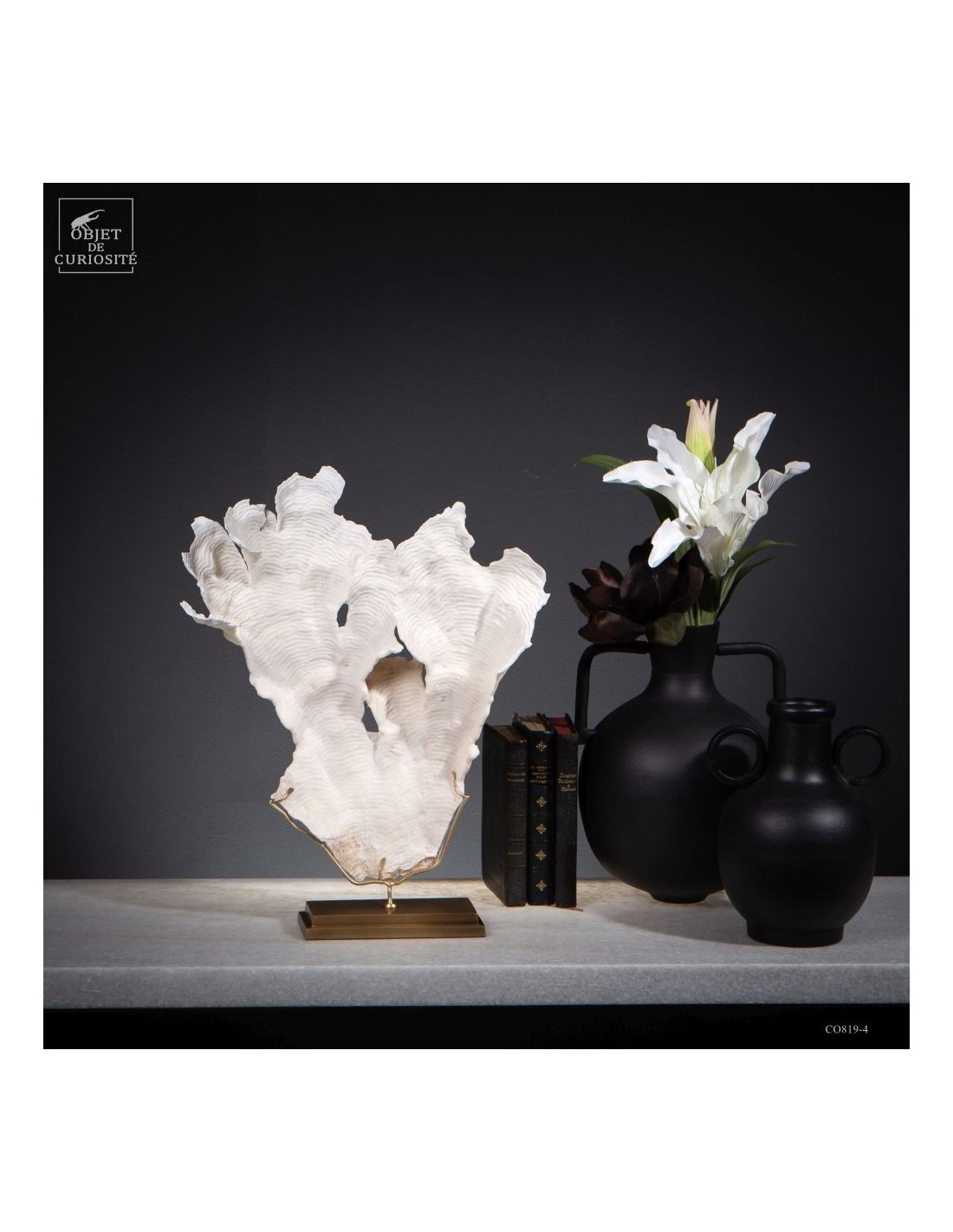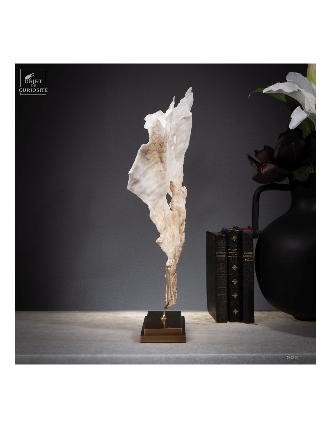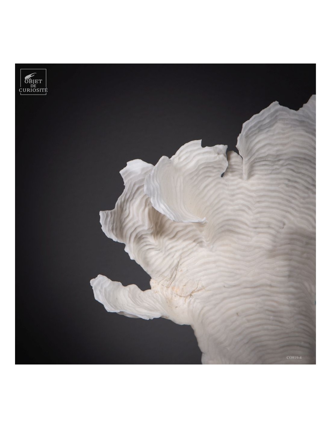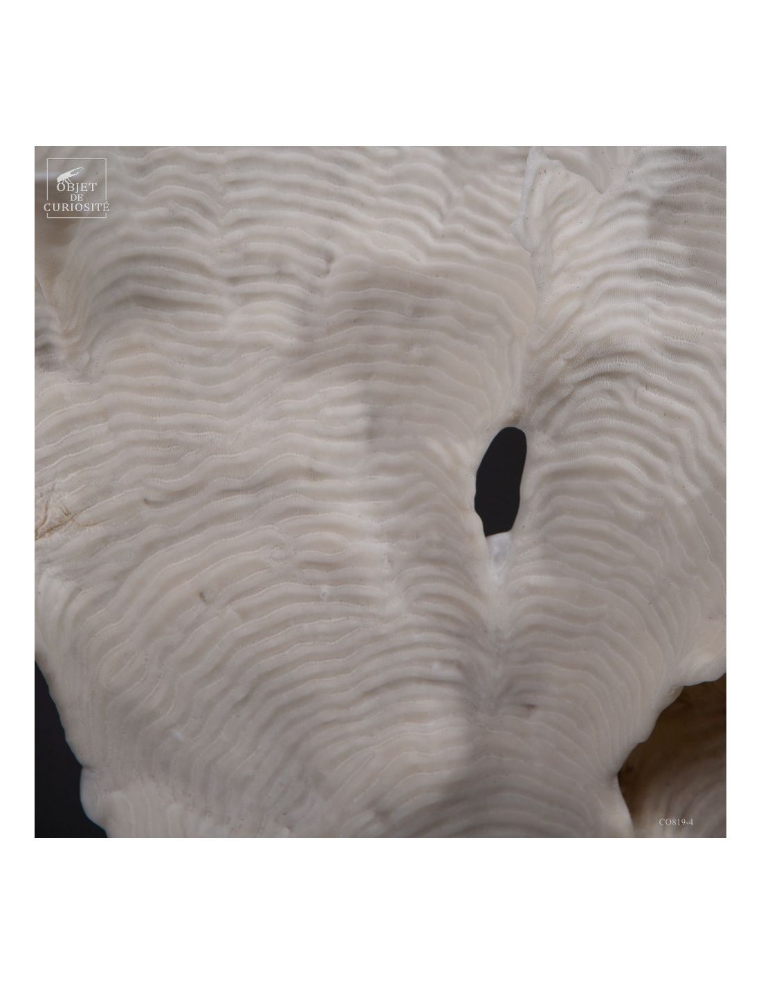 Privé de ses polypes, il ne reste que le squelette minéralisé blanc, qui révèle la complexité du dessin. Présenté sur une base en laiton, ce corail a toute sa place dans un cabinet de curiosités.