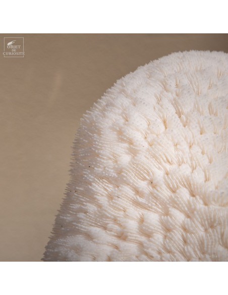 À l’état vivant, il présente des teintes brunes rehaussées de bords rosés ou violacés. Une fois minéralisé, il révèle un squelette blanc, rayonné de sillons concentriques, qui lui donne l’allure d’une coquille calcaire sculptée par la mer.