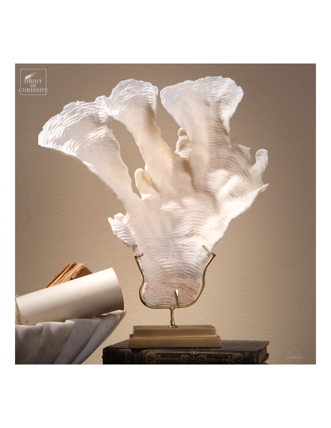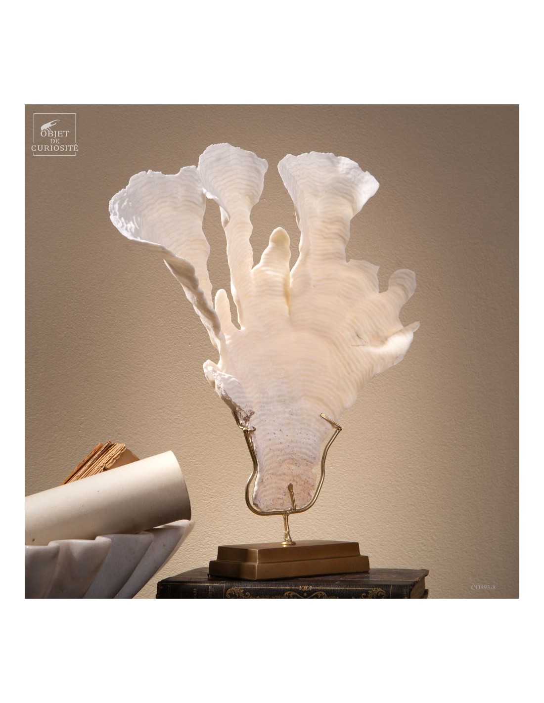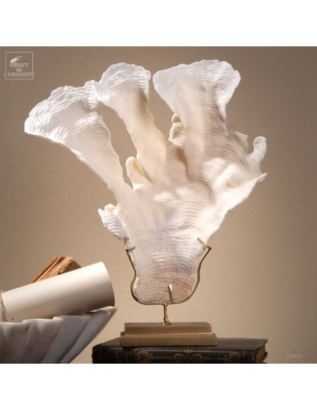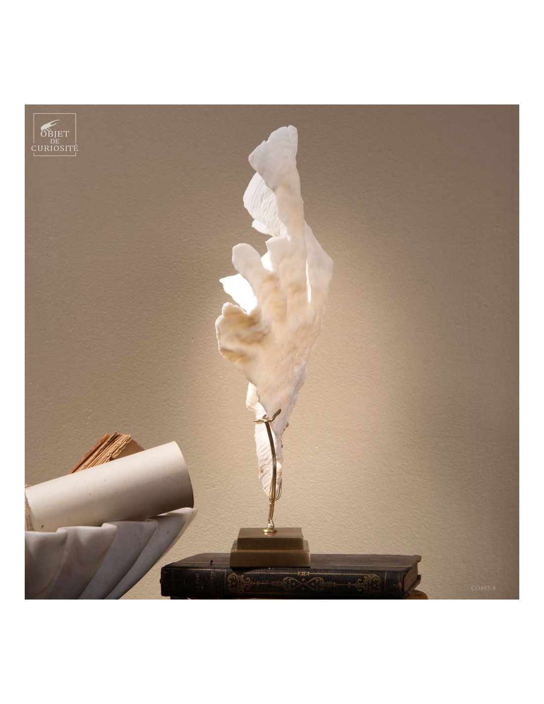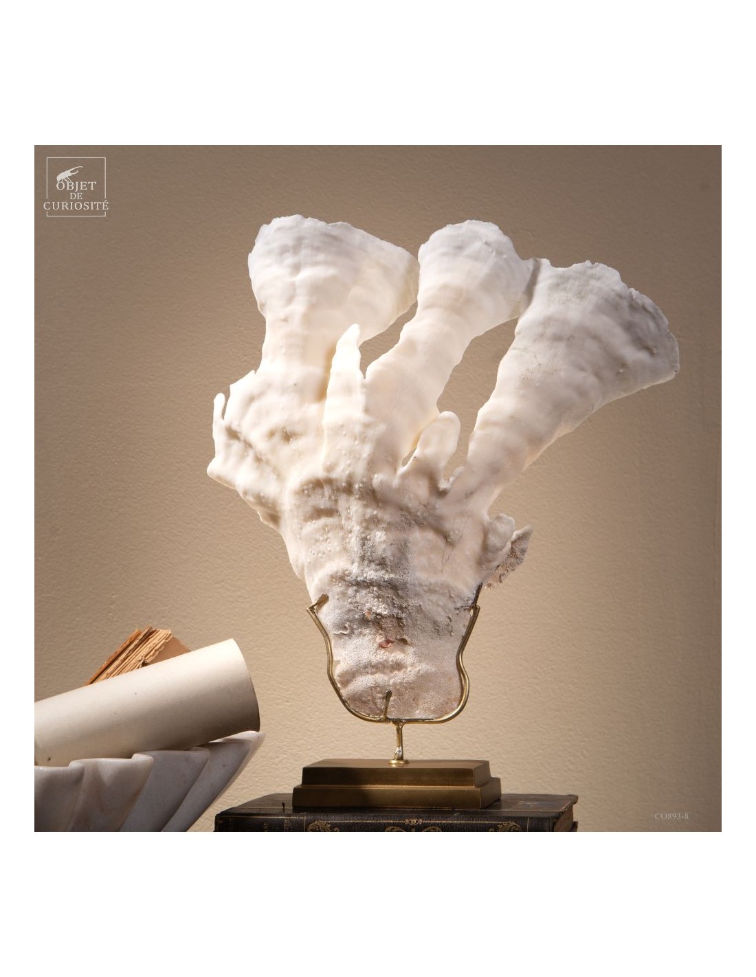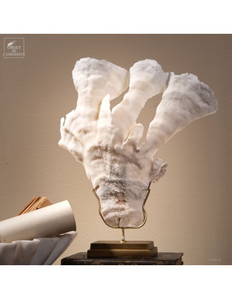 Privé de ses polypes, il ne reste que le squelette minéralisé blanc, qui révèle la complexité du dessin. Présenté sur une base en laiton, ce corail a toute sa place dans un cabinet de curiosités.