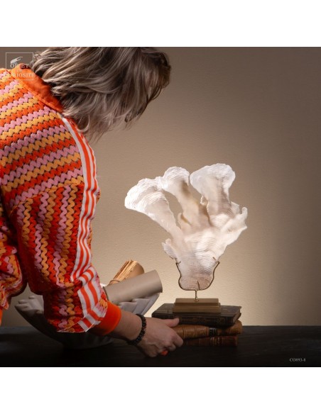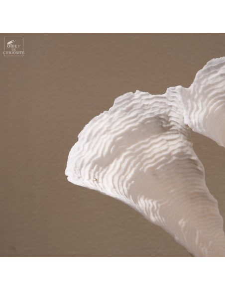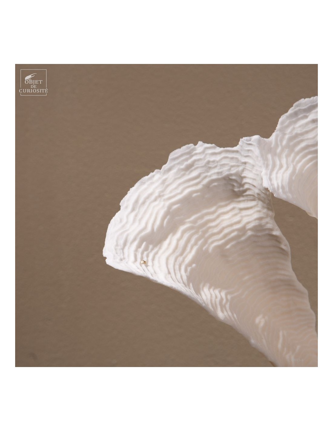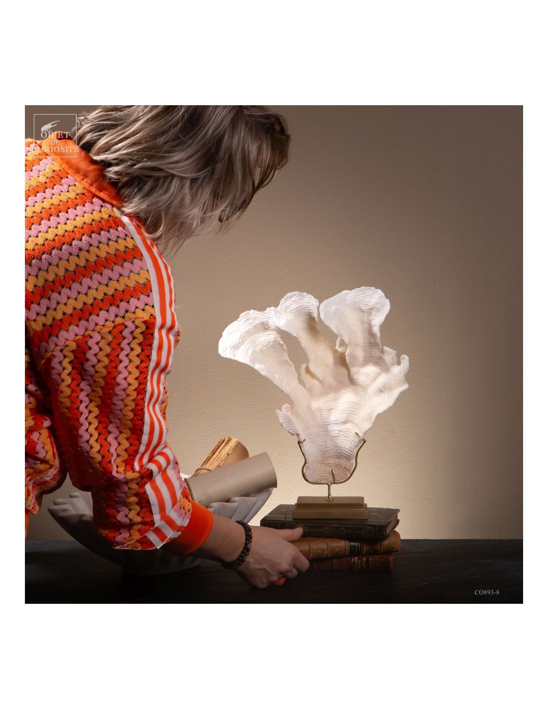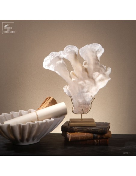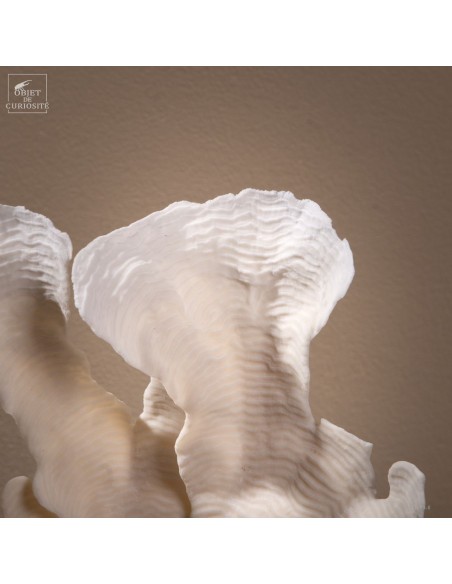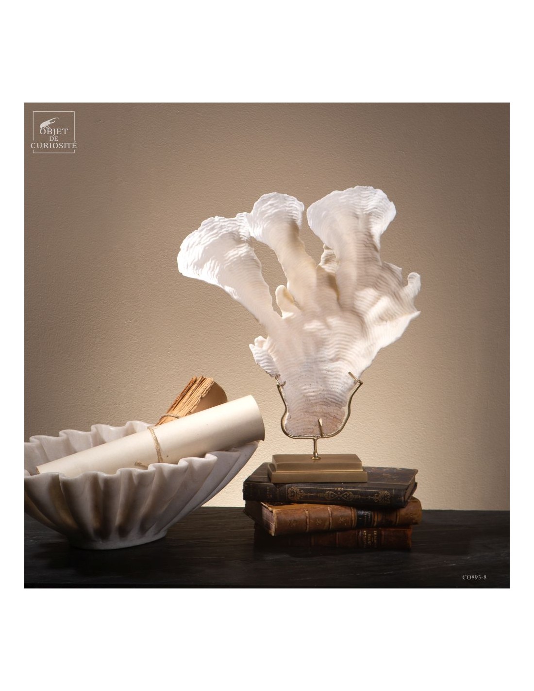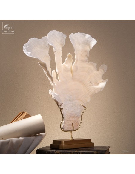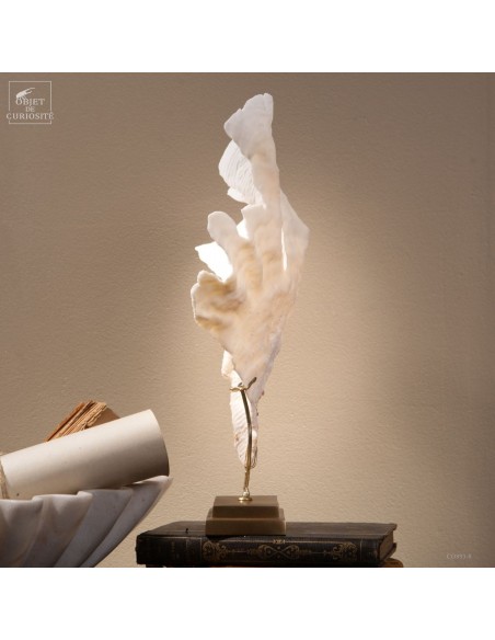 Privé de ses polypes, il ne reste que le squelette minéralisé blanc, qui révèle la complexité du dessin. Présenté sur une base en laiton, ce corail a toute sa place dans un cabinet de curiosités.