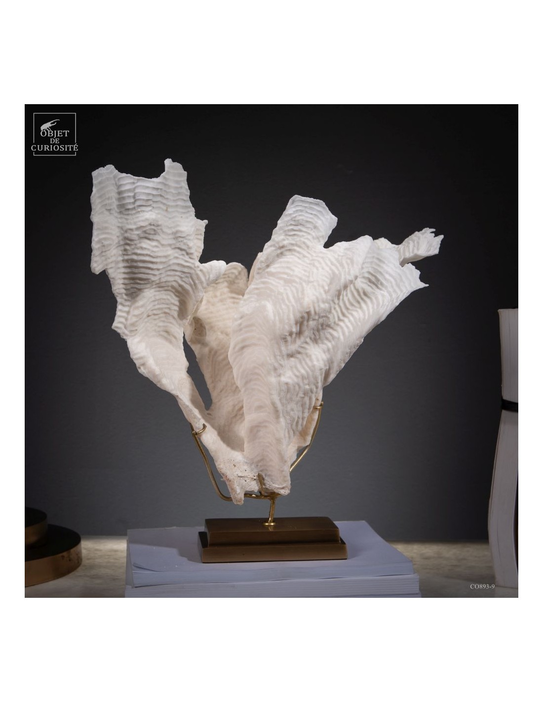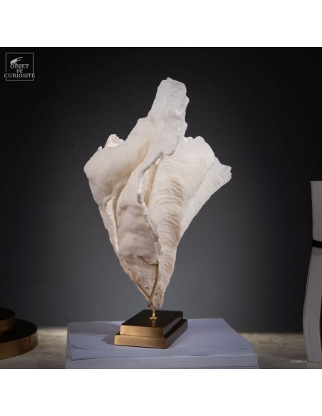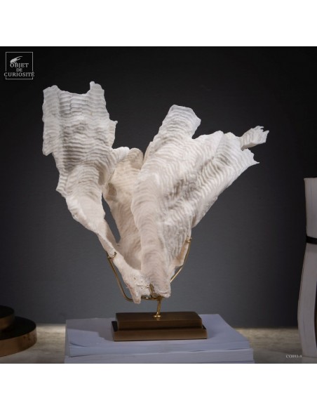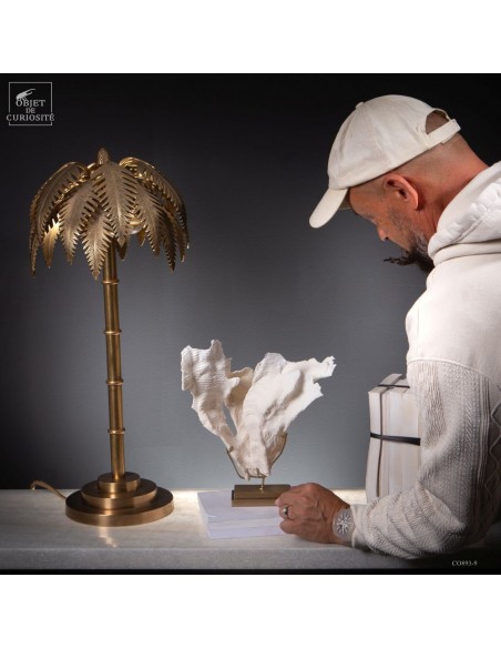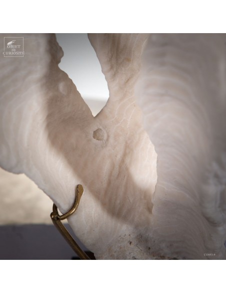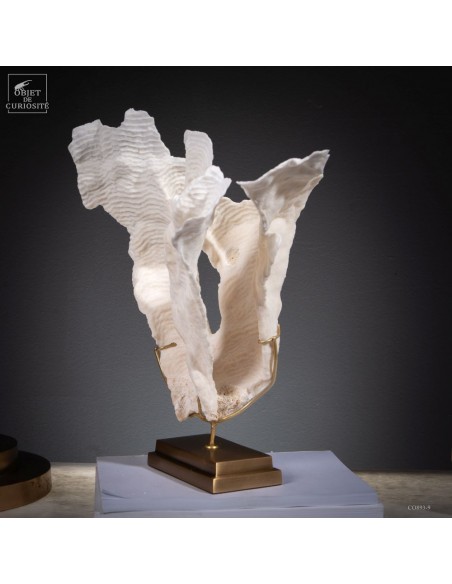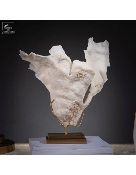 Privé de ses polypes, il ne reste que le squelette minéralisé blanc, qui révèle la complexité du dessin. Présenté sur une base en laiton, ce corail a toute sa place dans un cabinet de curiosités.