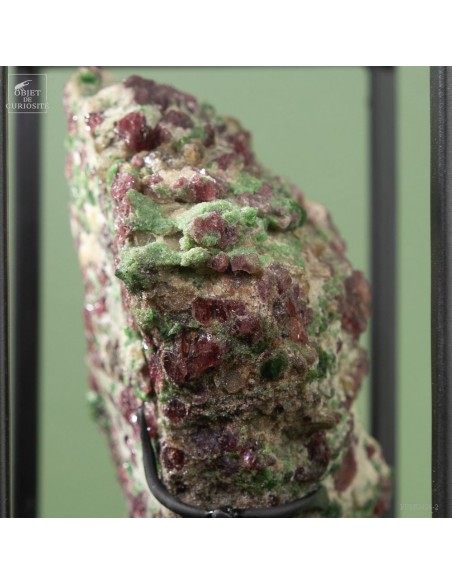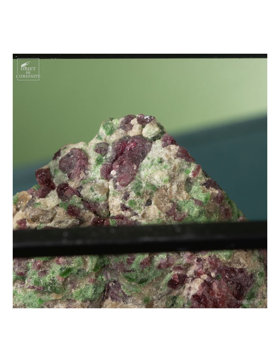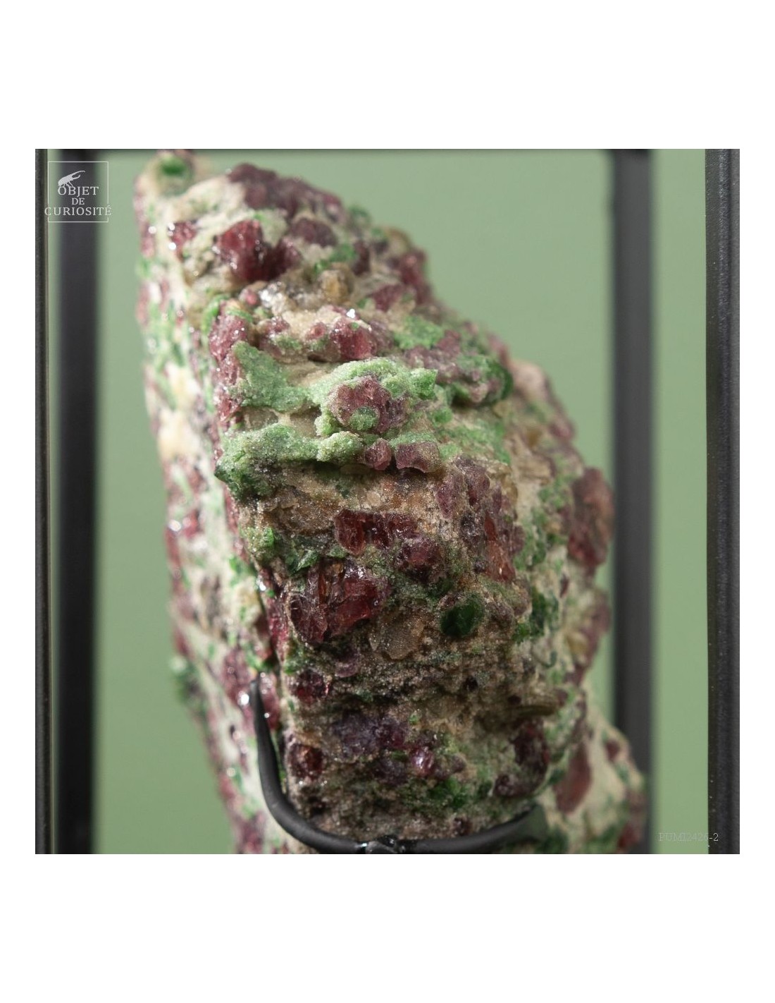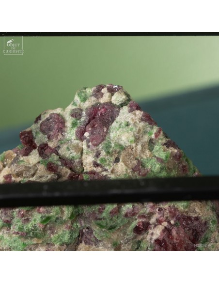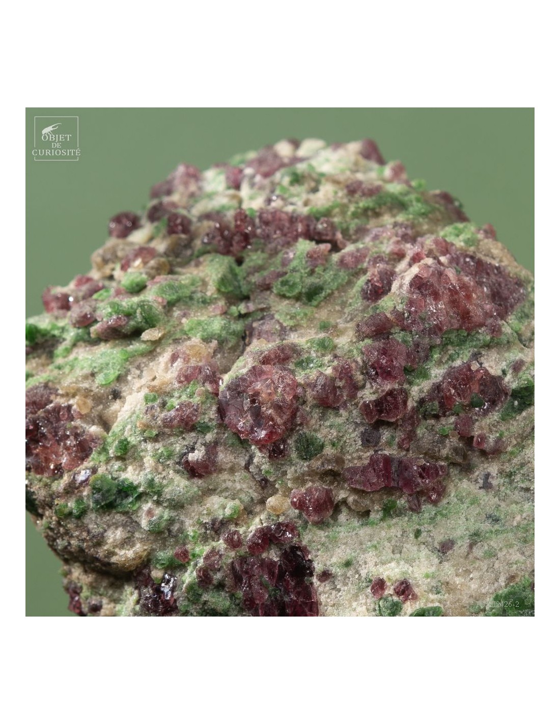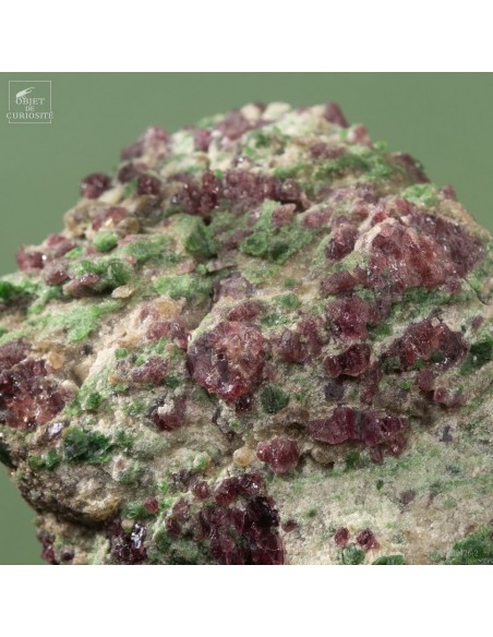 Lorsque ces deux minéraux se rencontrent, le grenat pyrope, rouge profond, contraste avec le diopside de chrome, vert intense. Cette combinaison crée une association de couleurs étonnant, faisant ainsi une pièce remarquable. Ce minéral s'est formée à 40Km de profondeur près du coeur de notre planète, et il est remonté à la surface pendant les poussées géologiques (orogénèse) du Dévonien, il y a 400 million d'années.