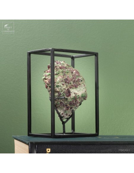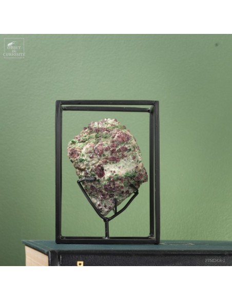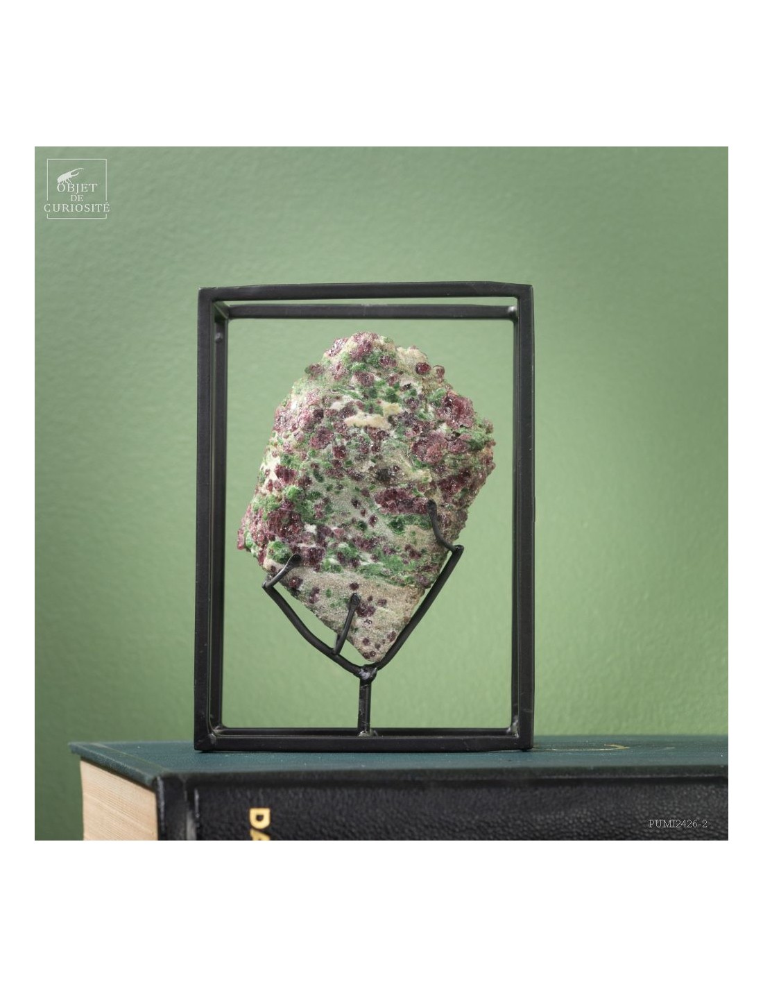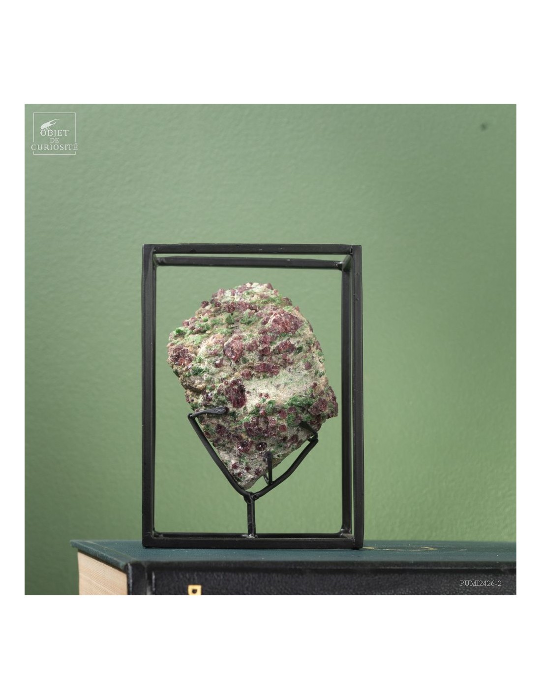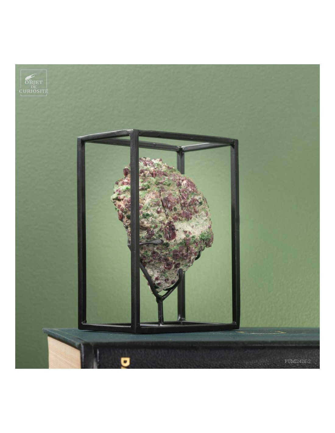 Lorsque ces deux minéraux se rencontrent, le grenat pyrope, rouge profond, contraste avec le diopside de chrome, vert intense. Cette combinaison crée une association de couleurs étonnant, faisant ainsi une pièce remarquable. Ce minéral s'est formée à 40Km de profondeur près du coeur de notre planète, et il est remonté à la surface pendant les poussées géologiques (orogénèse) du Dévonien, il y a 400 million d'années.