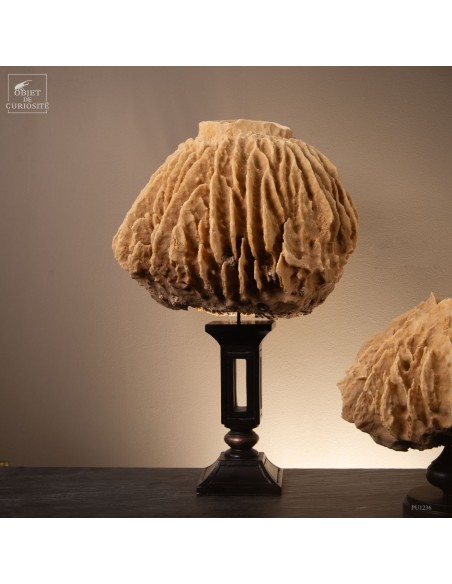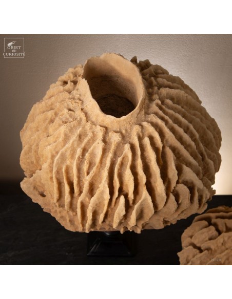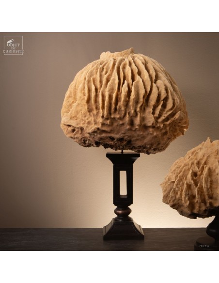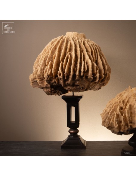 Ce spécimen a été minutieusement séché, puis présenté sur une base en métal noir, dans l’esprit des cabinets de curiosités, afin de valoriser le volume et le relief de sa surface.