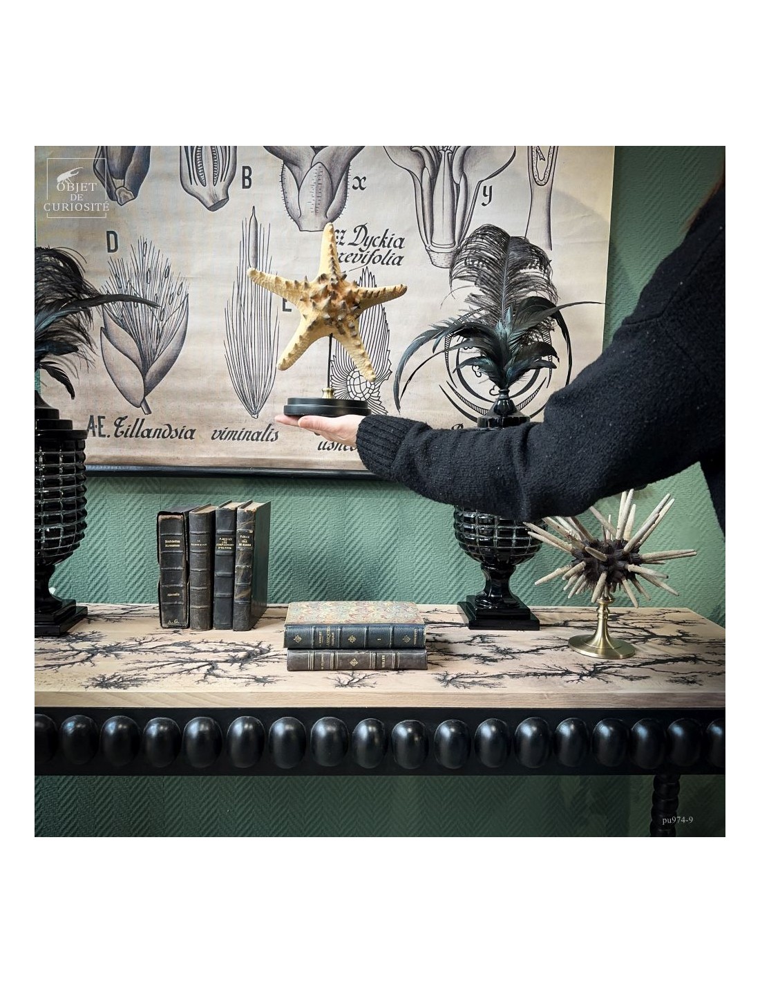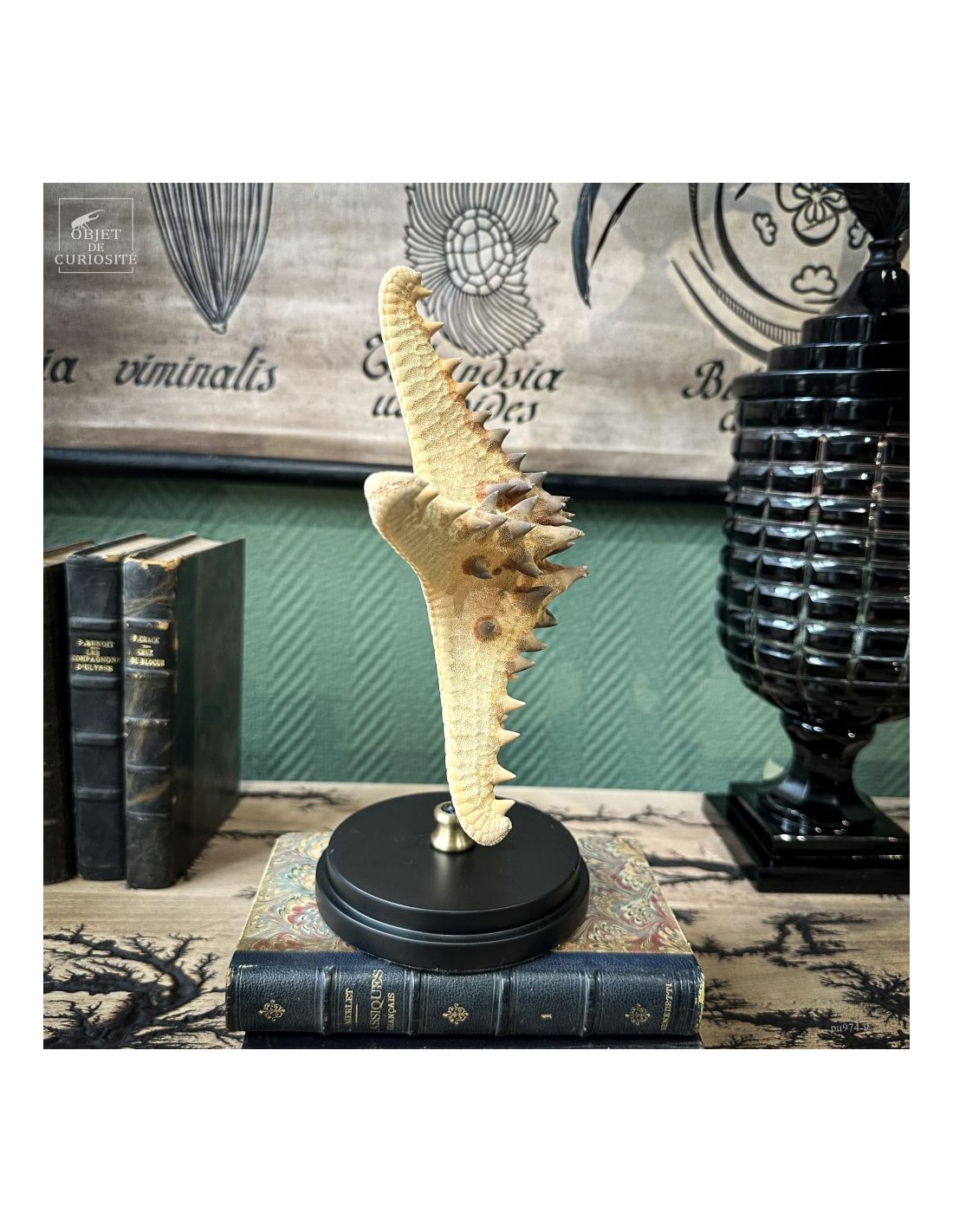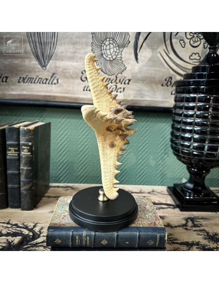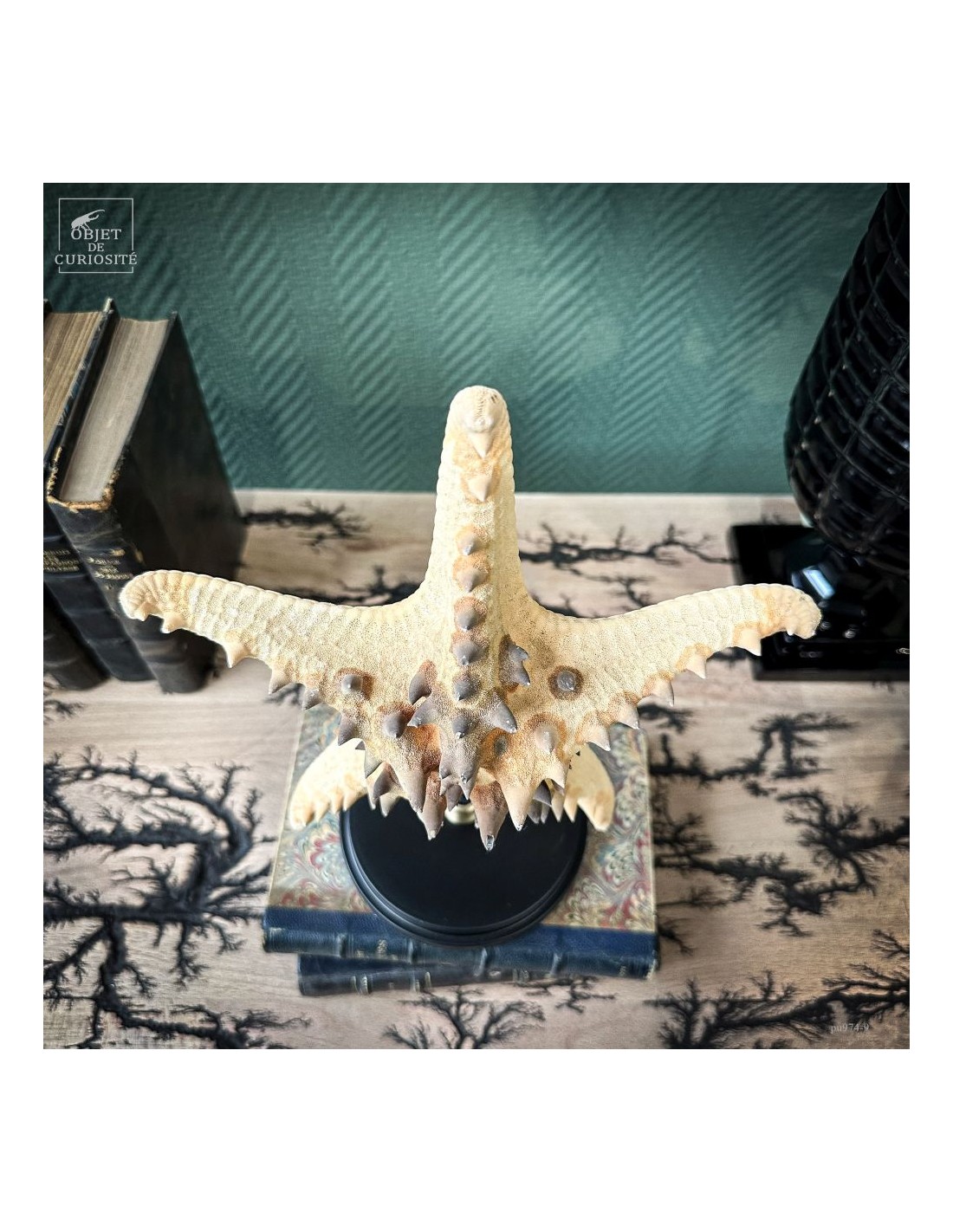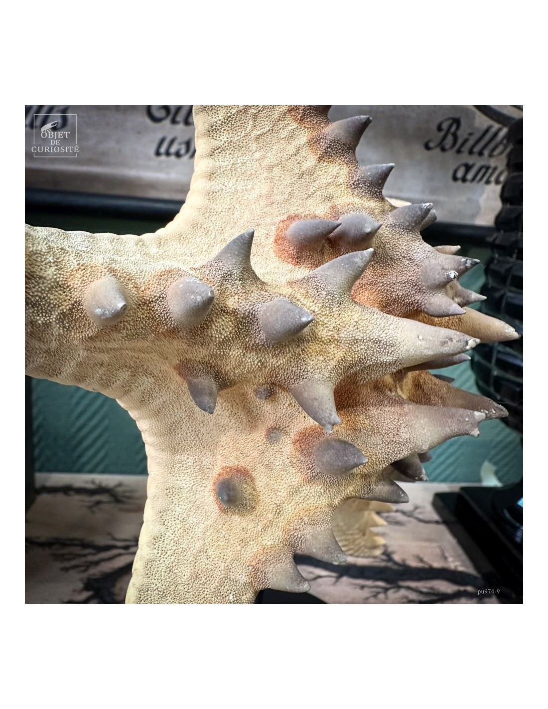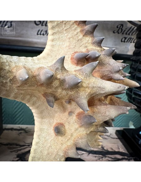 Cette belle étoile de mer ornée de pointes est une Pentaceraster Alveolatus des Philippines. Elle fait partie des étoiles de mer "coussin" car son corps est assez gonflé. Cette espèce comprend une incroyable variété de couleurs chatoyantes, puisque celle-ci pouvait très bien être bleu électrique avec le coeur jaune et toutes ses pointes rouge vif, ou entièrement couleur framboise... Puisque les couleurs de cette espèce disparaissent avec sa mort. Mais ses excroissances sont toujours aussi remarquables.