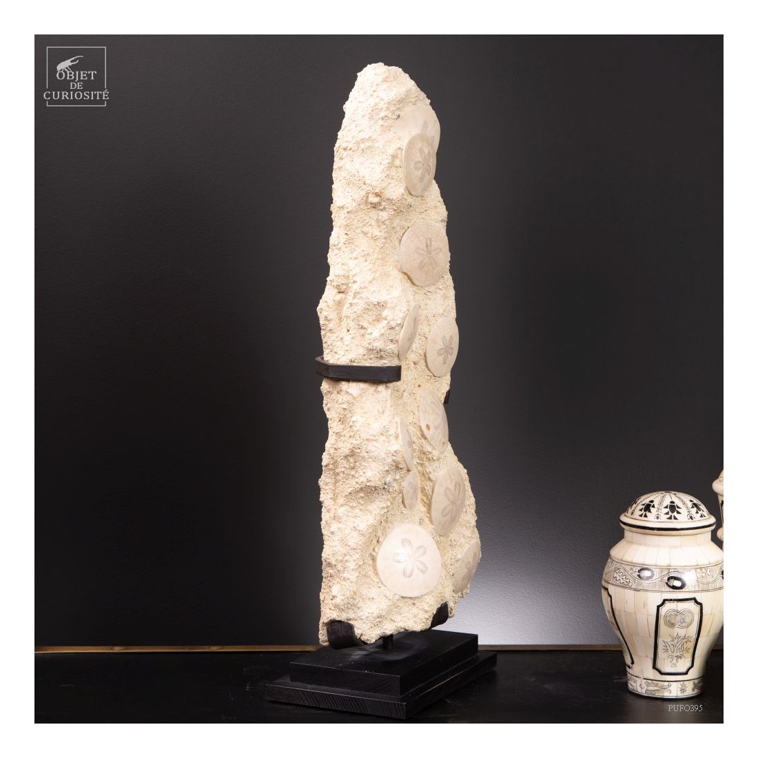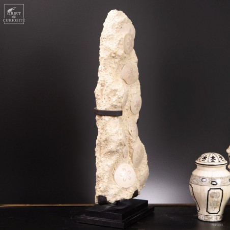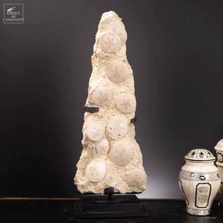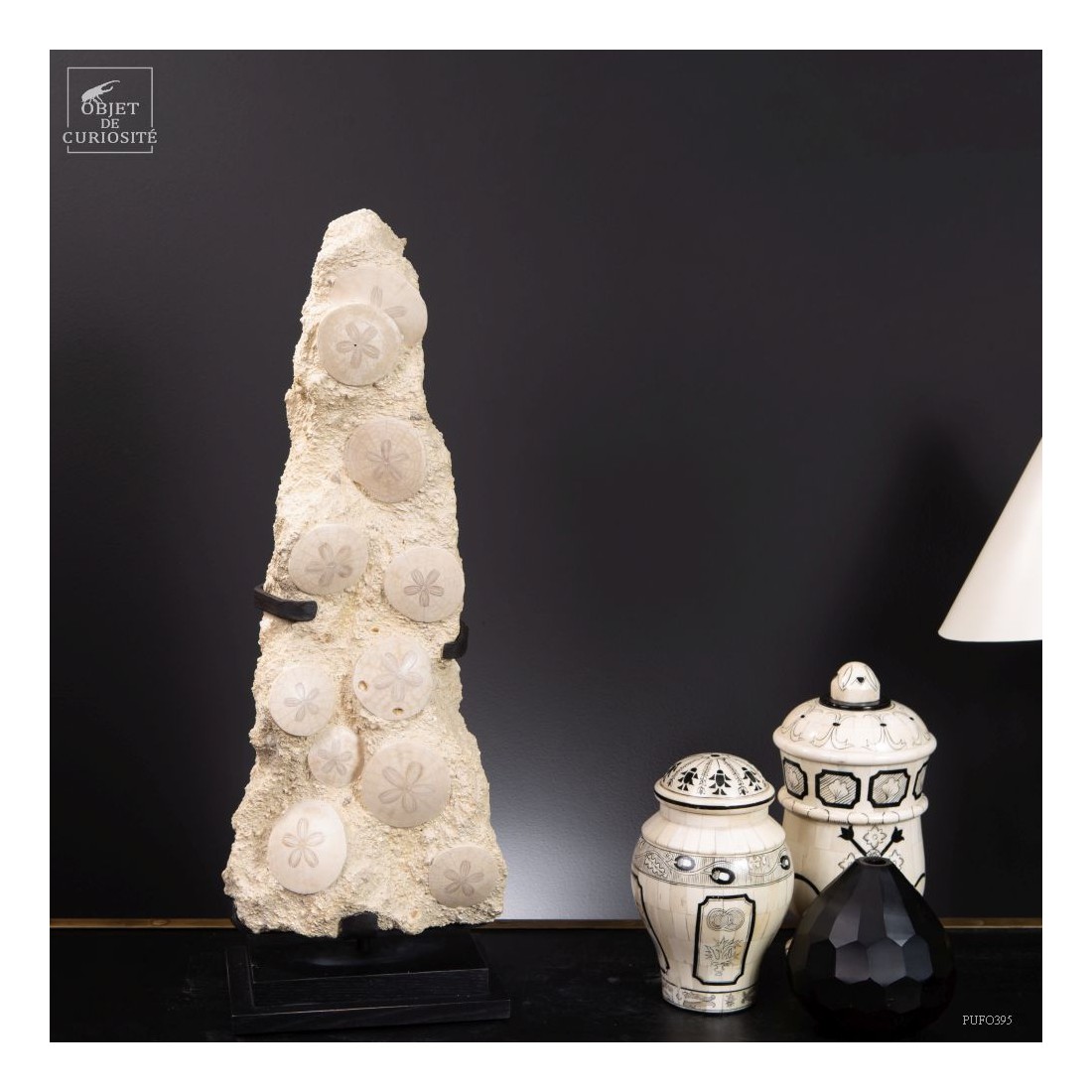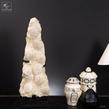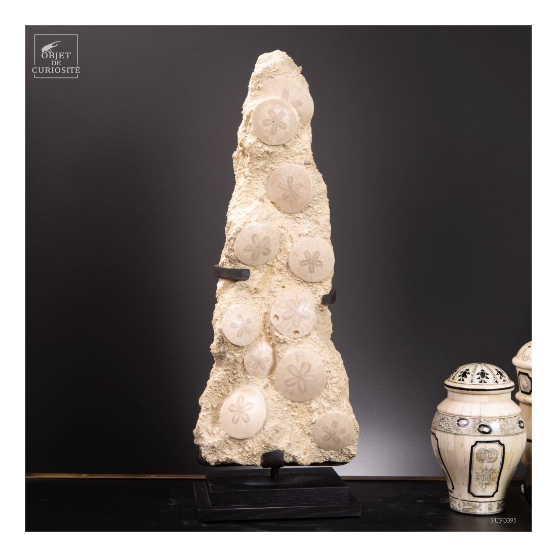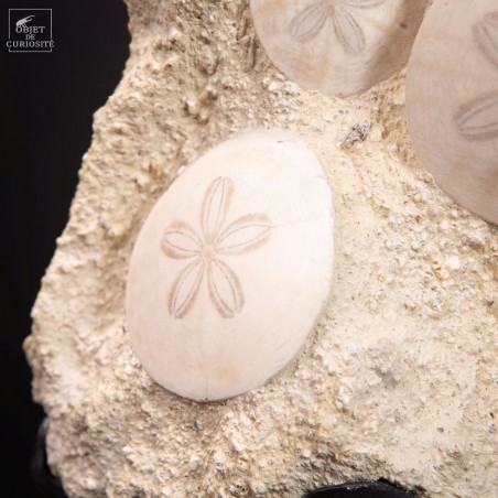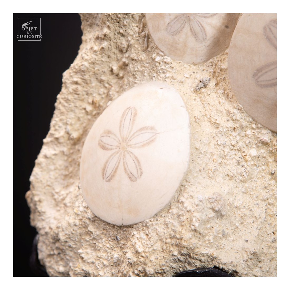Cette pierre est une véritable photographie d'un fond sous-marin du miocène (-24 à -14 Millions d'années) et a été découverte en France. Ces oursins fossiles plats abondaient à l'époque. Leur espèce est Scutella Faujasi. Ce sont les ancêtres des dol lars des sables (AN273).