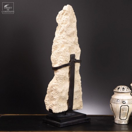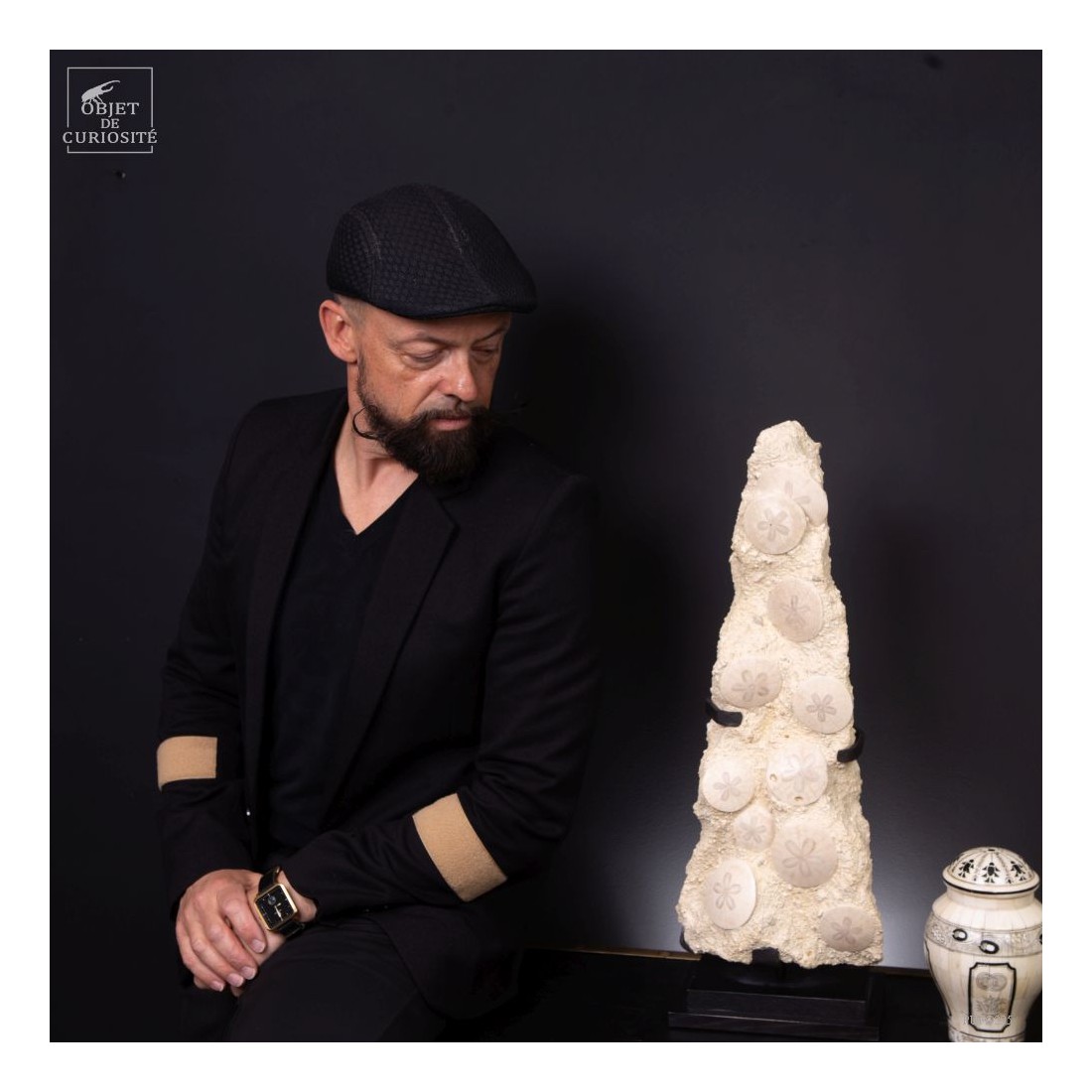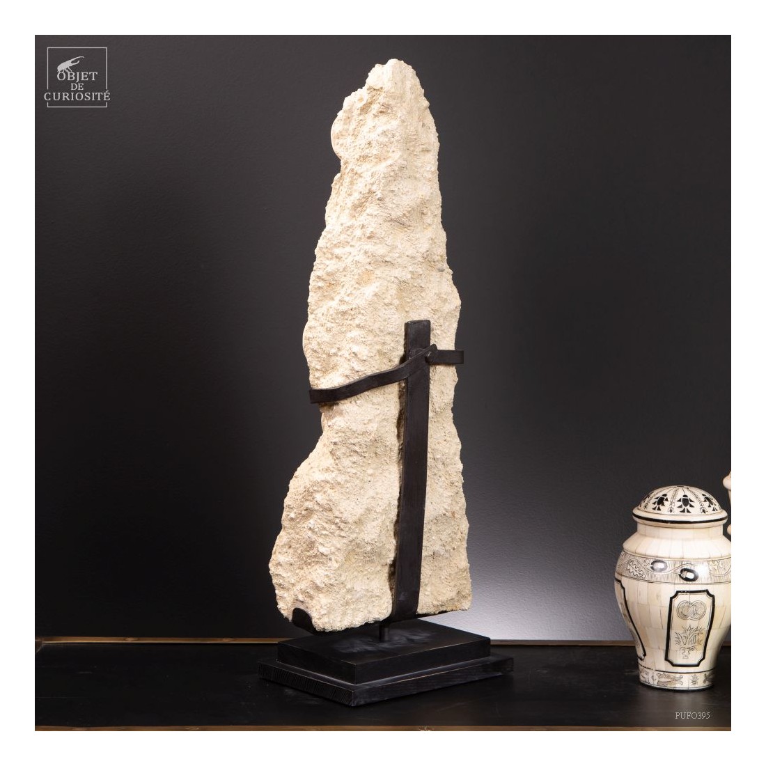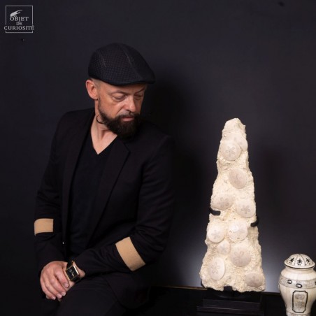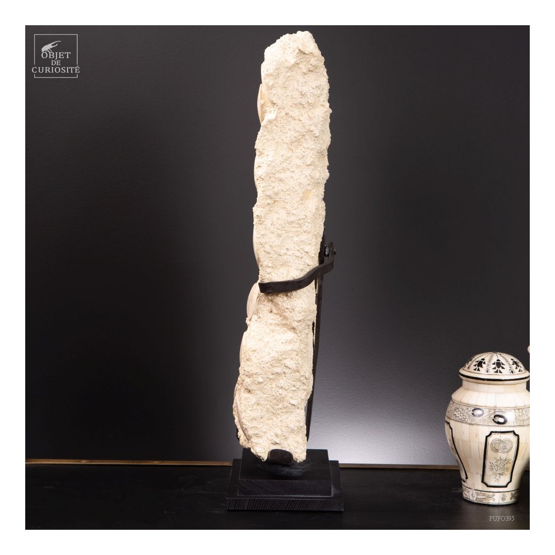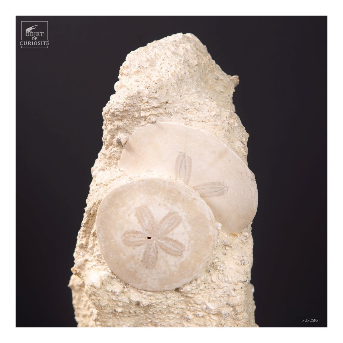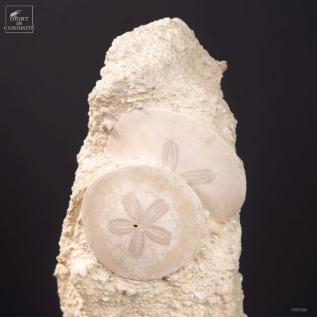 Cette pierre est une véritable photographie d'un fond sous-marin du miocène (-24 à -14 Millions d'années) et a été découverte en France. Ces oursins fossiles plats abondaient à l'époque. Leur espèce est Scutella Faujasi. Ce sont les ancêtres des dol lars des sables (AN273).