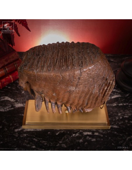 Le fameux Mammouth laineux, Mammuthus Primigenius -12 000 ans. Ce spécimen a été déterré en 2022 sur les rives de la rivière Wistoka en Pologne. Il provient de gravières, donc dépôts laissés par la rivière au cours des millénaires. le mammouth n'a que deux paires de dents à la fois dans la bouche. Il aura 6 paires successives dans toute sa vie. Et c'est bien la dernière molaire imposante d'un adulte.