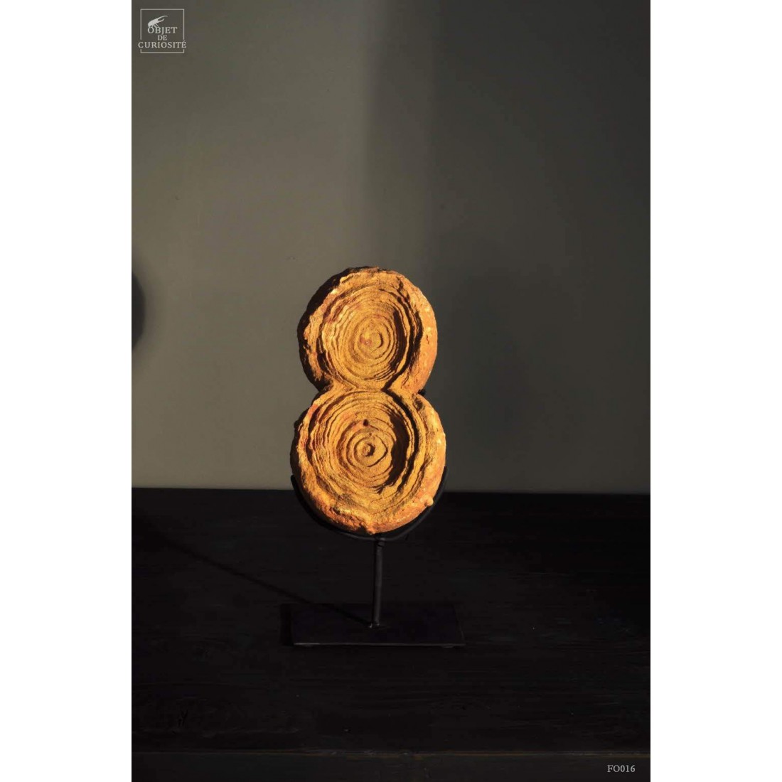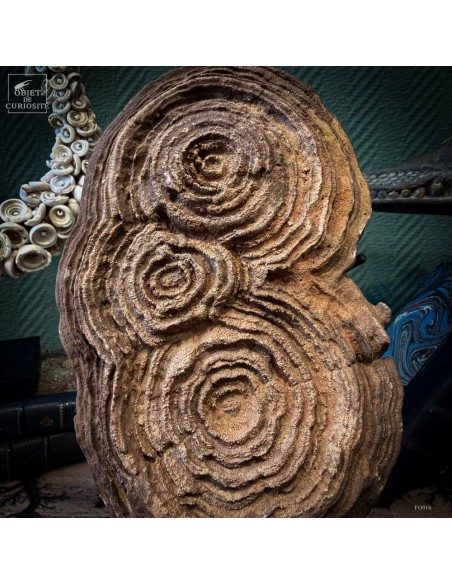 Les premières stromatolithes fossilisées, datent de plus de 3,5 milliards d'années, ce sont les plus vieux fossiles existants sur terre. Elles sont les traces de premières formes de vies bactériennes regroupées en colonies. Ce modèle est présenté sur un support en fer.
