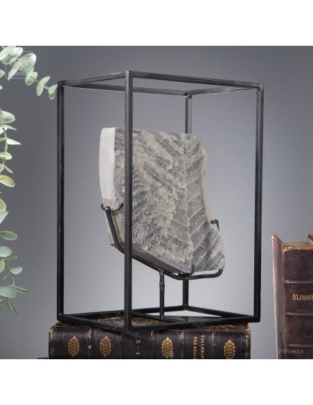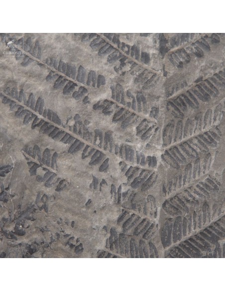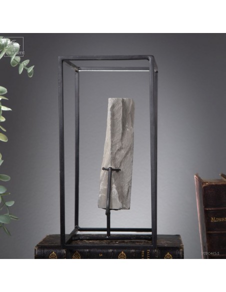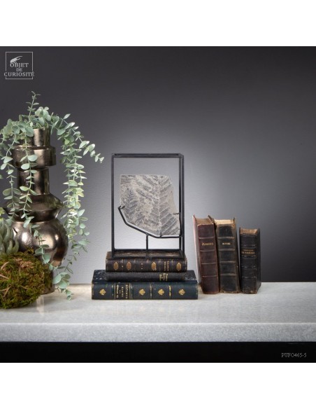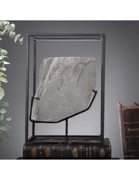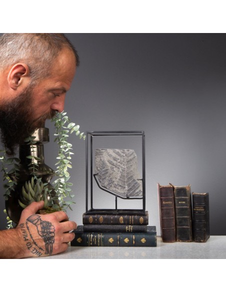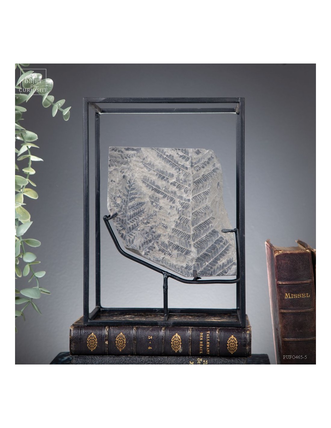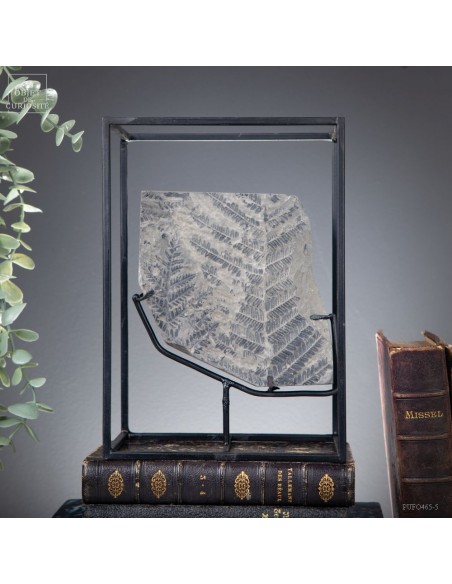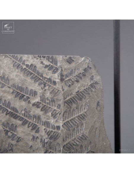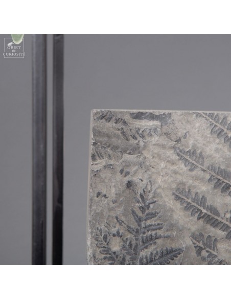 Ce fossile PECOPTERIS POLYMORPHA, remontant au Carbonifère il y a environ 300 millions d'années, a été découvert dans les mines de Montceau-les-Mines, en France. Ces mines, anciennement dédiées à l'extraction de charbon, ont préservé des vestiges exceptionnels de la flore ancienne en raison des conditions géologiques favorables. PECOPTERIS POLYMORPHA appartient à un genre de fougères caractéristiques de cette époque: les fougères arborescentes. Des espèces qui poussaient dans les environnements marécageux. La présentation très contemporaine de cette cage d'acier noir contraste avec cette végétation de 300 Millions d'années.