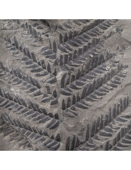 Ce fossile Pecopteris polymorpha, remontant au Carbonifère il y a environ 300 millions d'années, a été découvert dans les mines de Montceau-les-Mines, en France. Ces mines, exploitées pour l'extraction de charbon, ont préservé des vestiges exceptionnels de la flore préhistorique en raison des conditions géologiques favorables. Pecopteris polymorpha appartient à un genre de fougères caractéristiques de cette époque: les fougères arboricoles., qui poussait dans les environnements marécageux. Partie d'une collection des années 70, identifiée à cette époque.