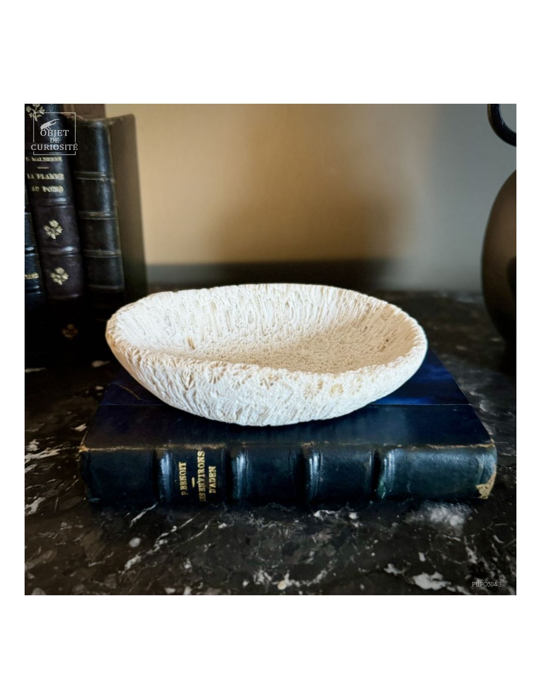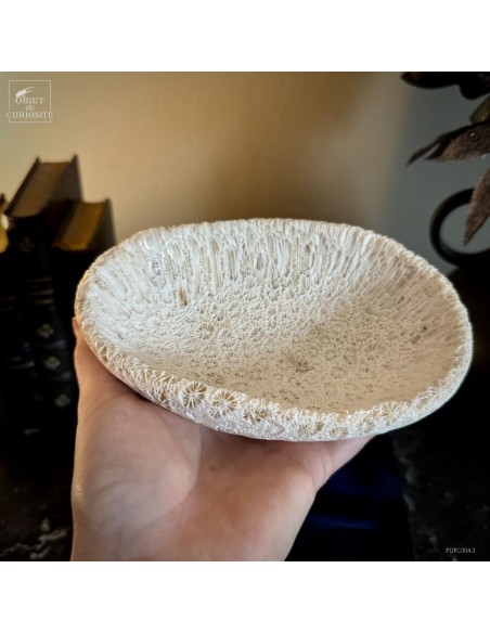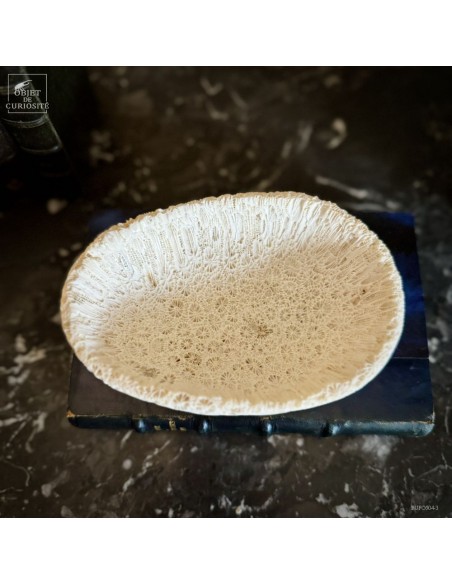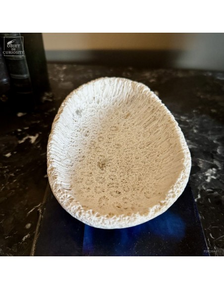 Extrait dans le sud-ouest de Madagascar, ce fossile rare provient d’une zone aujourd’hui terrestre qui fut autrefois un fond marin, avant la dernière glaciation. Prélevé en zone terrestre, ce corail fossilisé n’est pas soumis à la CITES.