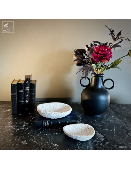 Des artisans locaux les extraient puis les taillent manuellement, révélant la structure minérale figée dans la pierre. Cette coupe décorative fossile a été façonnée près de Morombe par une artisane Vezo. Chaque objet de curiosité naturelle est unique, portant la trace de la main qui l’a révélé.