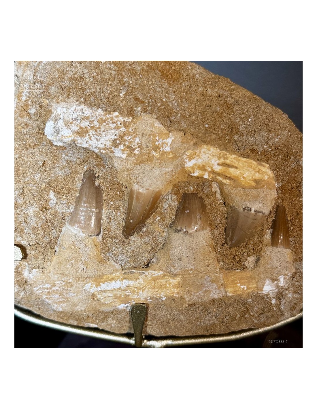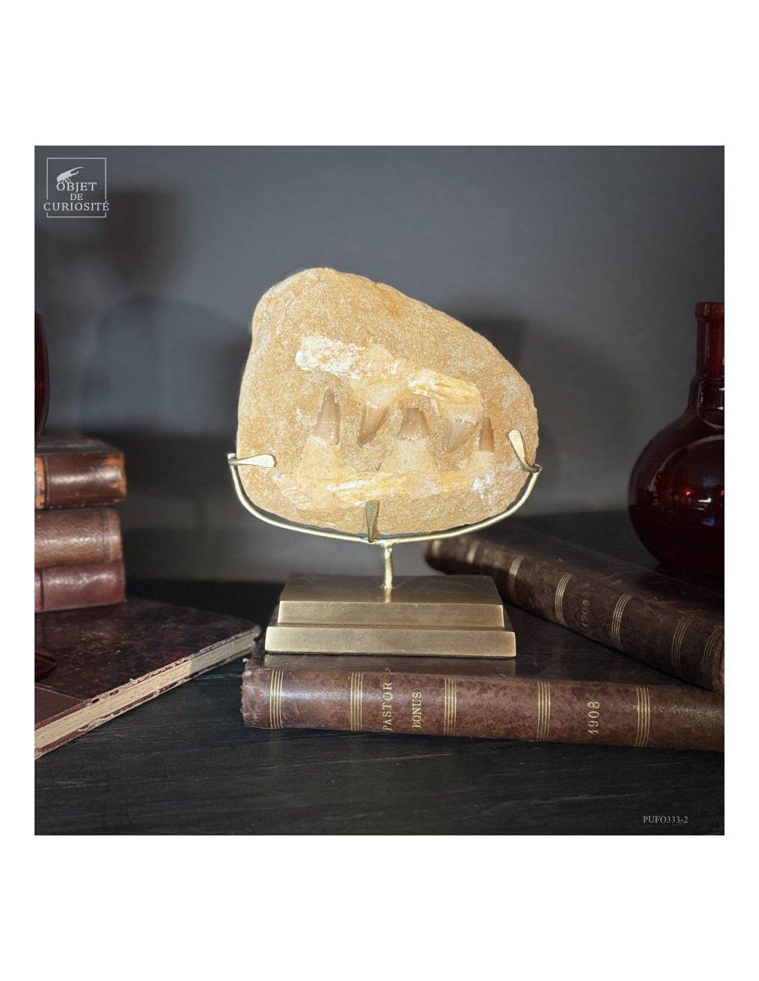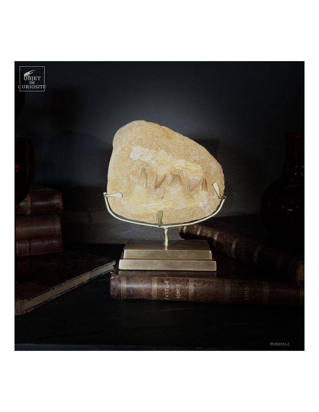 La mâchoire a été reconstituée dans sa gangue de phosphate, selon la pratique courante pour ce type de spécimens issus des couches fossilifères de la région. Les dents, bien visibles, rappellent la puissance de ce prédateur qui régnait sur les mers avant l’extinction des dinosaures.