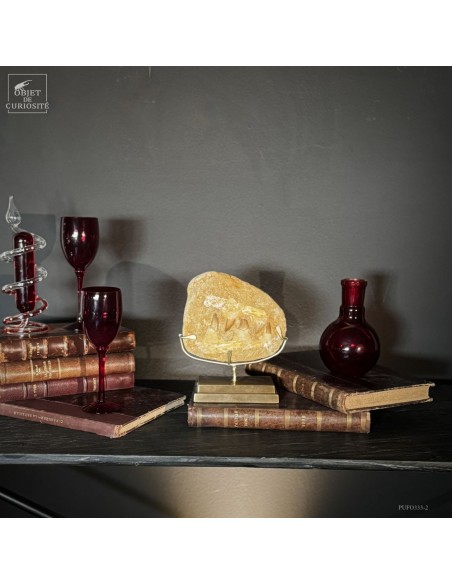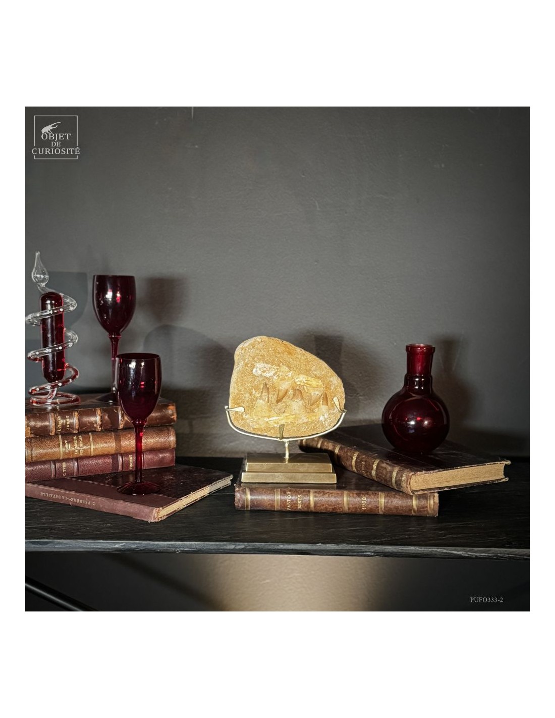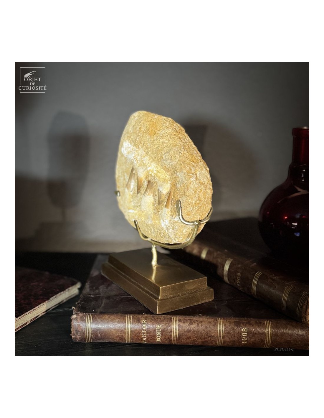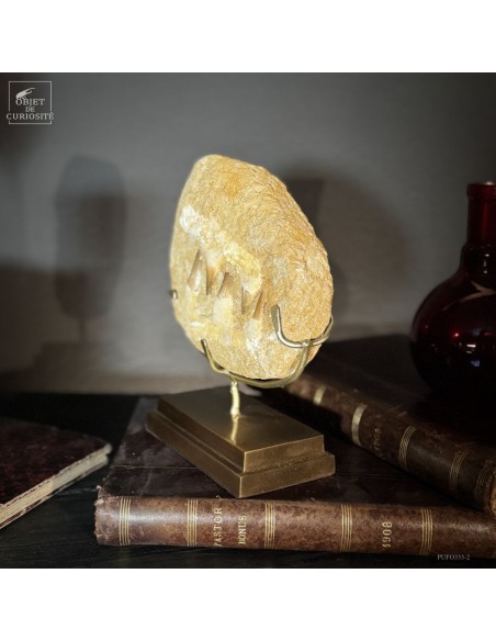 Présentée sur une base en laiton, cette curiosité naturelle relie la rigueur de la paléontologie à l’esthétique des cabinets de curiosités.