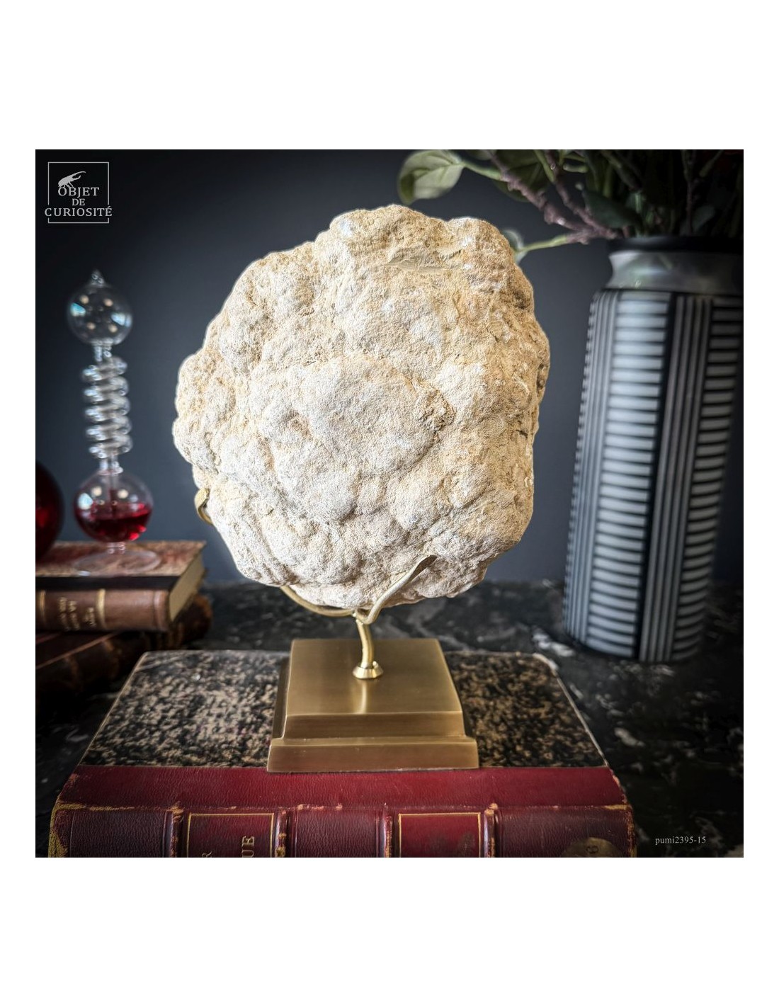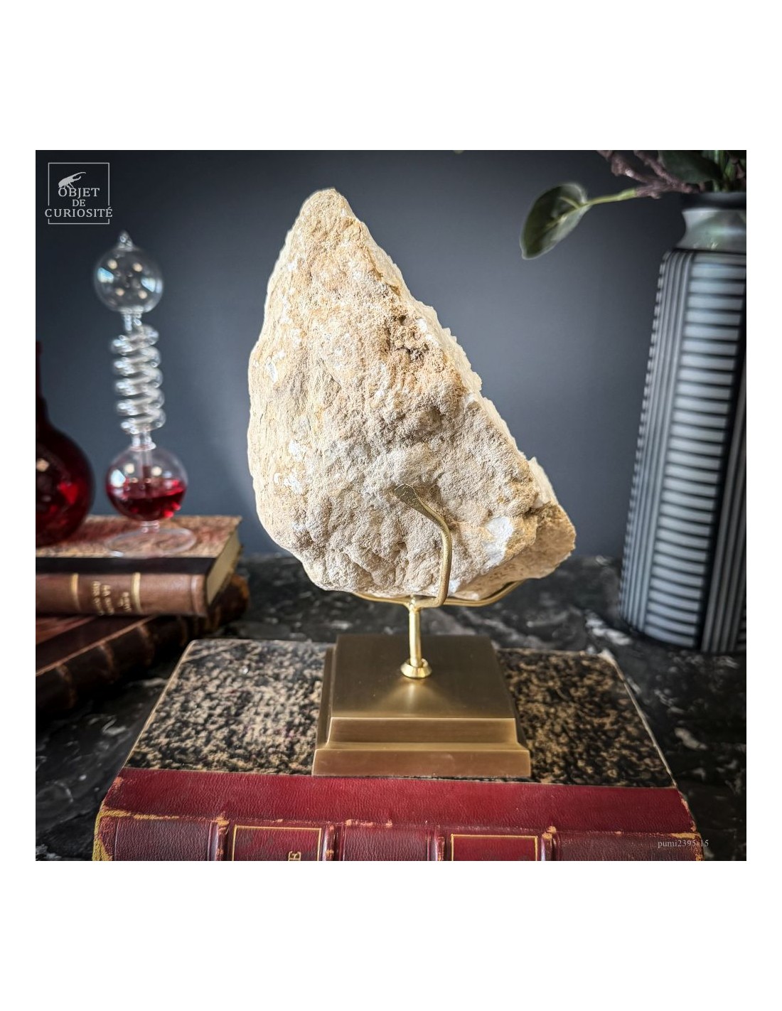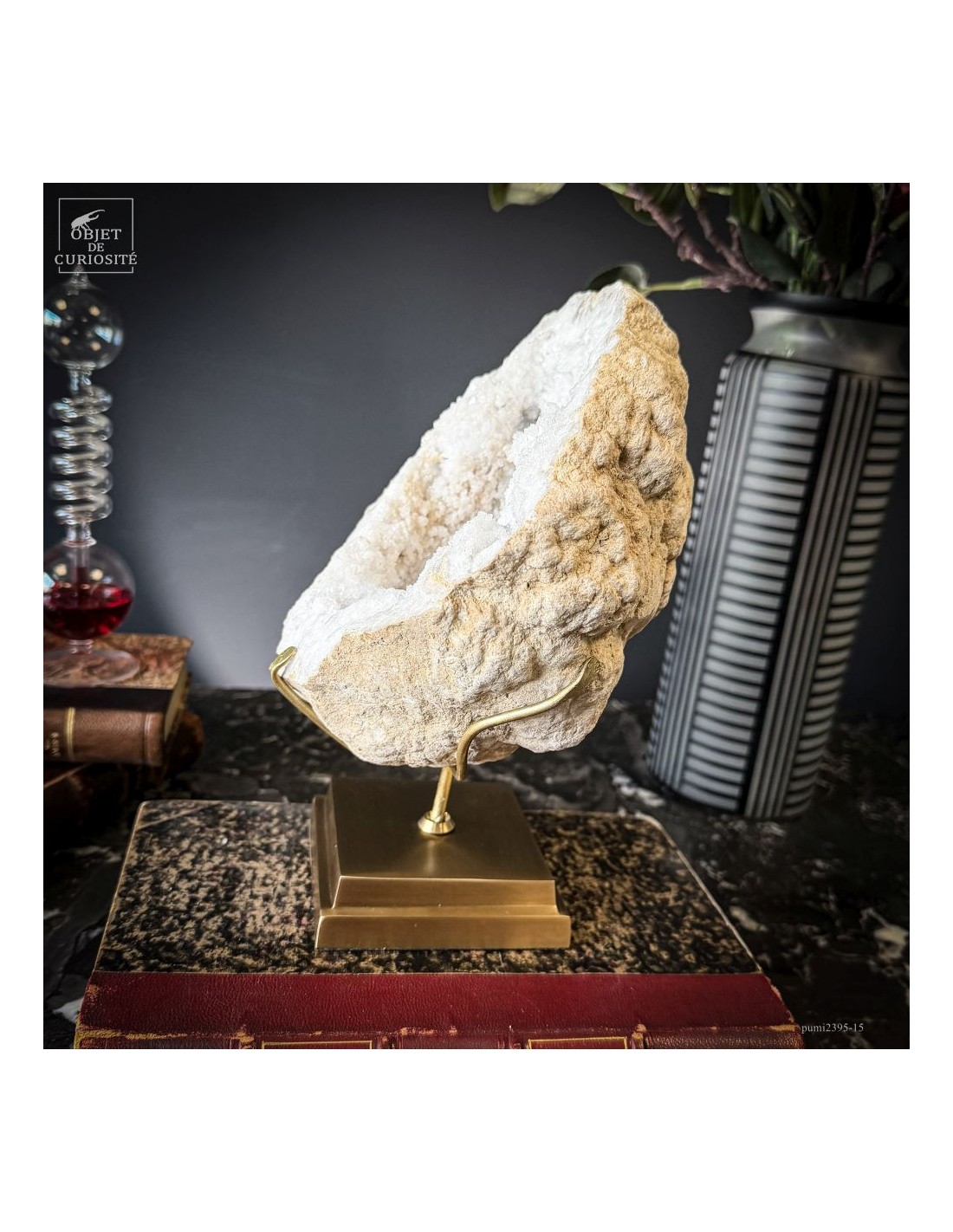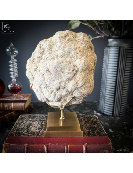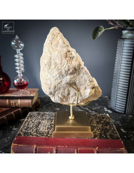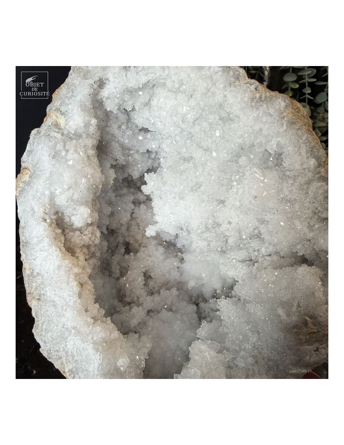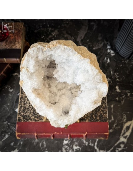Ce minéral est une géode de Quartz blanc de l'extrême sud Marocain - près de Laâyoune - et qui a l'air d'une simple boule de pierre naturelle. L'intérieur est une vraie cavité de cristaux naturels. Comme celle-ci est profonde, on dirait presque de la neige. Un contraste saisissant avec l'extérieur très simple de ce minéral.