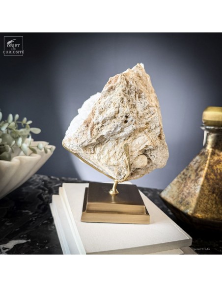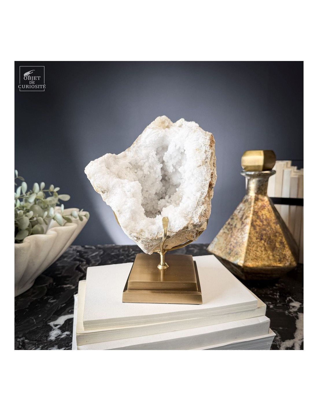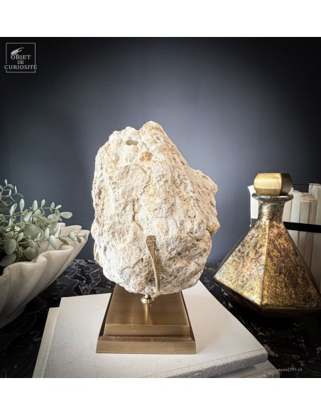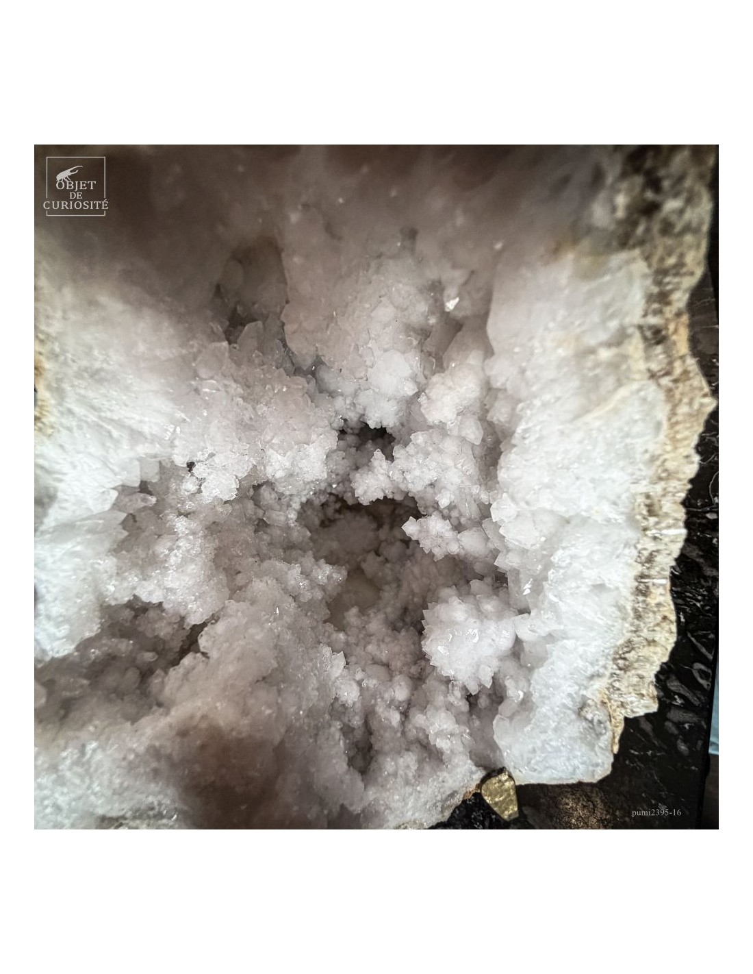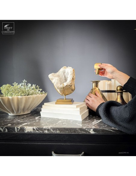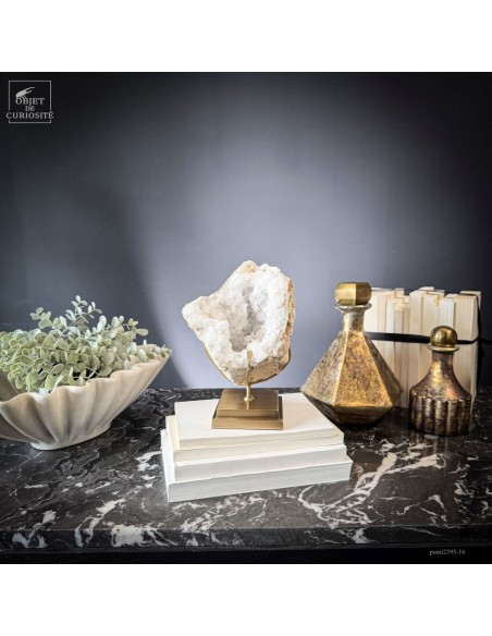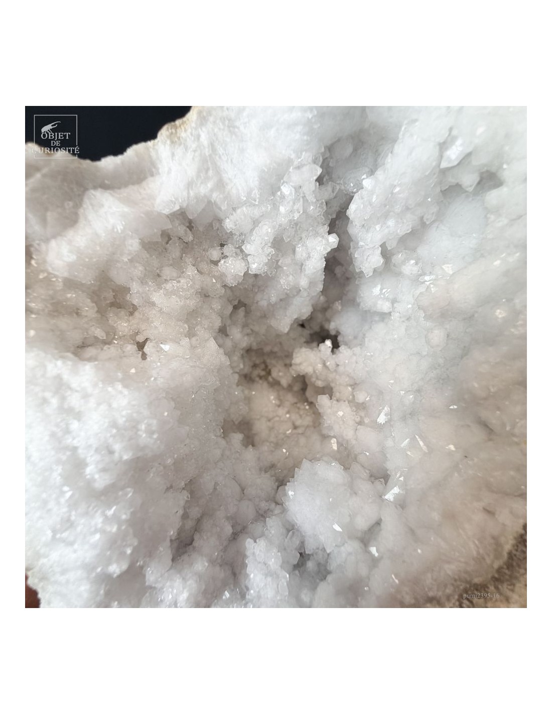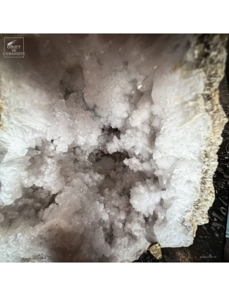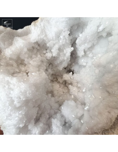 Ce minéral est une géode de Quartz blanc de l'extrême sud Marocain - près de Laâyoune - et qui a l'air d'une simple boule de pierre naturelle. L'intérieur est une vraie cavité de cristaux naturels. Comme celle-ci est profonde, on voit des macles de cristaux (groupe de cristaux partant dans tous les sens, mais avec la même racine). Une blancheur éclatante.